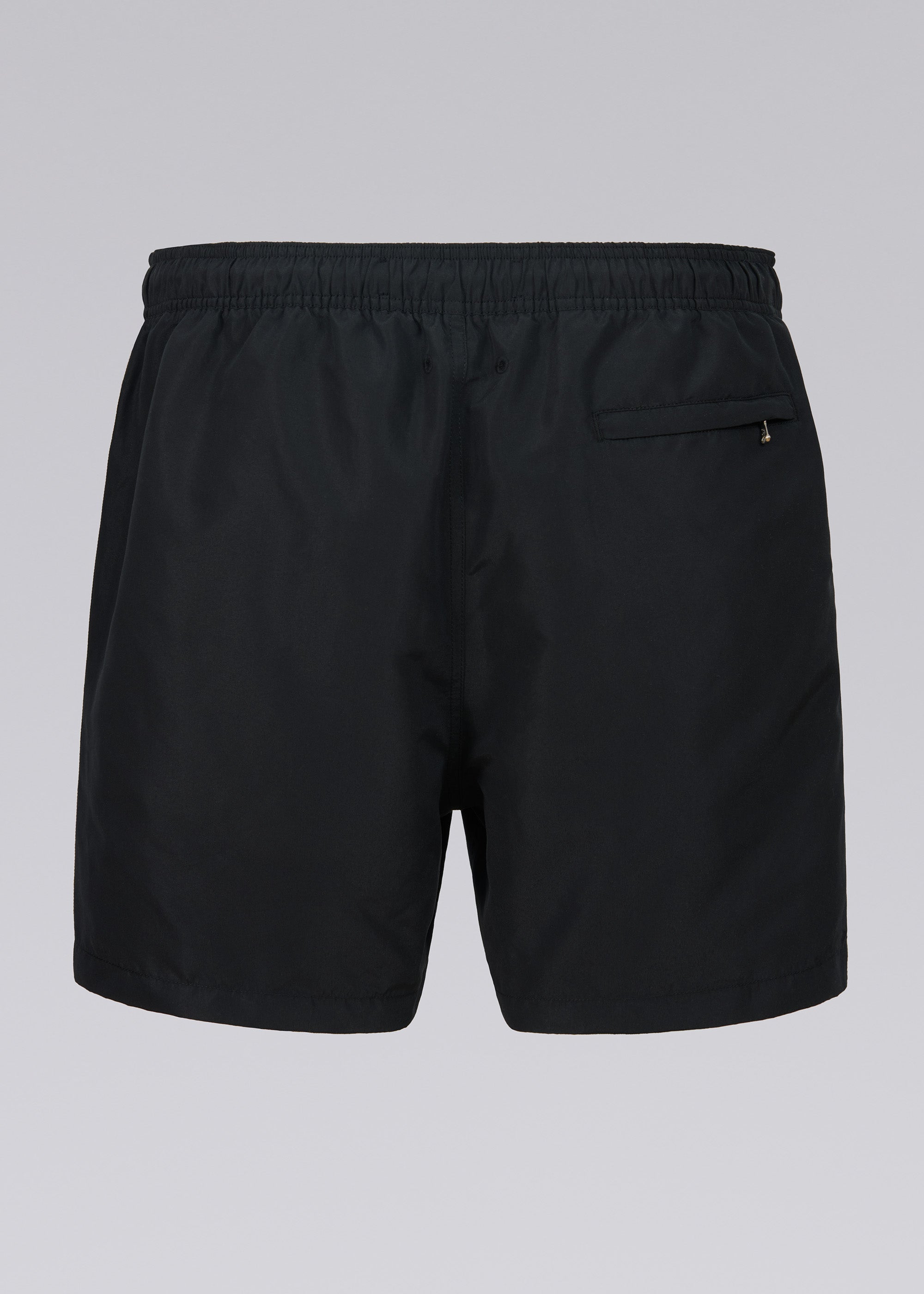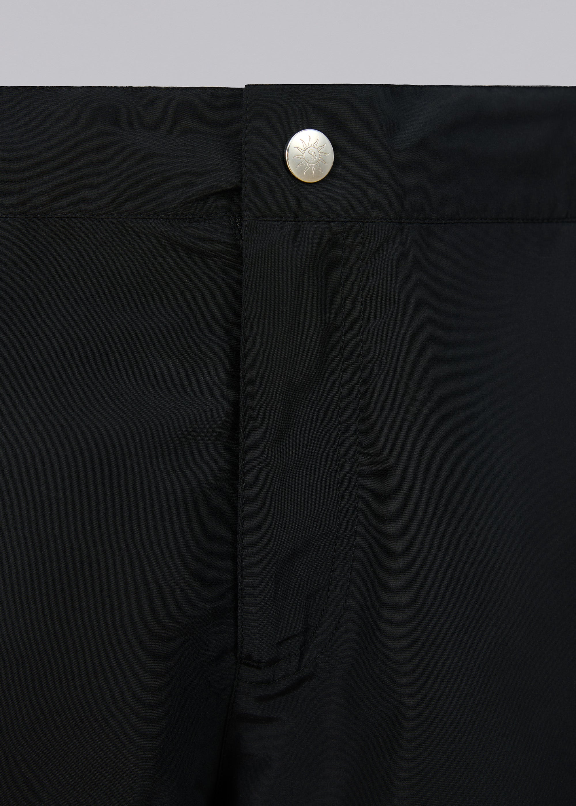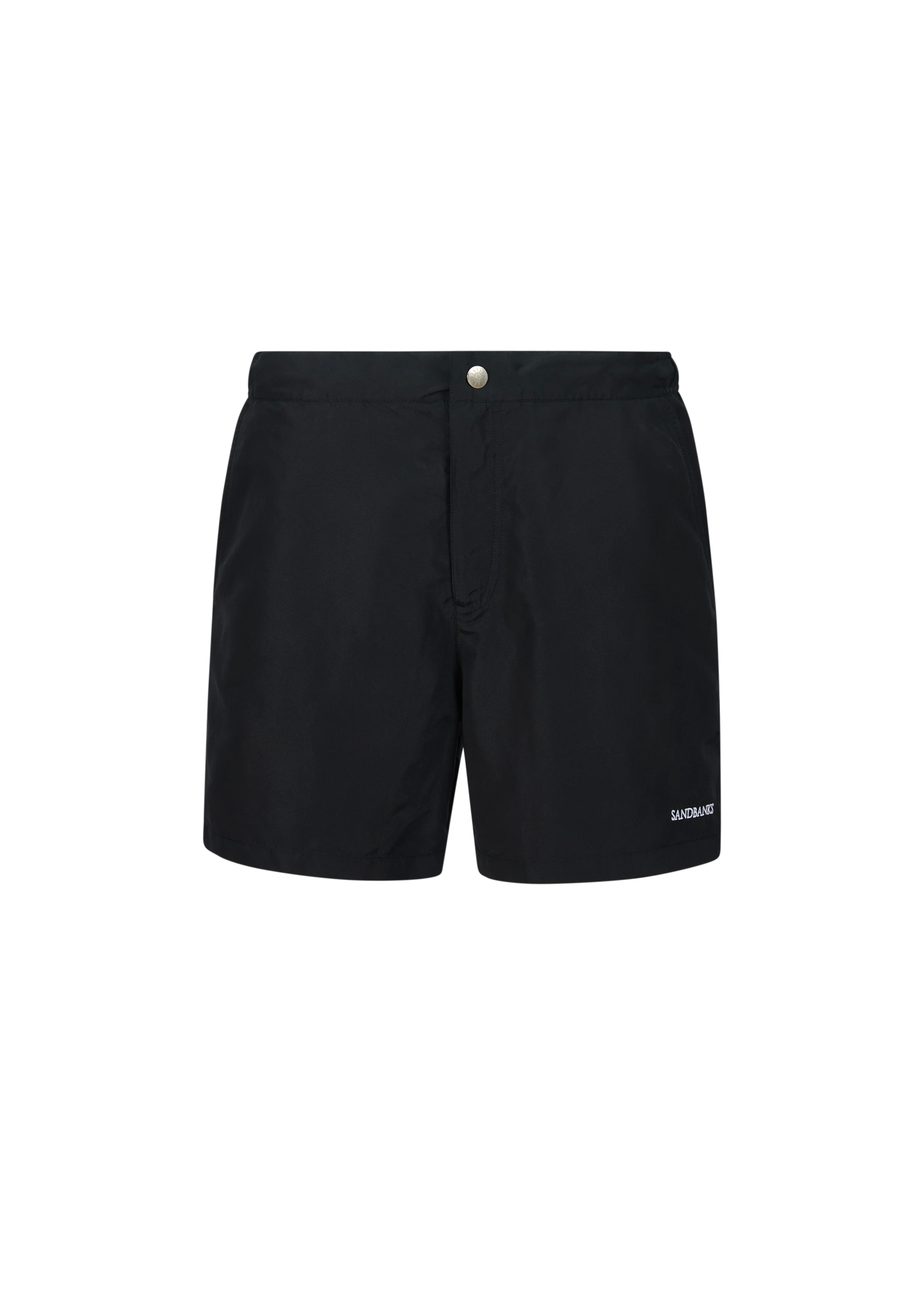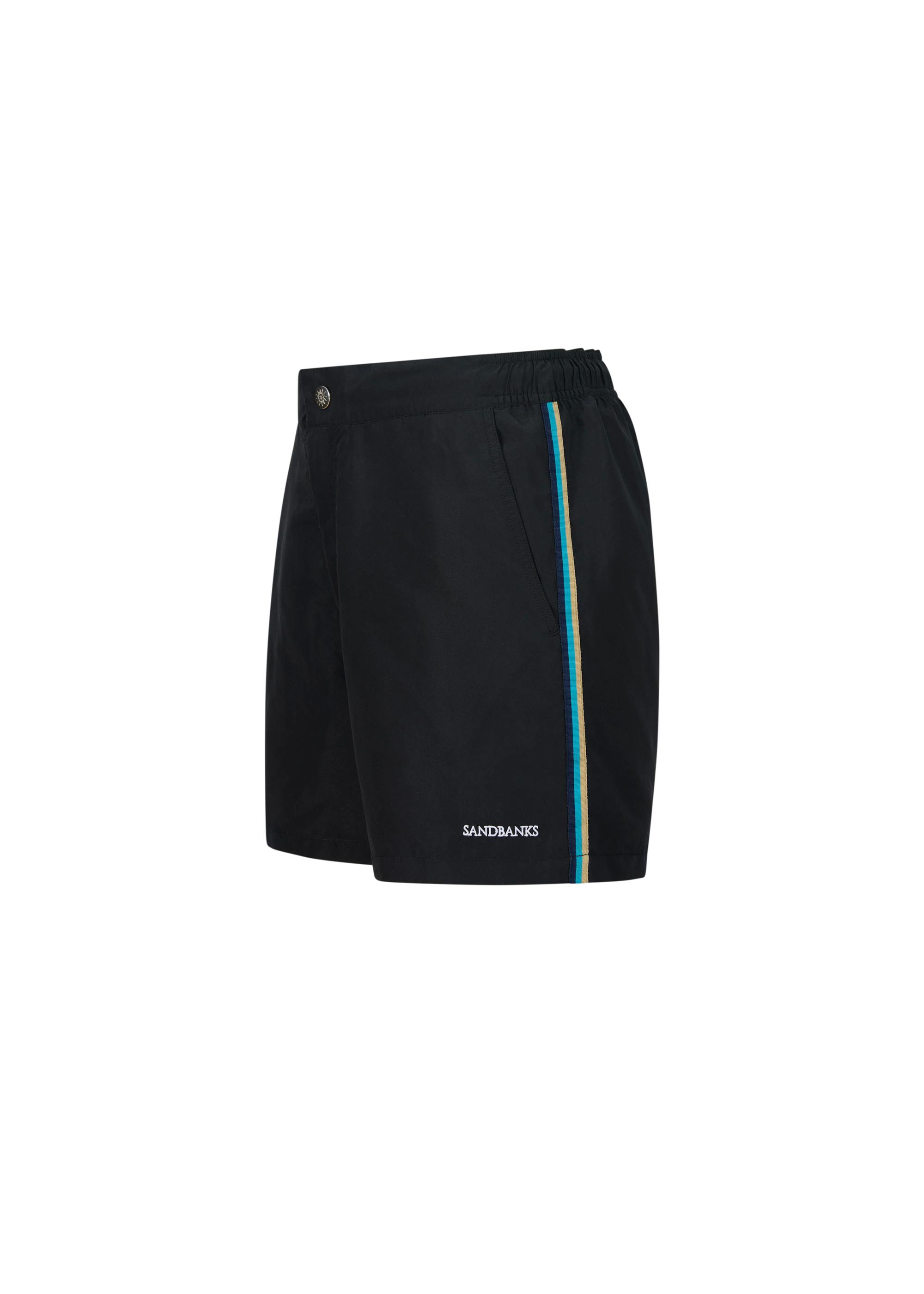 The Sandbanks side stripe shorts in black, made from a luxurious emerised fabric using 100% recycled polyester yarns and features an embroidered badge logo, elasticated waistband with drawstring cords, brushed gun metal cord ends with laser engraved Sandbanks logo, side pockets and rear zip pocket with laser engraved SB zip puller.