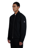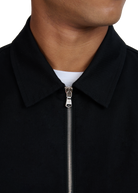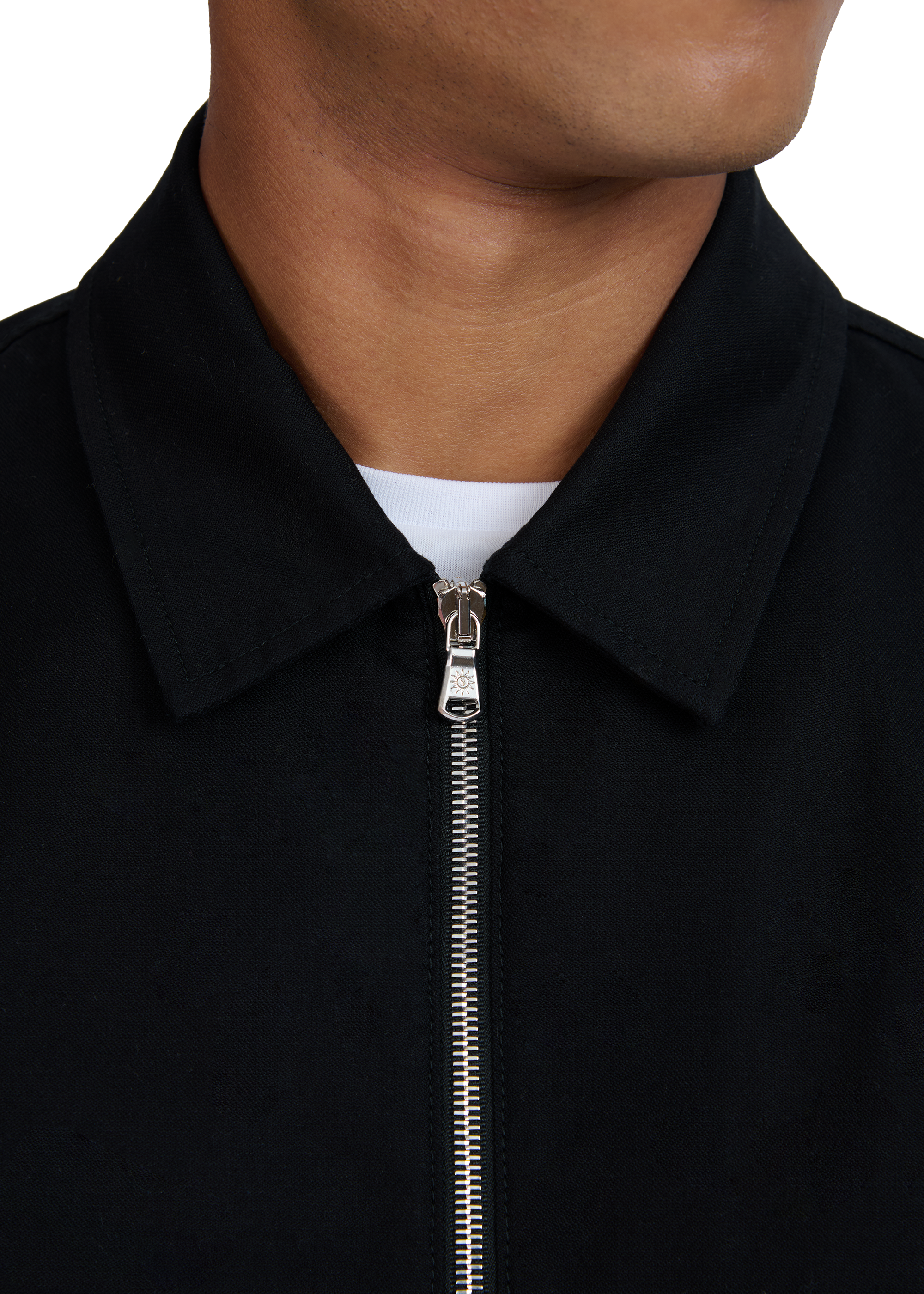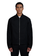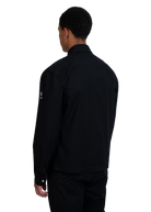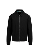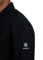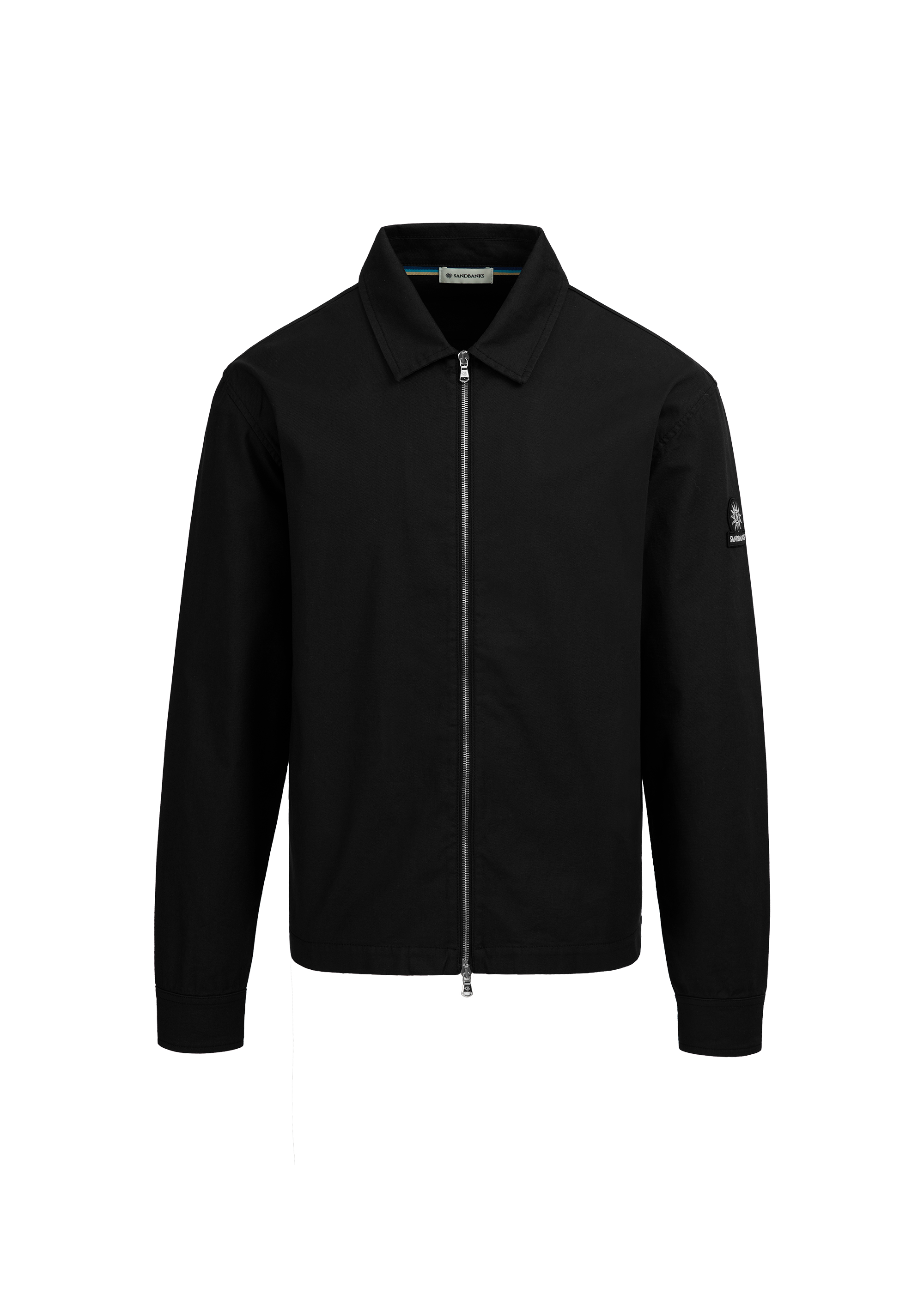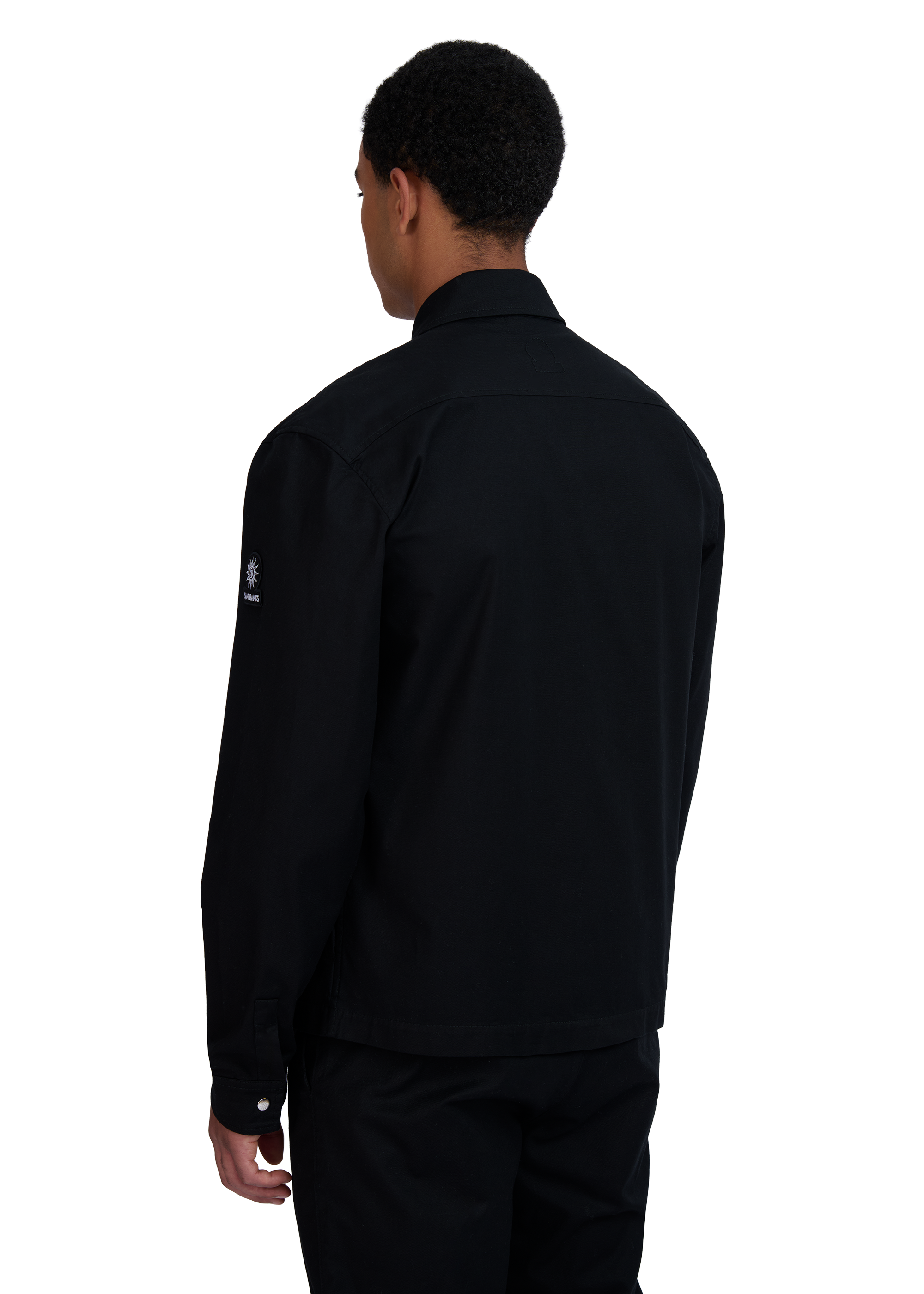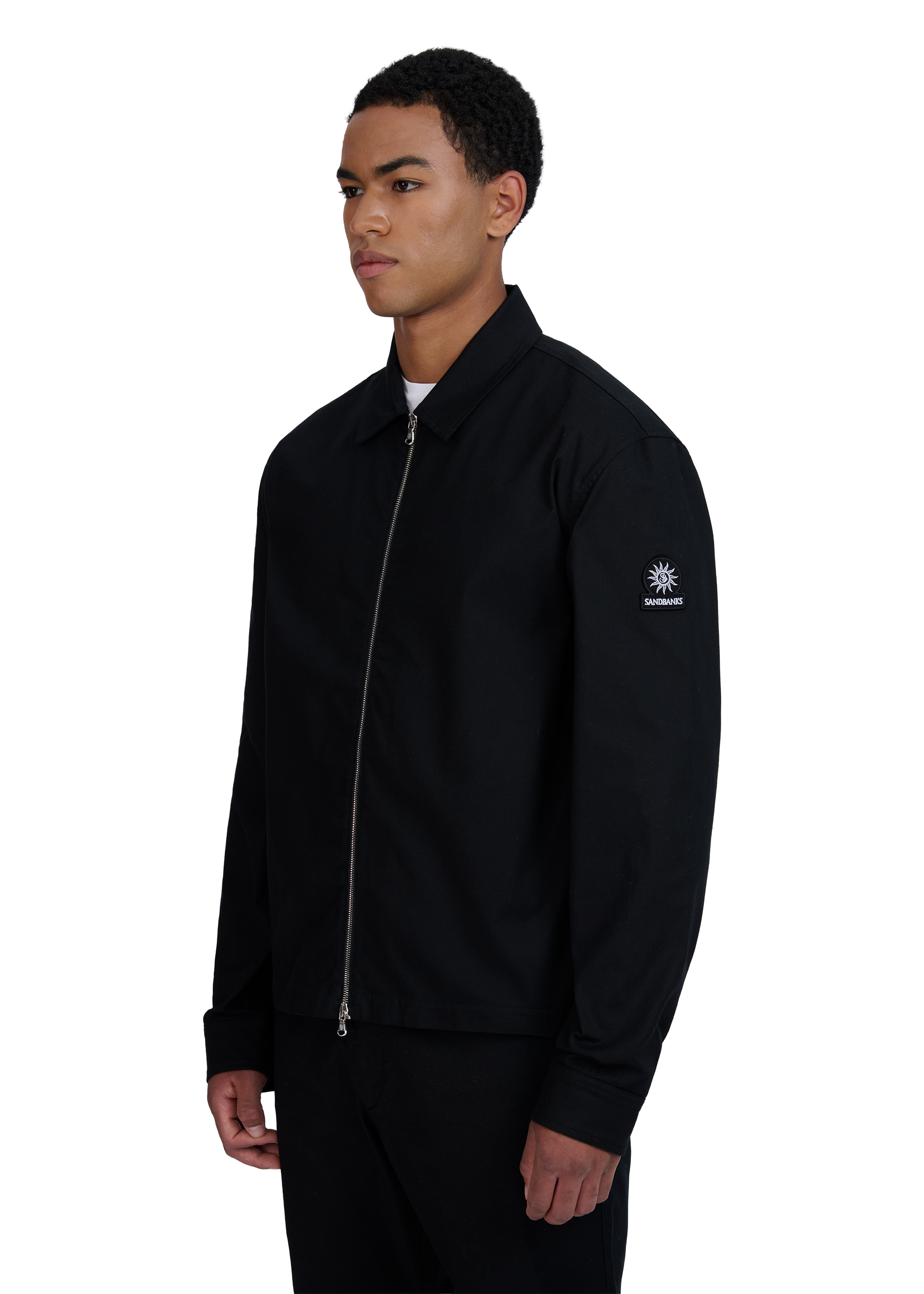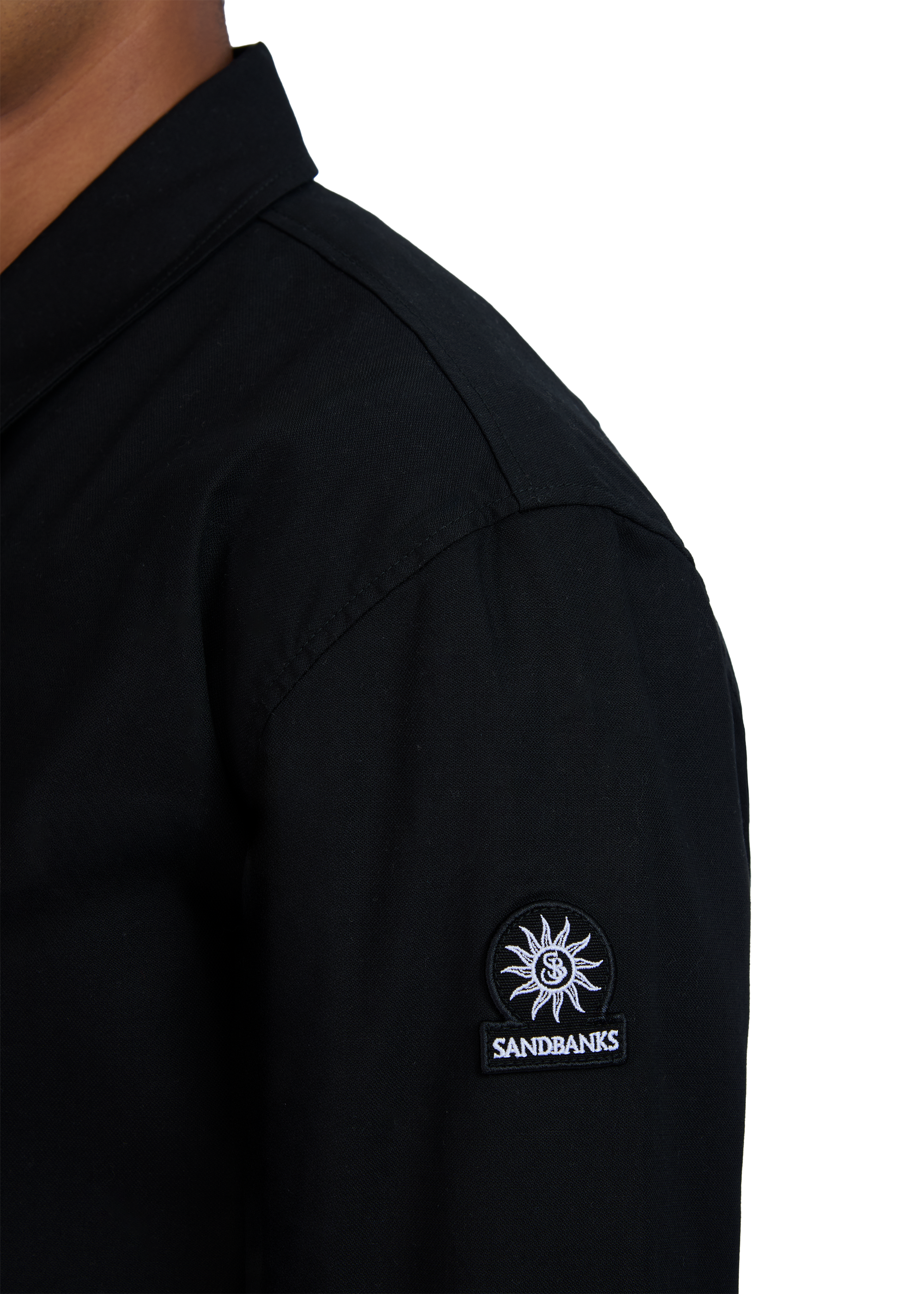 Sandbanks Men’s Gabardine Zip Overshirt in black, crafted from organic cotton stretch gabardine for a smooth, durable finish. This overshirt features a clean modern silhouette with a full centre-front metal zip, side entry snap close pockets, and a structured collar. Finished with signature Sandbanks detailing, including the embroidered sleeve badge, tri-colour neck binding, and an embroidered logo at the back neck.