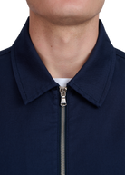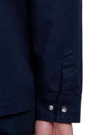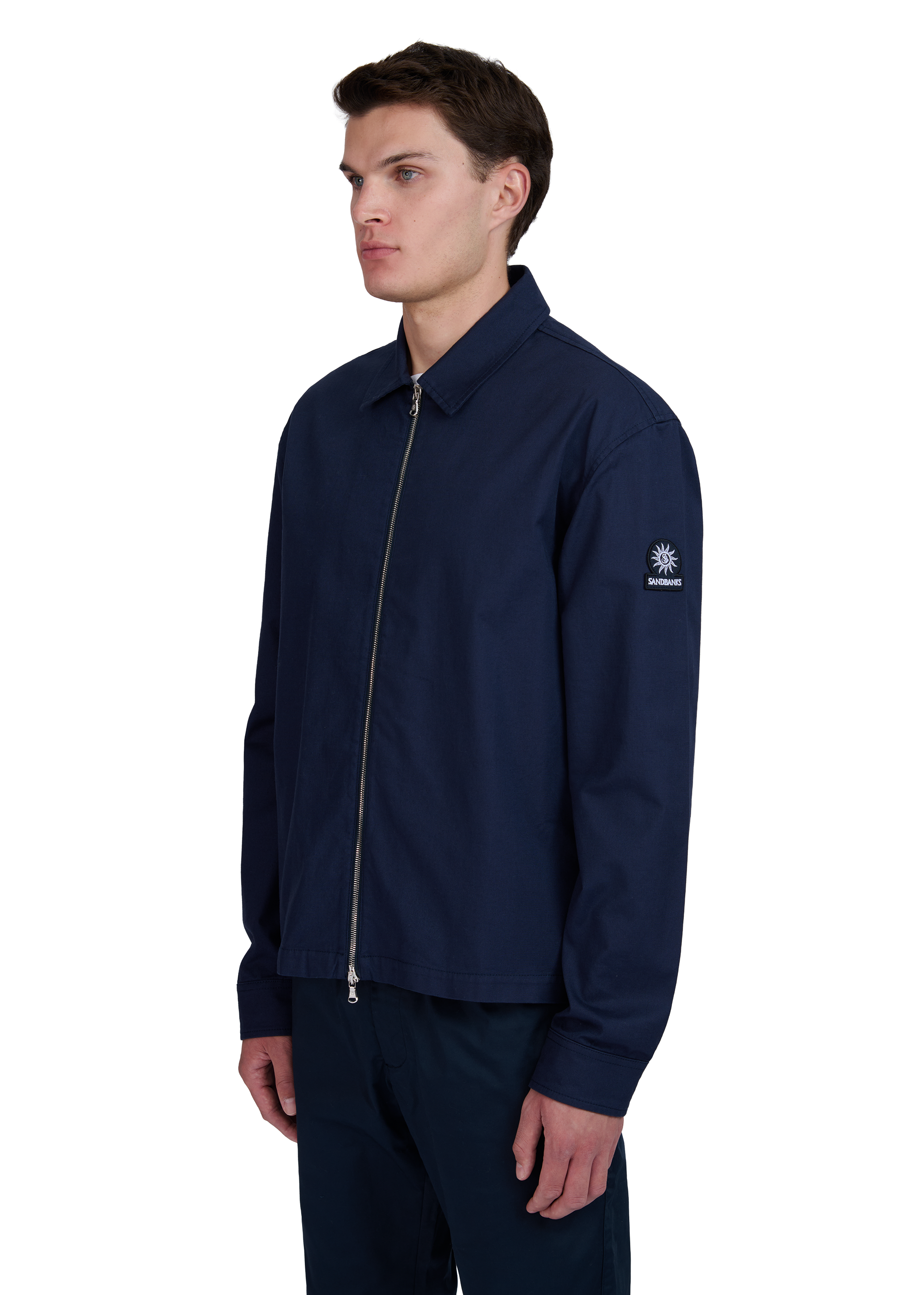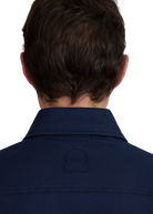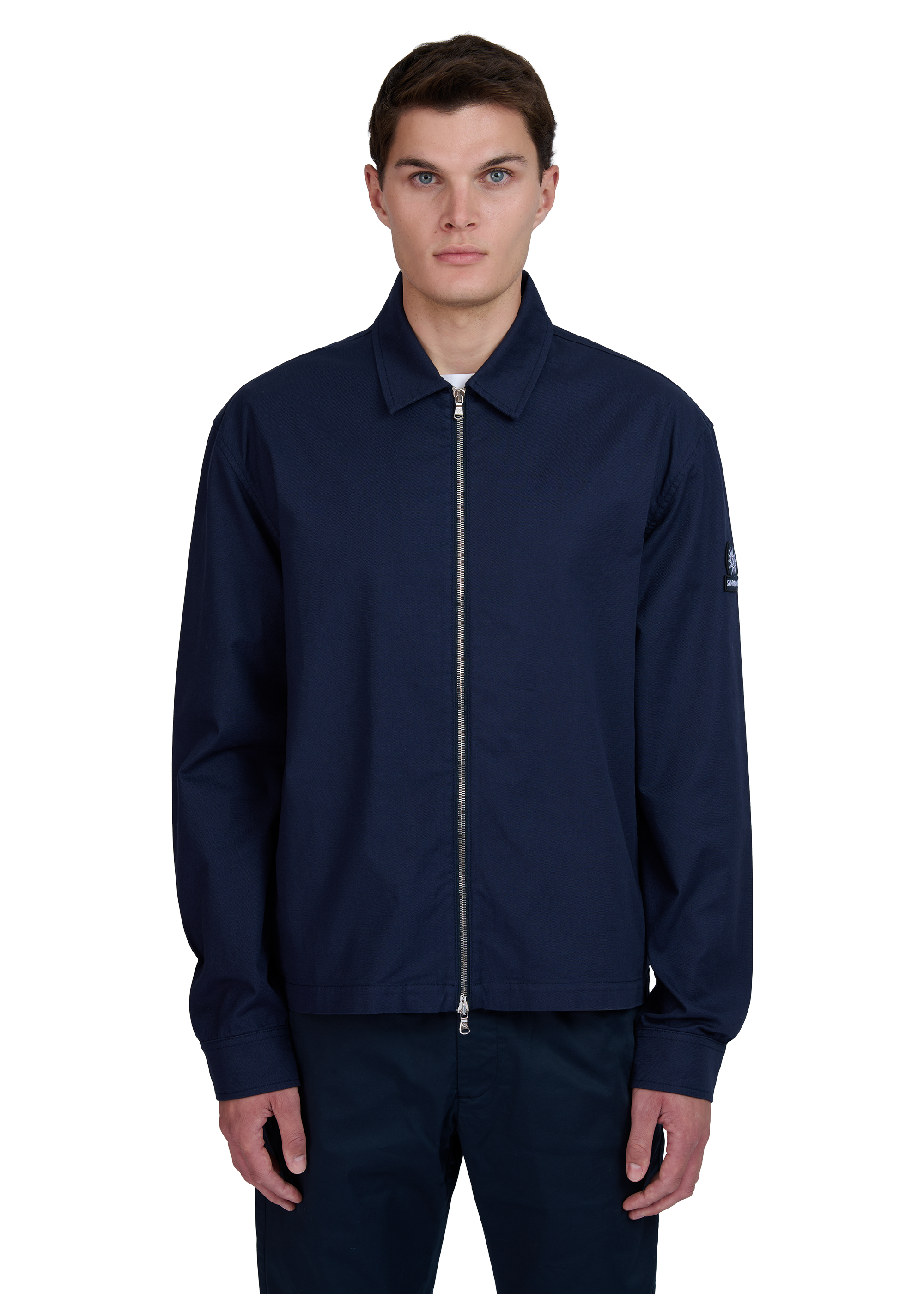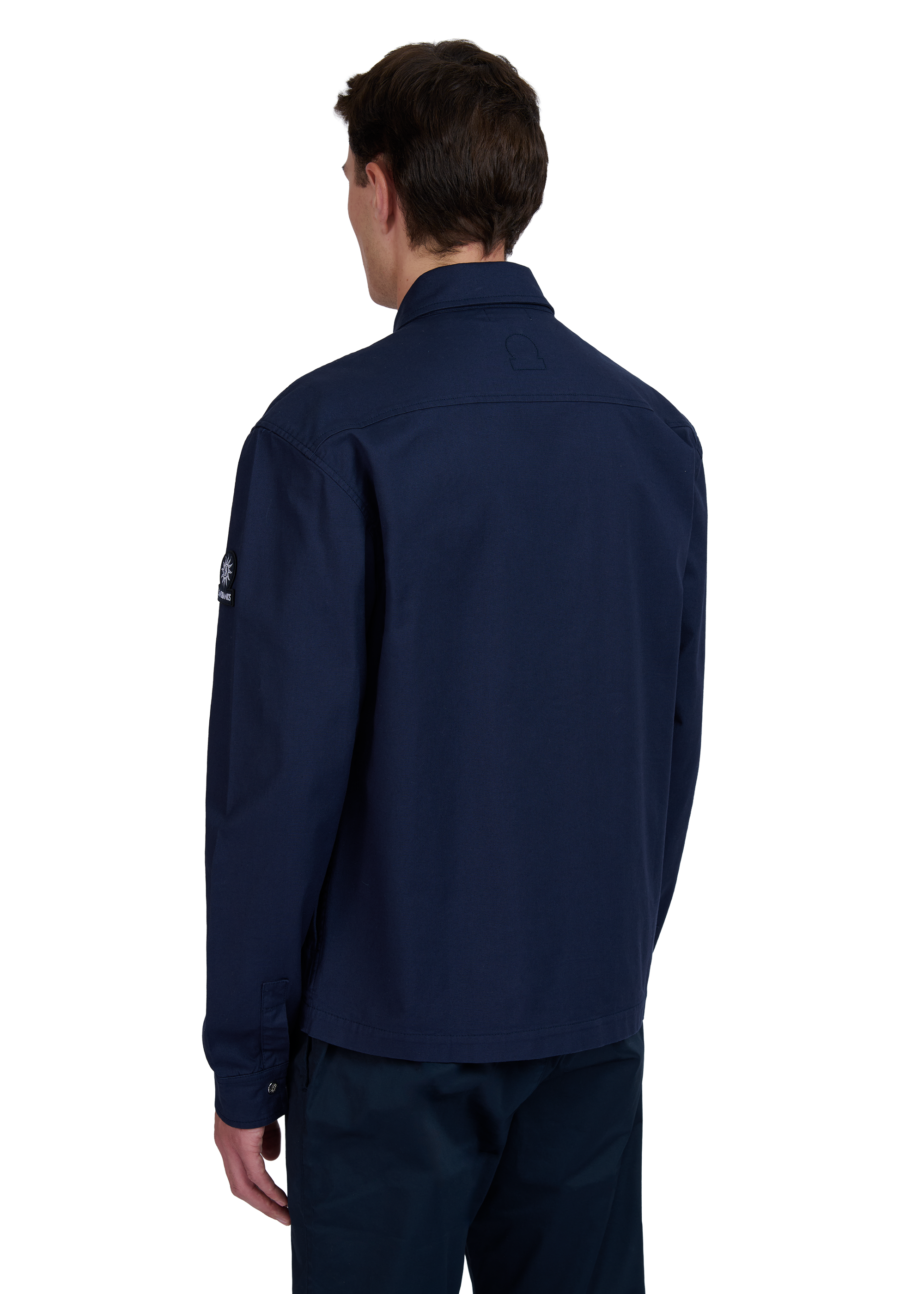 Sandbanks Men’s Gabardine Zip Overshirt in navy, crafted from organic cotton stretch gabardine for a smooth, durable finish. This overshirt features a clean modern silhouette with a full centre-front metal zip, side entry snap close pockets, and a structured collar. Finished with signature Sandbanks detailing, including the embroidered sleeve badge, tri-colour neck binding, and an embroidered logo at the back neck.
