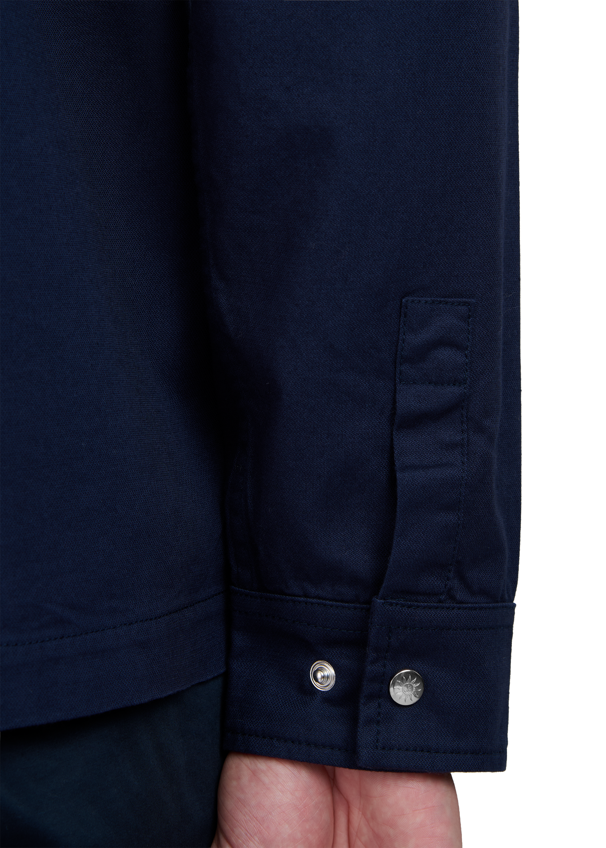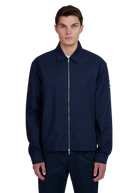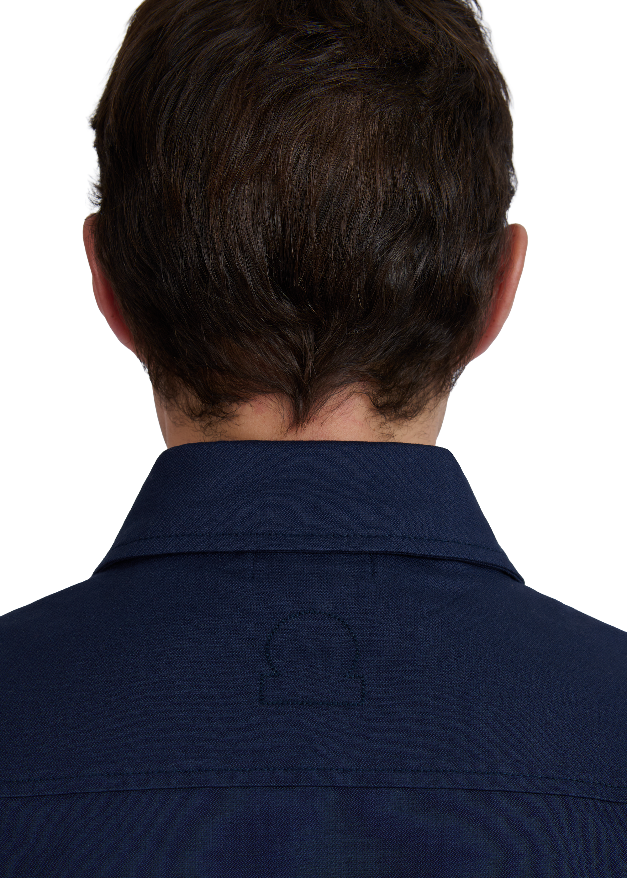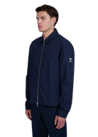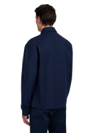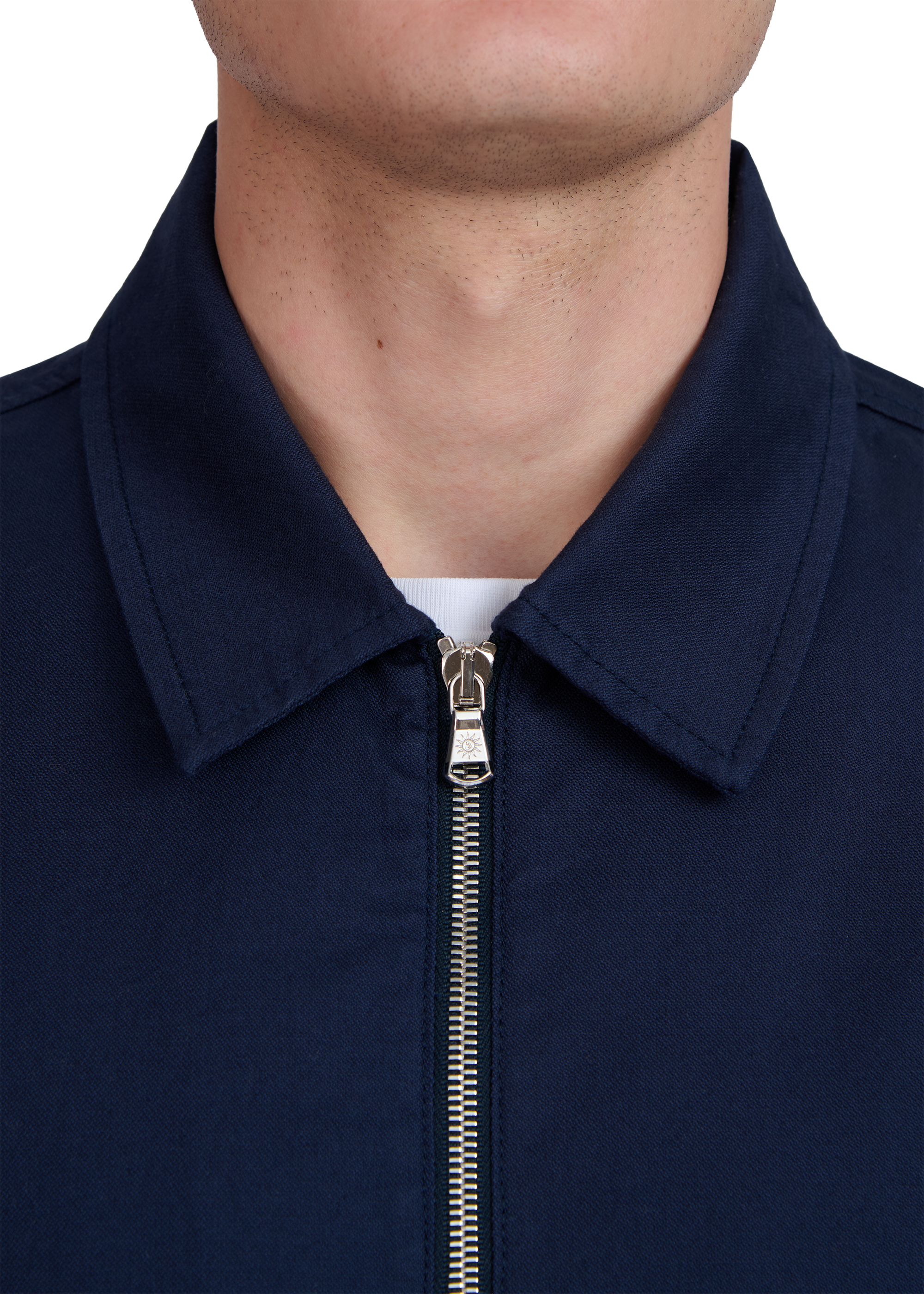 Sandbanks Men’s Gabardine Zip Overshirt in navy, crafted from organic cotton stretch gabardine for a smooth, durable finish. This overshirt features a clean modern silhouette with a full centre-front metal zip, side entry snap close pockets, and a structured collar. Finished with signature Sandbanks detailing, including the embroidered sleeve badge, tri-colour neck binding, and an embroidered logo at the back neck.