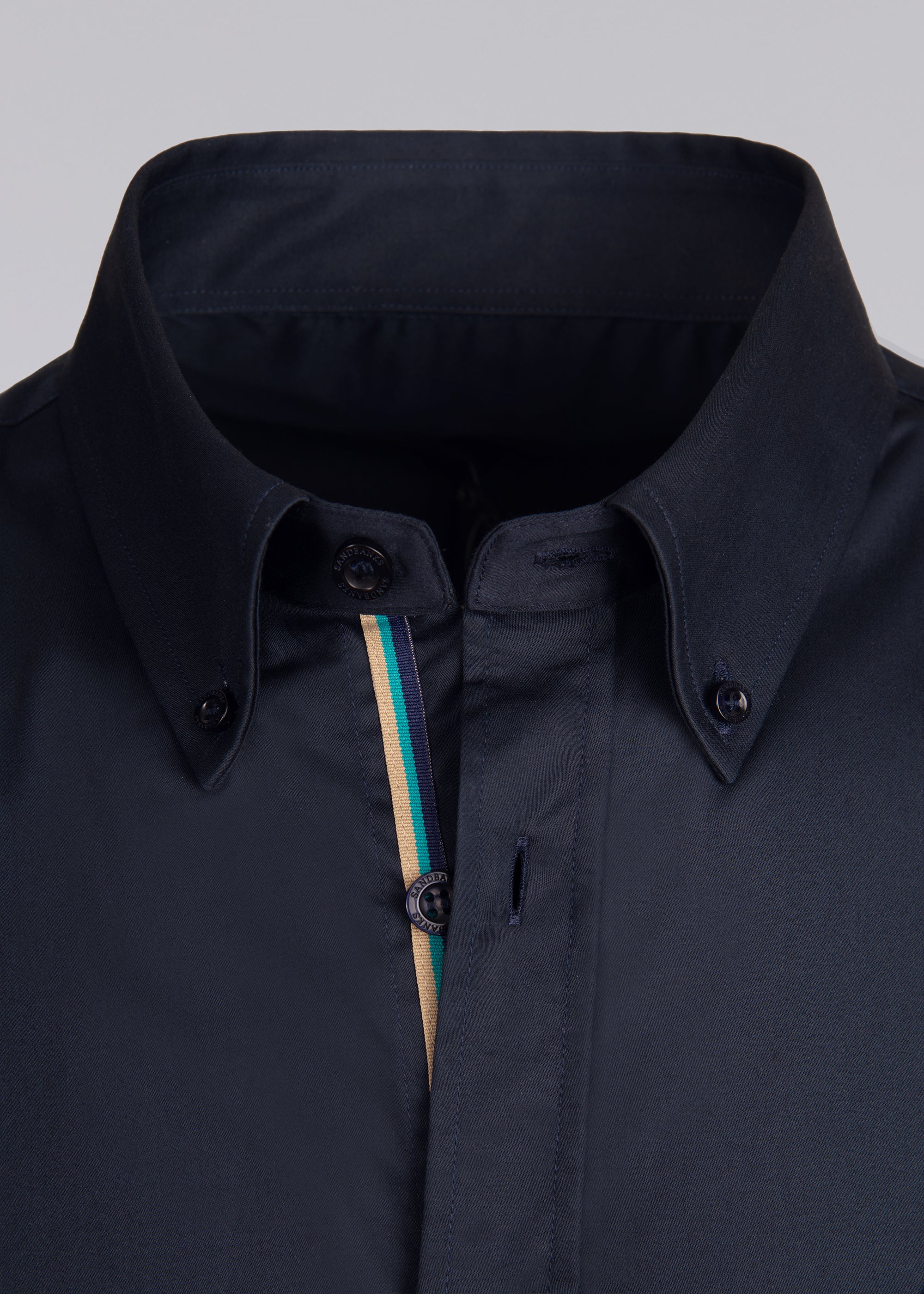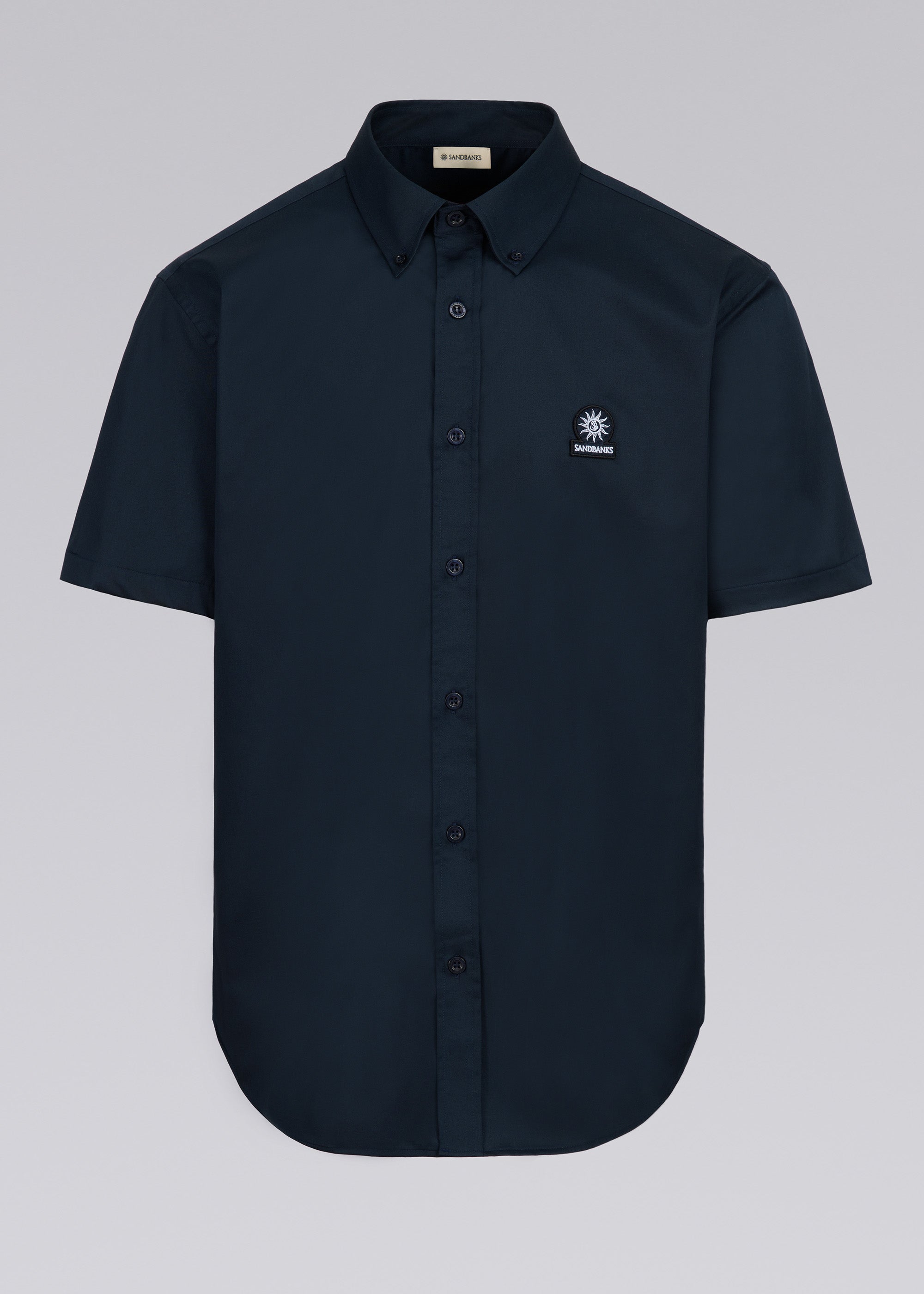 Sandbanks men's short sleeve shirt in navy, made from a cotton poplin with stretch. This men's short sleeved shirt features a Sandbanks signature tri-colour taped placket that shows a flash of colour when undone, button close placket, button down collar and chest embroidered badge.