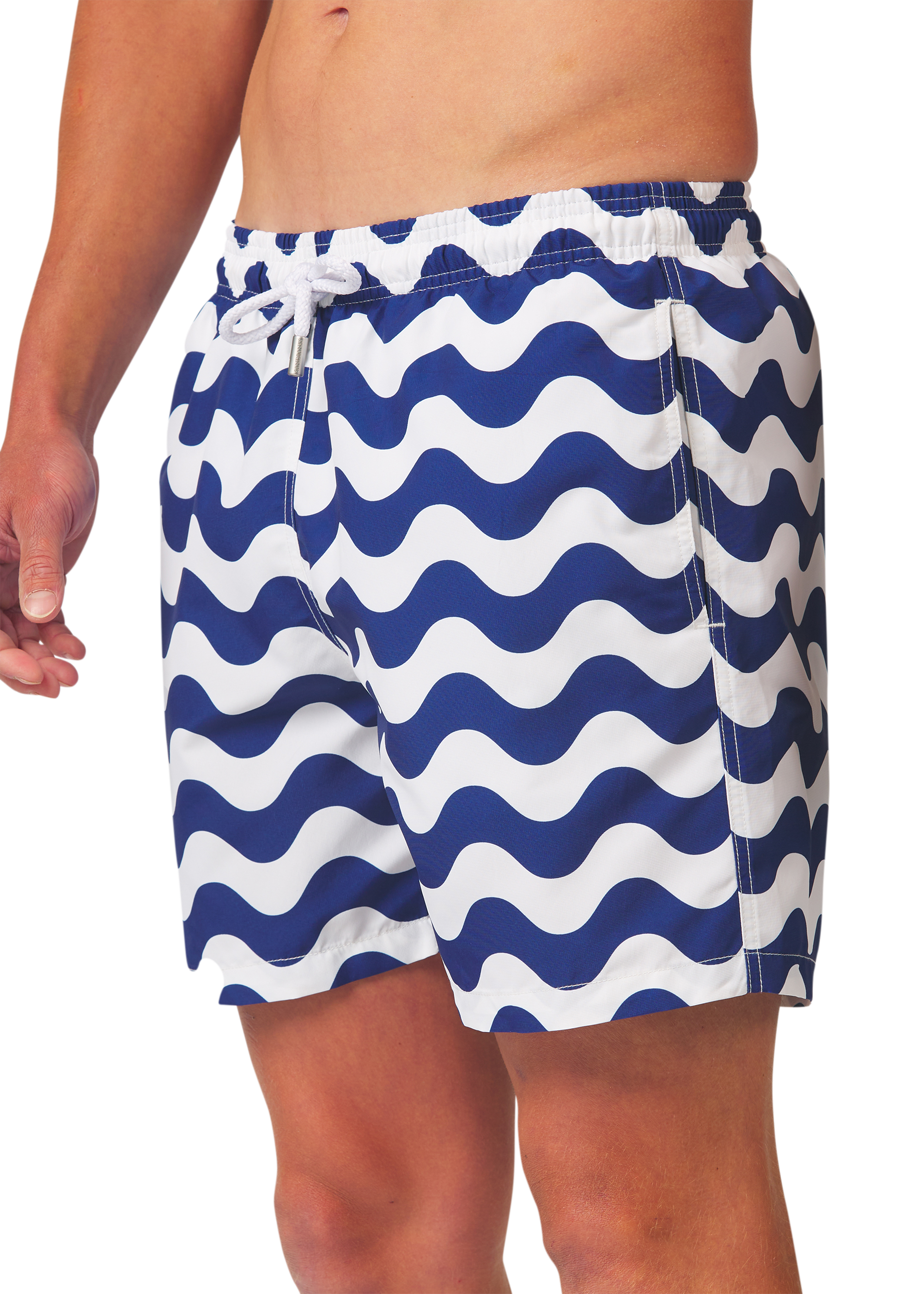 Sandbanks geometric waves swim shorts in navy blue and white. These shorts feature a repeat wave pattern, an elasticated waistband with drawstring cords, brushed gun metal cord ends with a laser-engraved Sandbanks logo, side pockets, and a rear Velcro pocket with a tricolour tab and rubber badge logo.