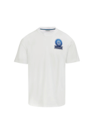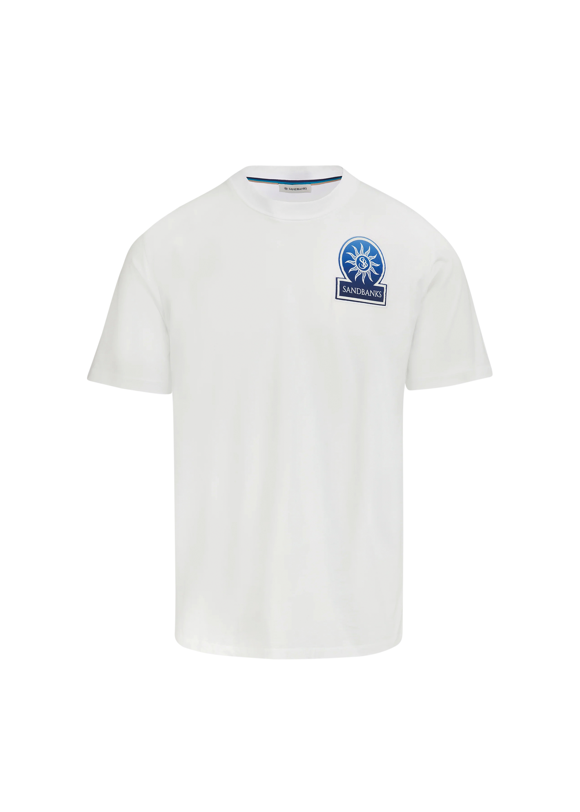 Sandbanks gradient appliqué t-shirt in white, featuring statement Sandbanks navy gradient logo chest and back print, and tri-colour back neck binding.