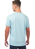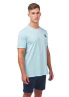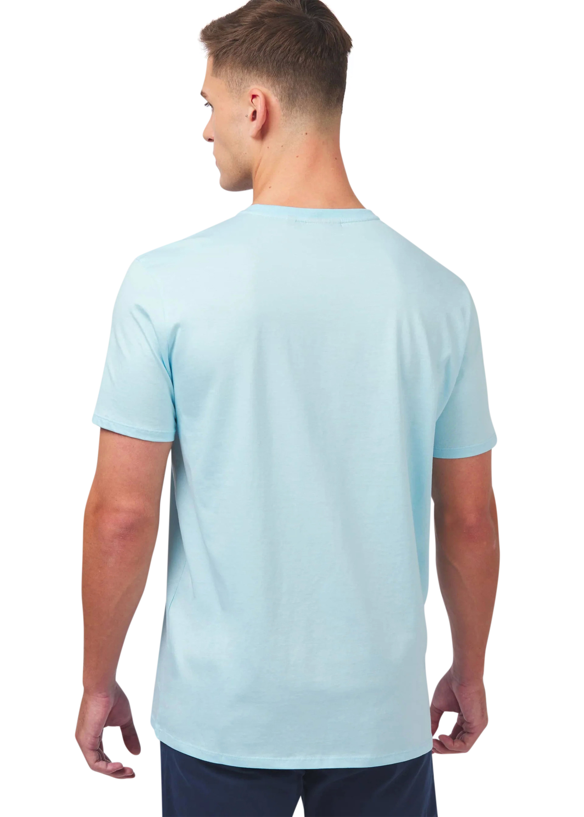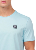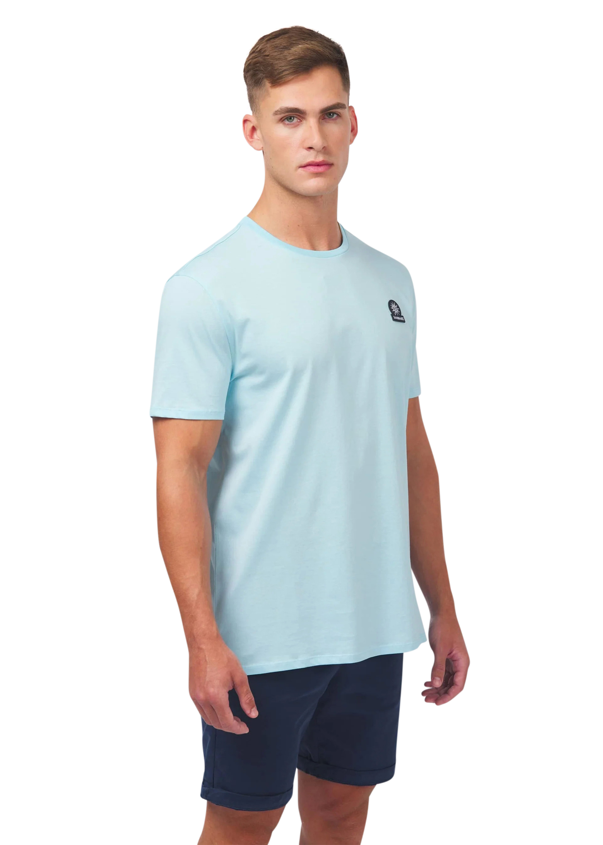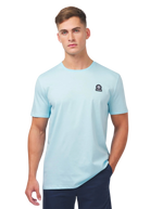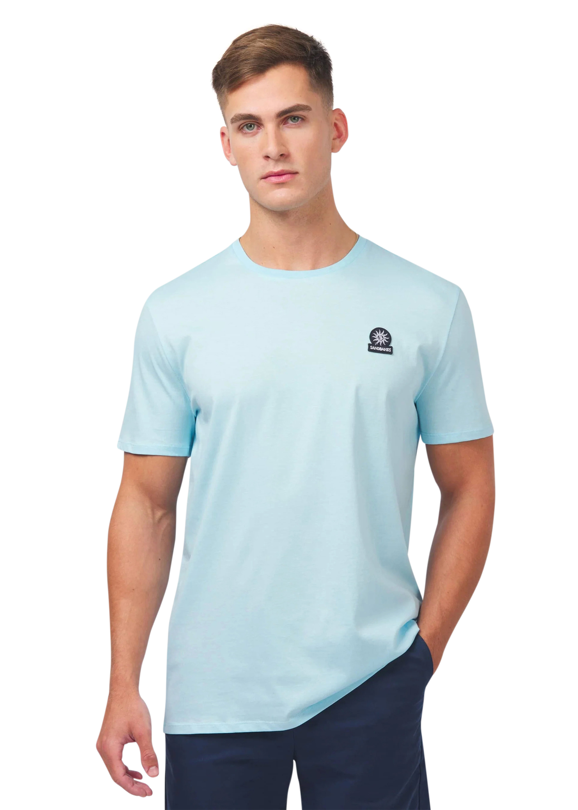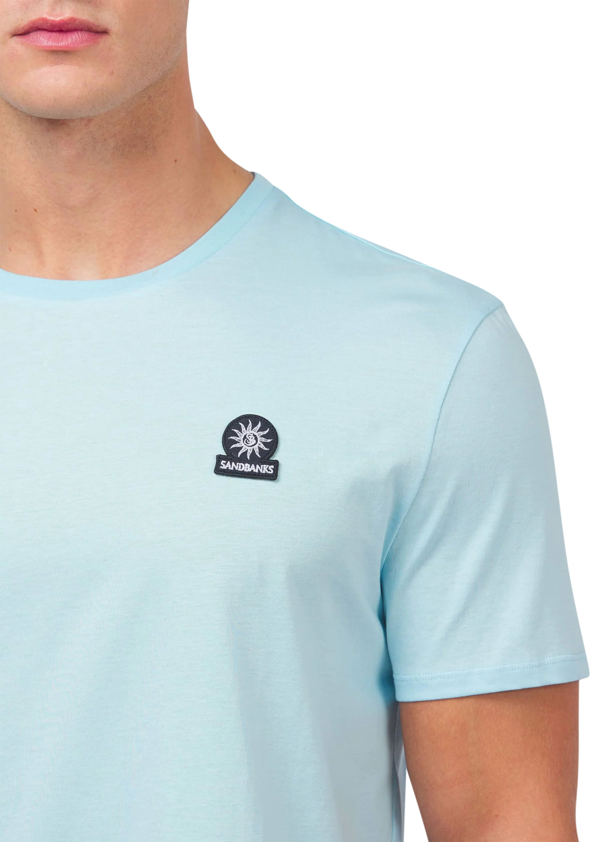 Sandbanks men's badge logo t-shirt in crystal blue, made from mercerised cotton for a silky and luxurious feel. This classic fitting crew neck t-shirt features an embroidered badge logo on the chest and tri-colour back neck binding.