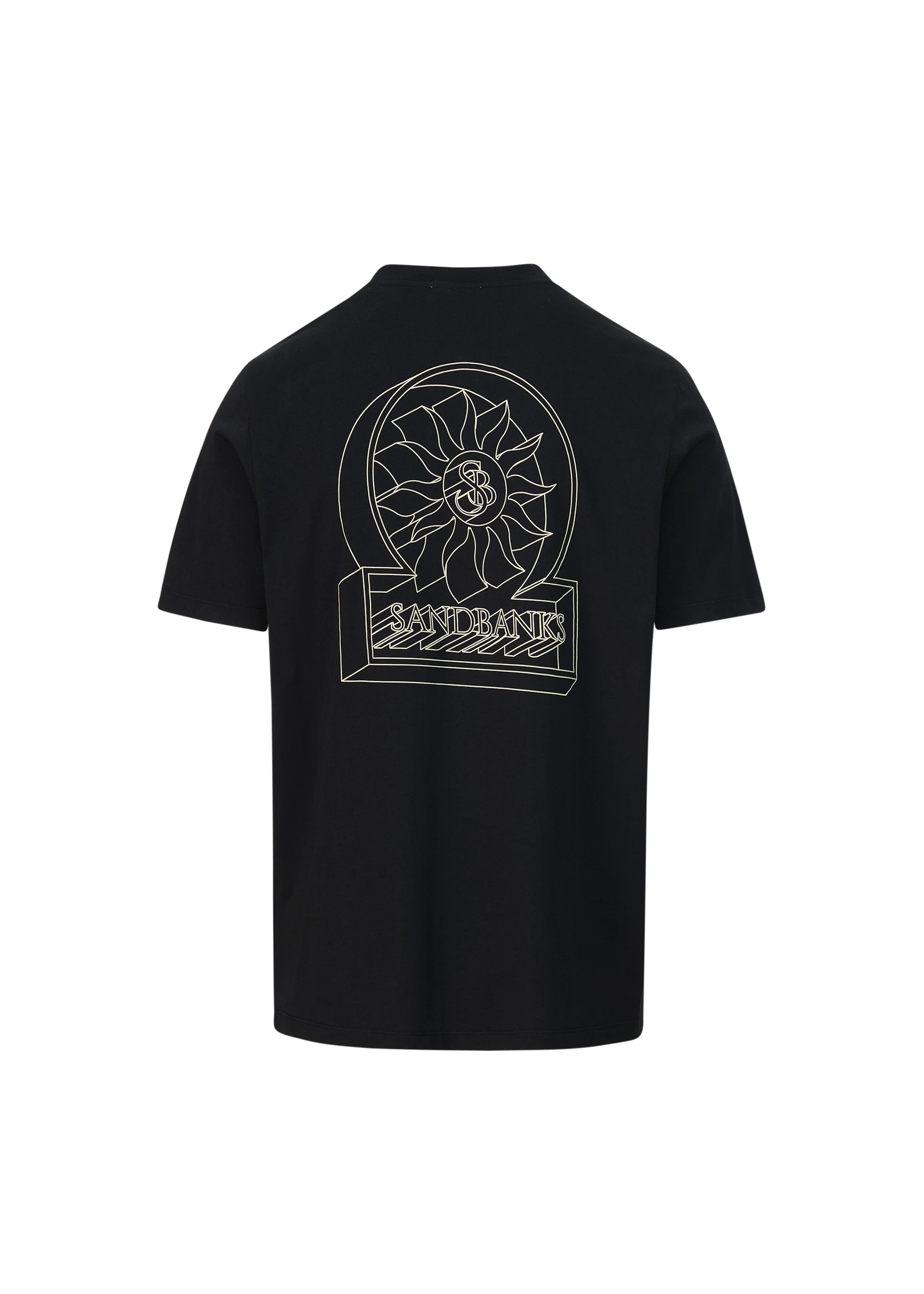 Sandbanks men's 3D logo printed t-shirt in black, made from 100% organic cotton. This t-shirt features a statement Sandbanks chest and rear print, and tri-colour back neck binding.