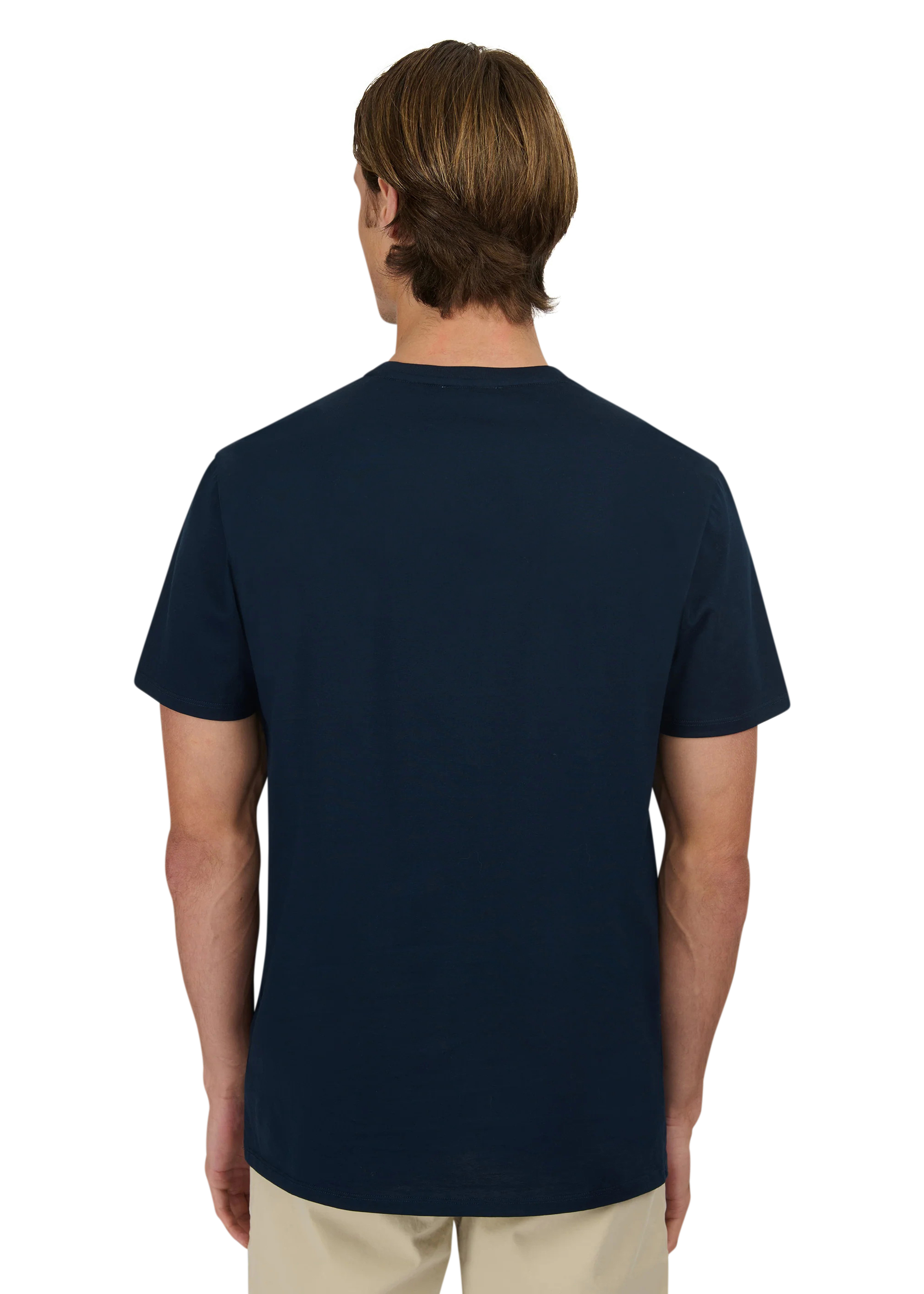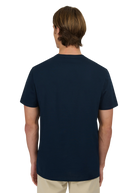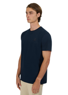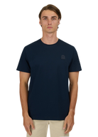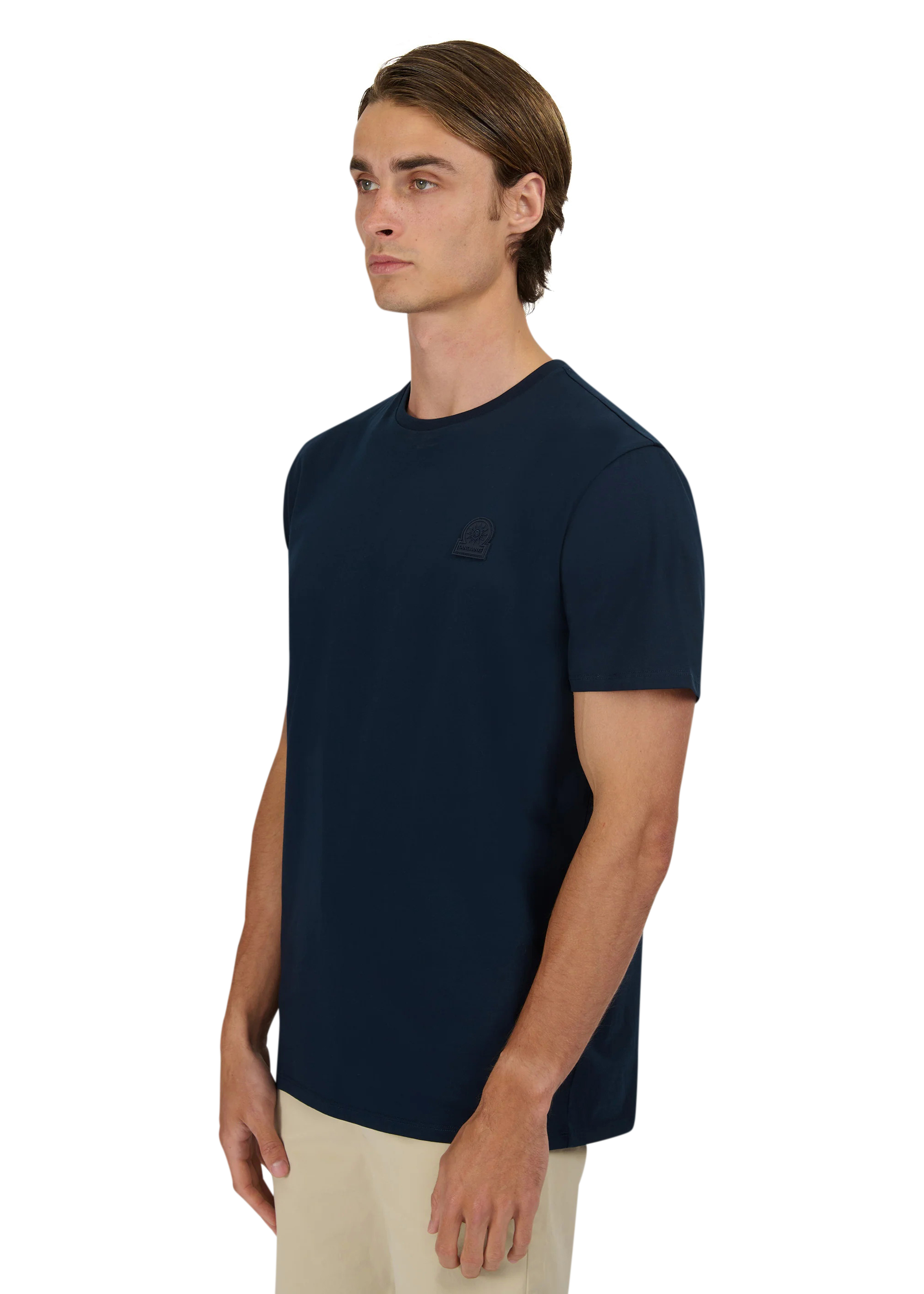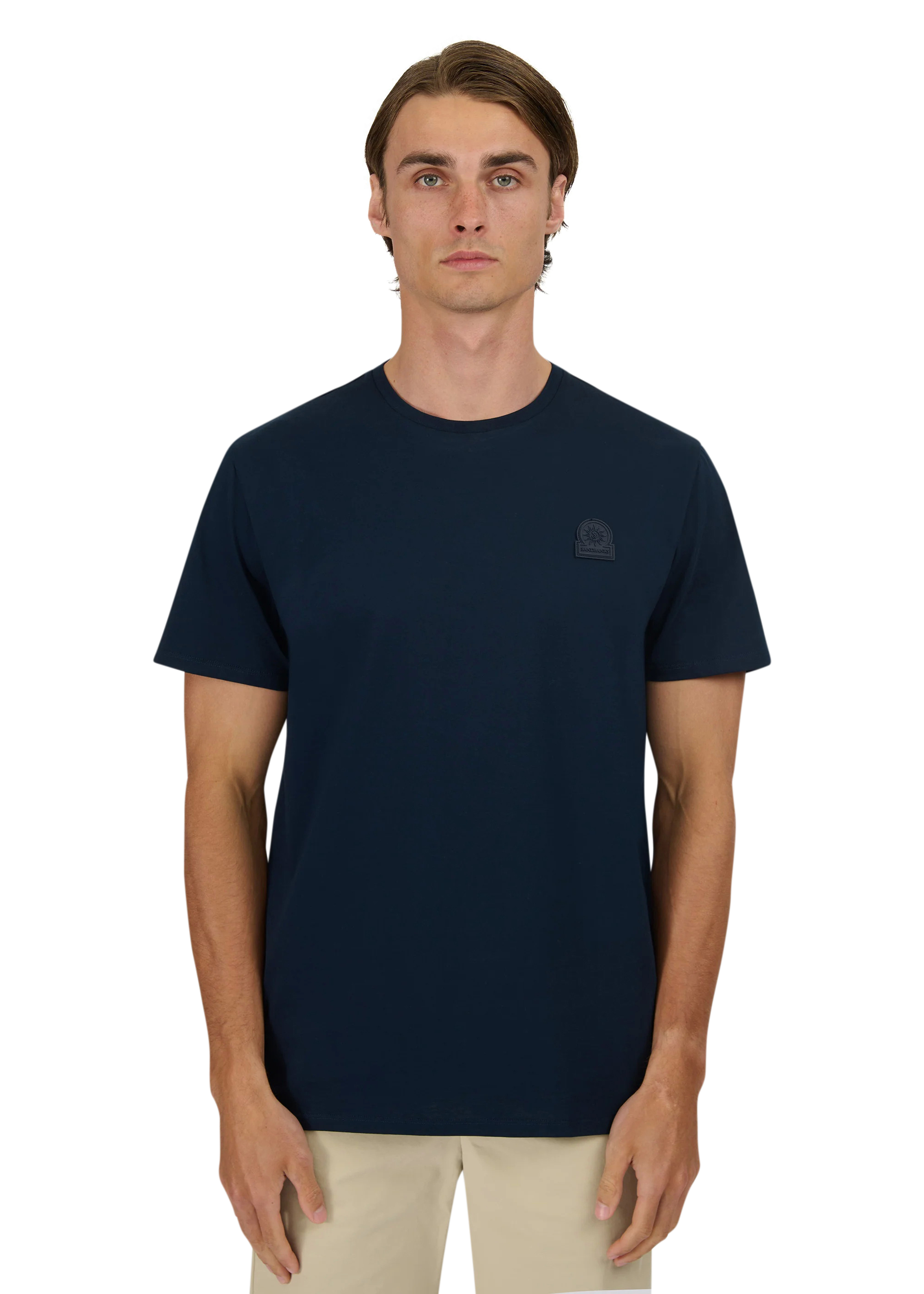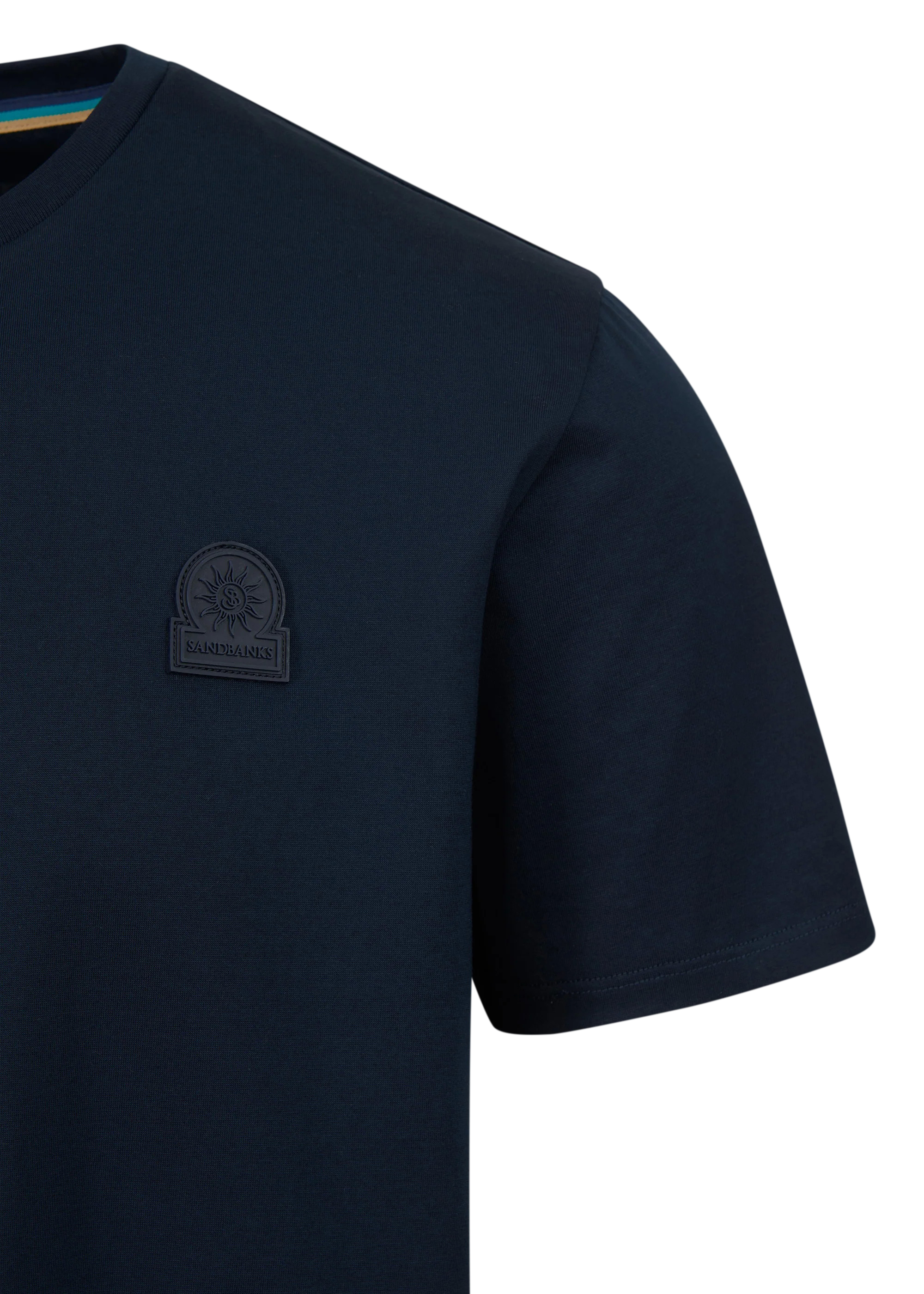 Sandbanks men's rubberised badge logo t-shirt in navy, made from mercerised cotton for a silky and luxurious feel. This classic fitting crew neck t-shirt features a rubberised logo badge on the chest and tri-colour back neck binding.