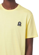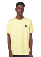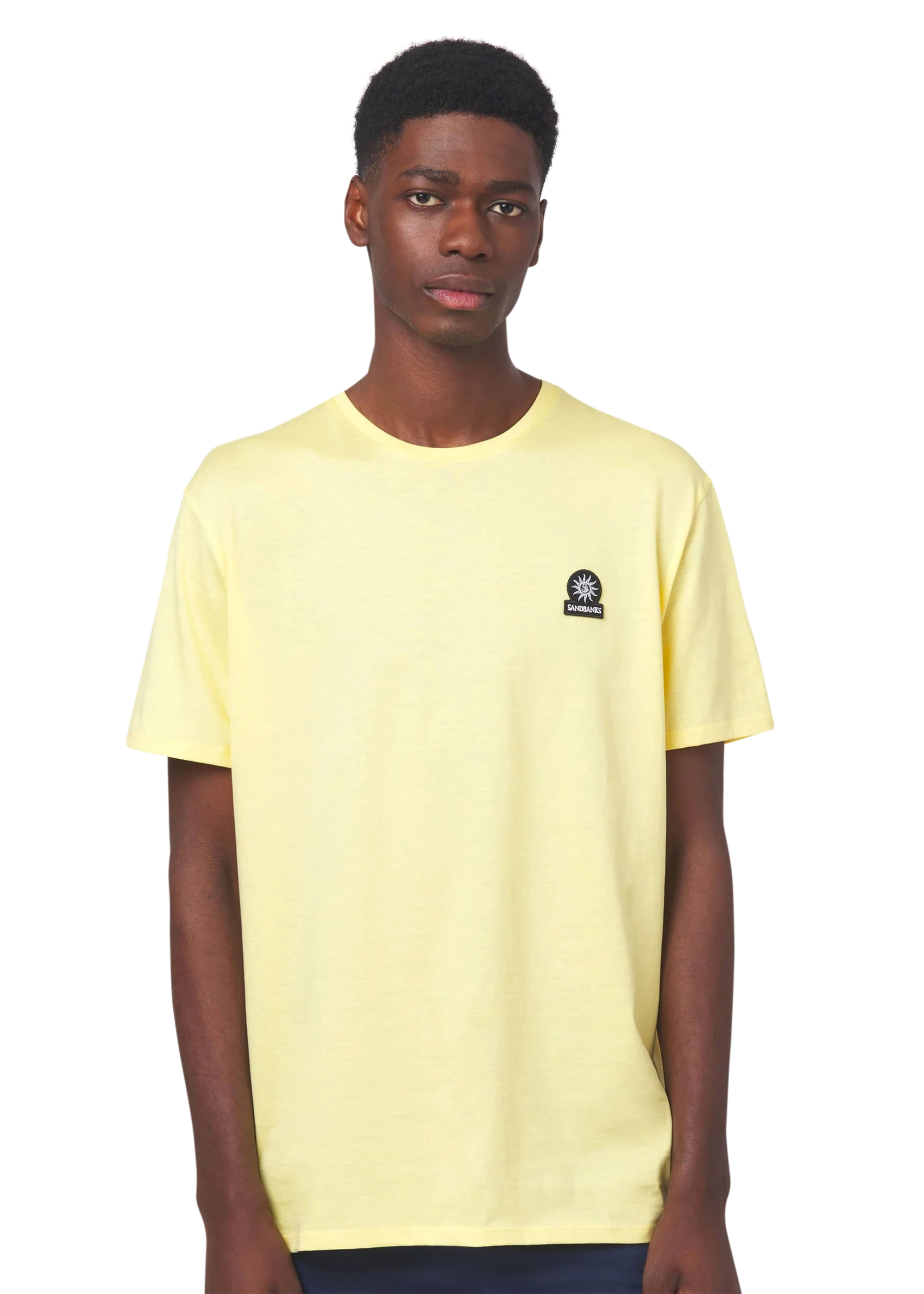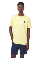 Sandbanks men's badge logo t-shirt in light yellow, made from mercerised cotton for a silky and luxurious feel. This classic fitting crew neck t-shirt features an embroidered badge logo on the chest and tri-colour back neck binding.