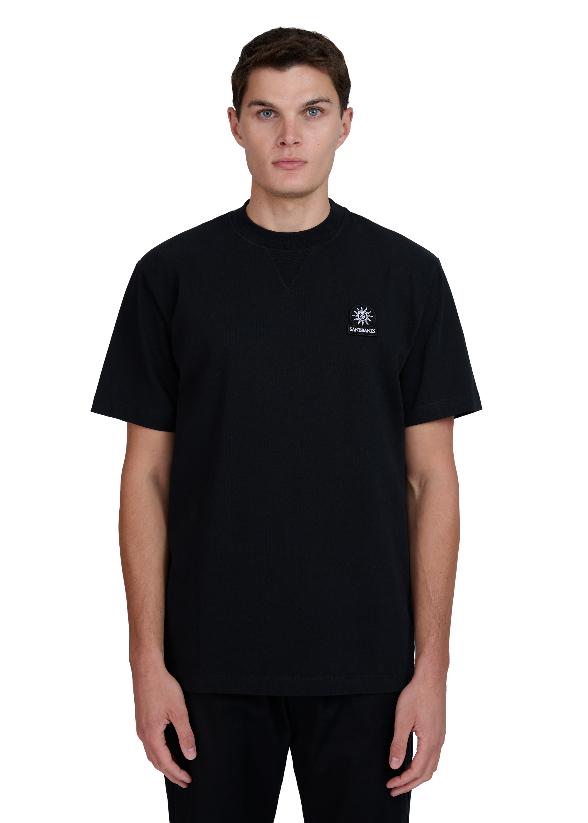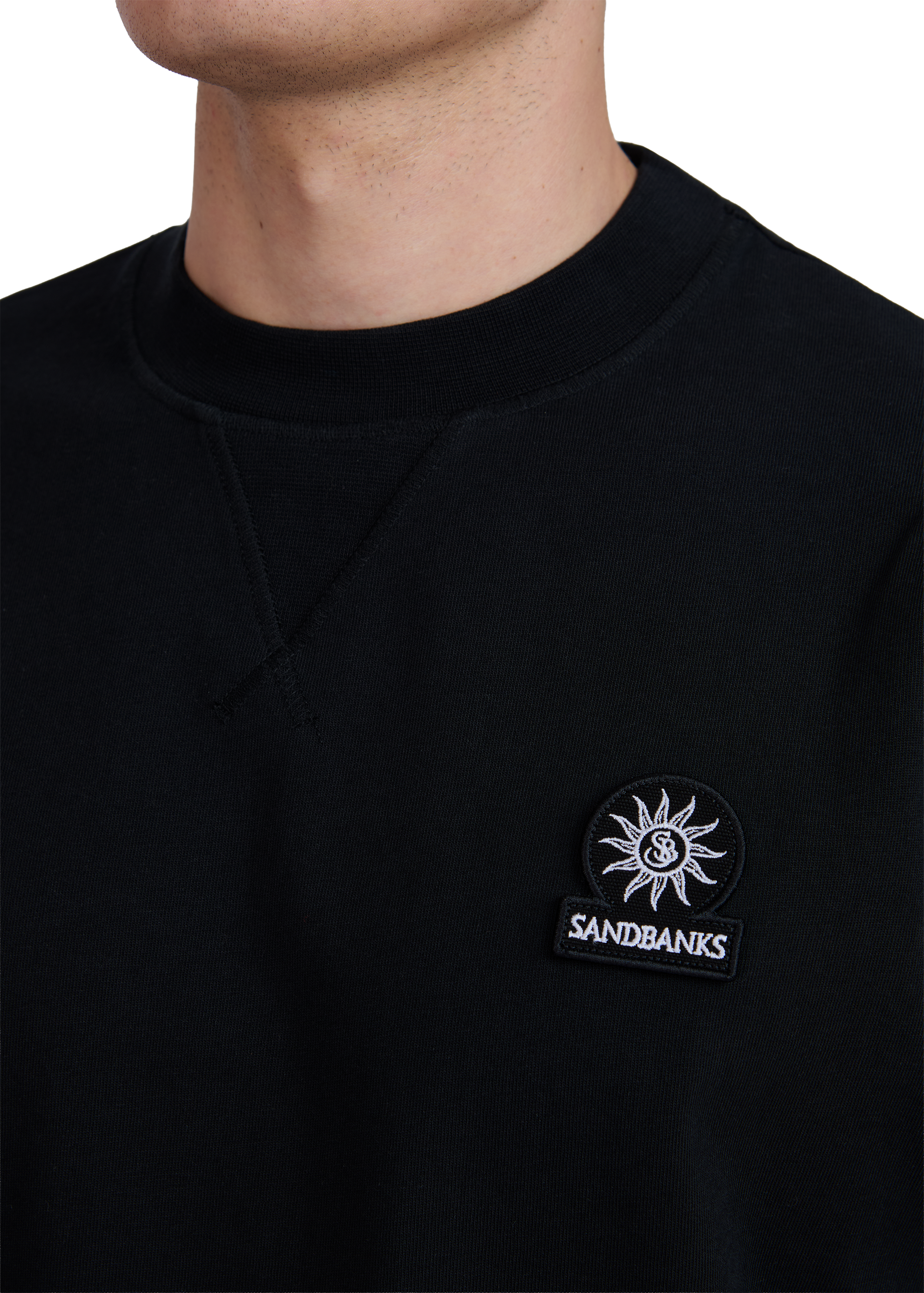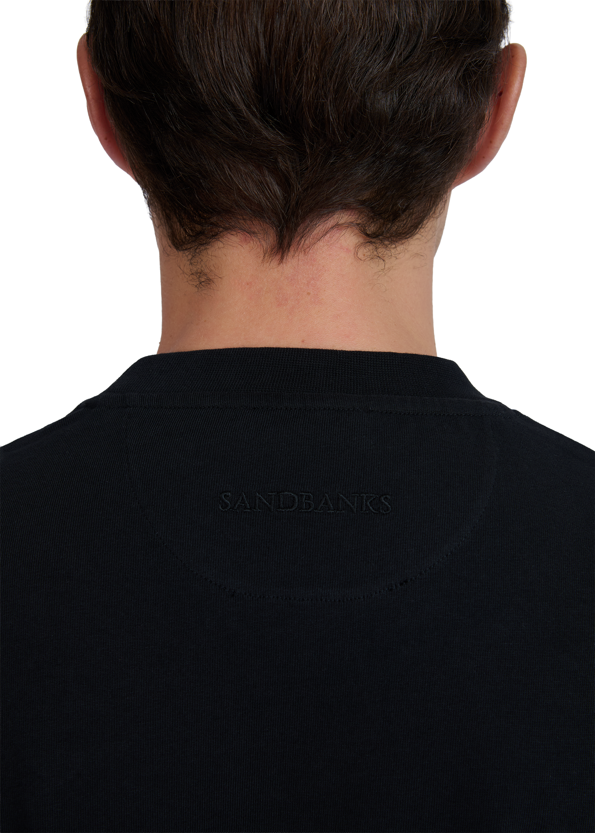 Sandbanks men's double jersey collegiate t-shirt in black, made from mercerised cotton for a silky and luxurious feel. This relaxed fit crew neck t-shirt features an embroidered badge logo on the chest and tri-colour back neck binding.
