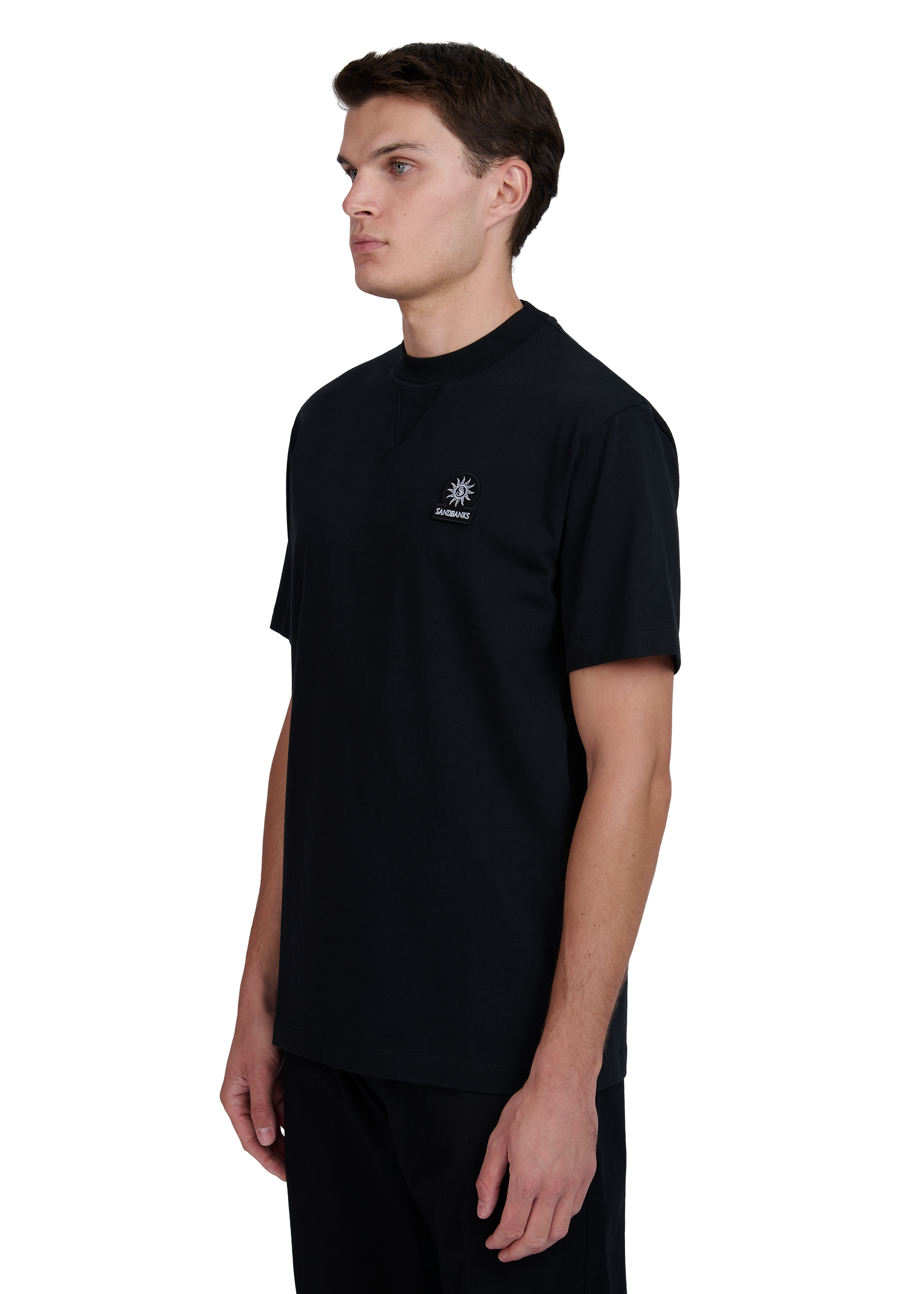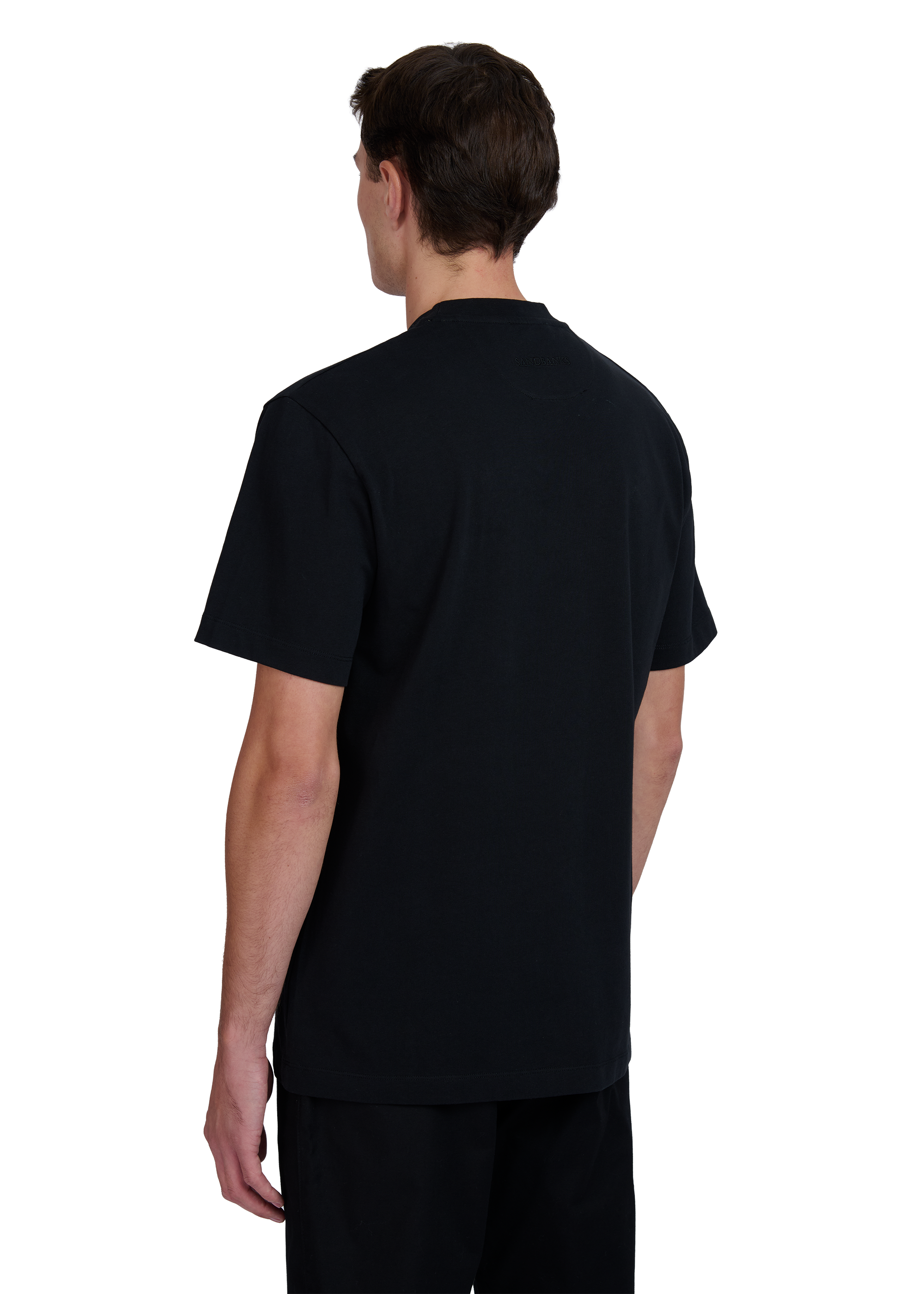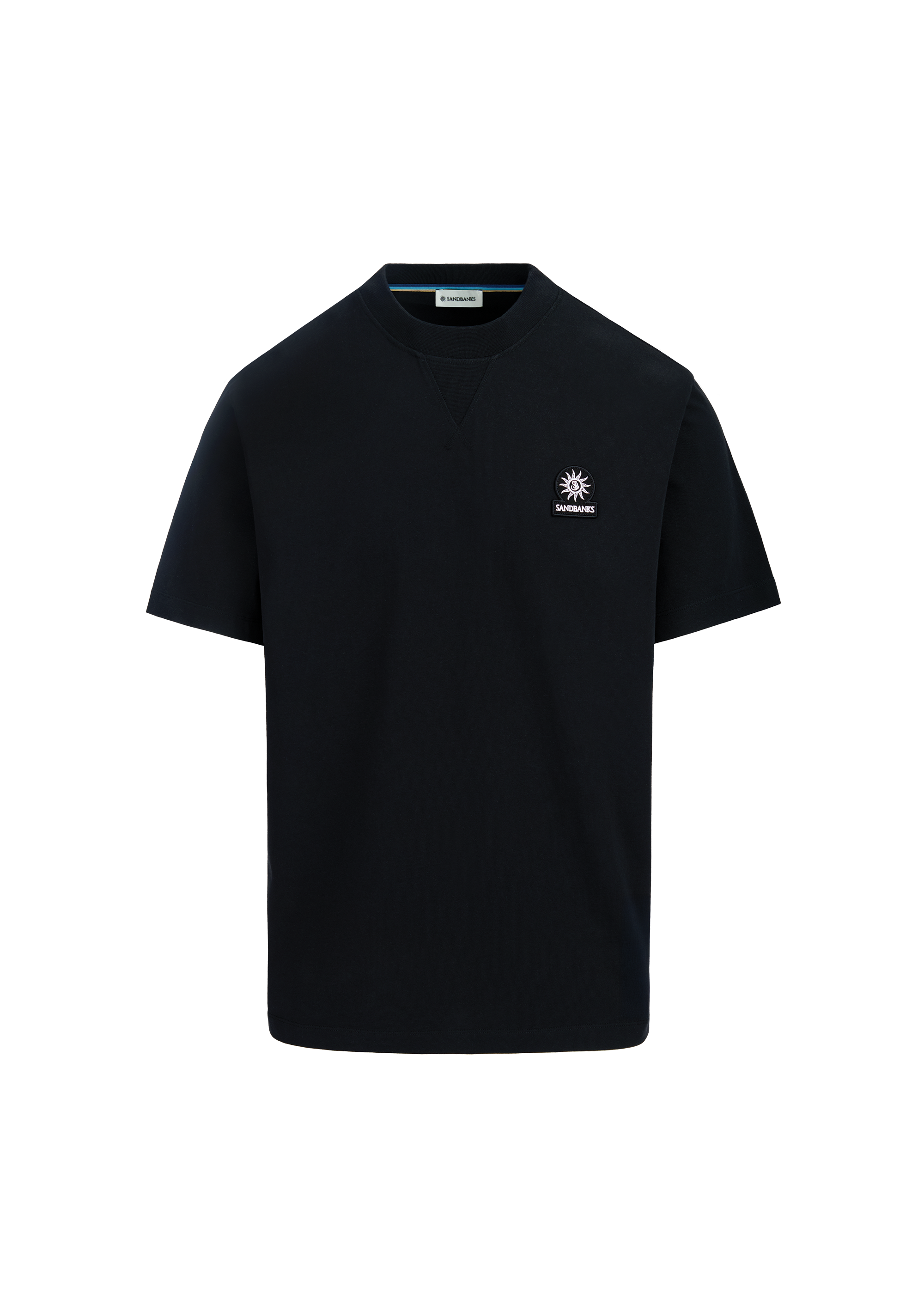 Sandbanks men's double jersey collegiate t-shirt in black, made from mercerised cotton for a silky and luxurious feel. This relaxed fit crew neck t-shirt features an embroidered badge logo on the chest and tri-colour back neck binding.