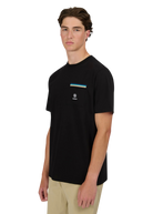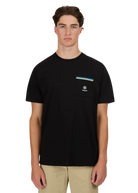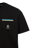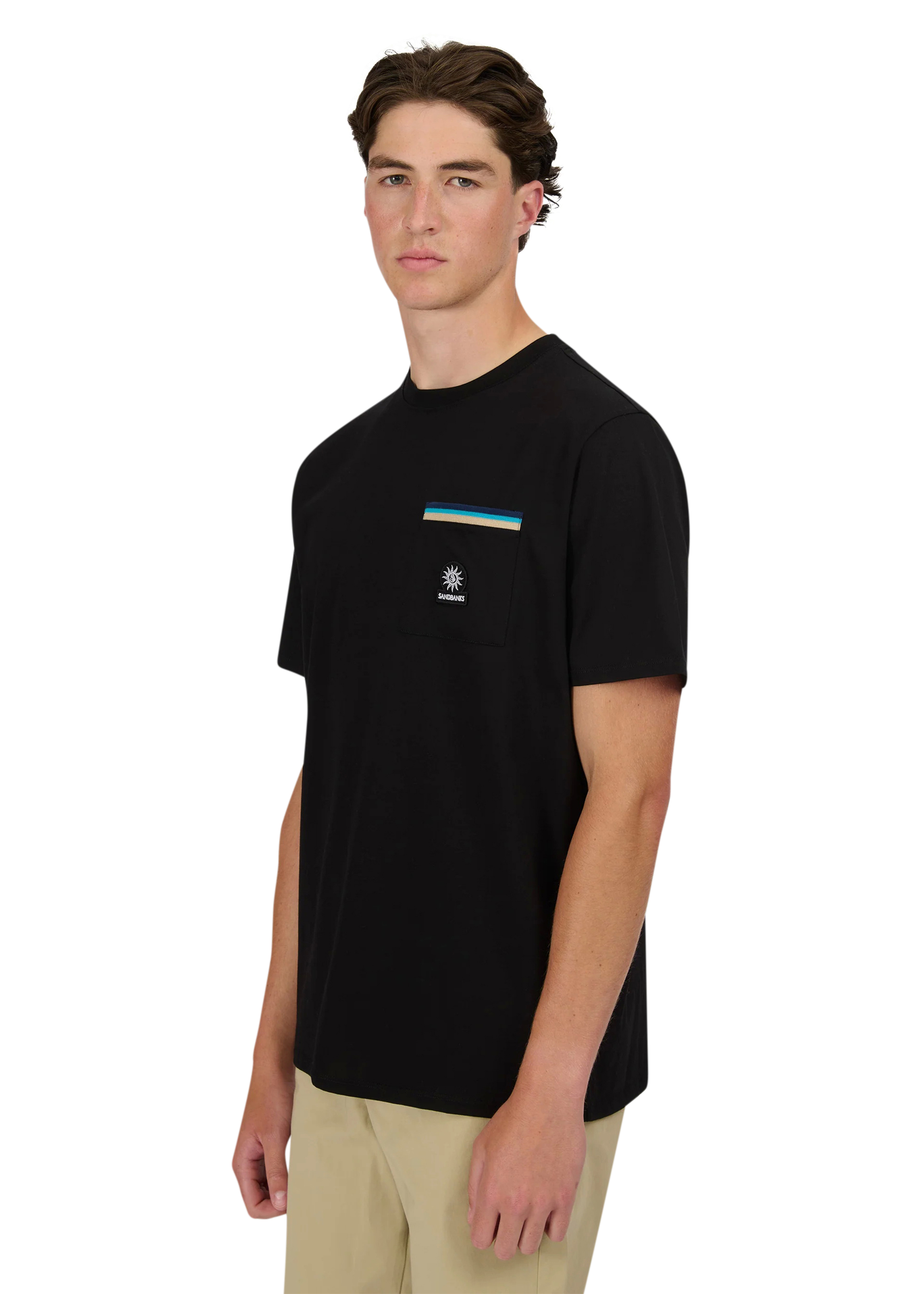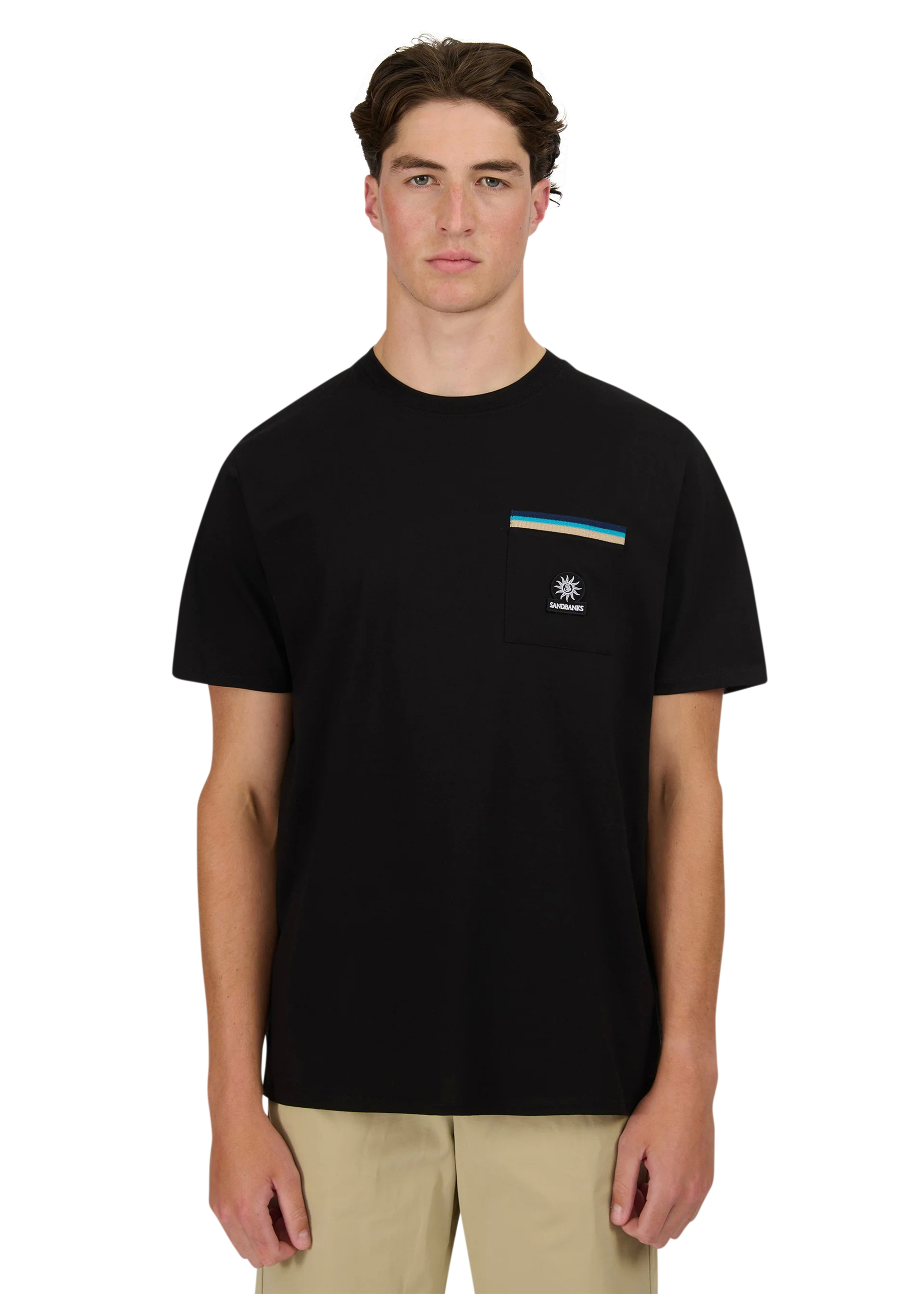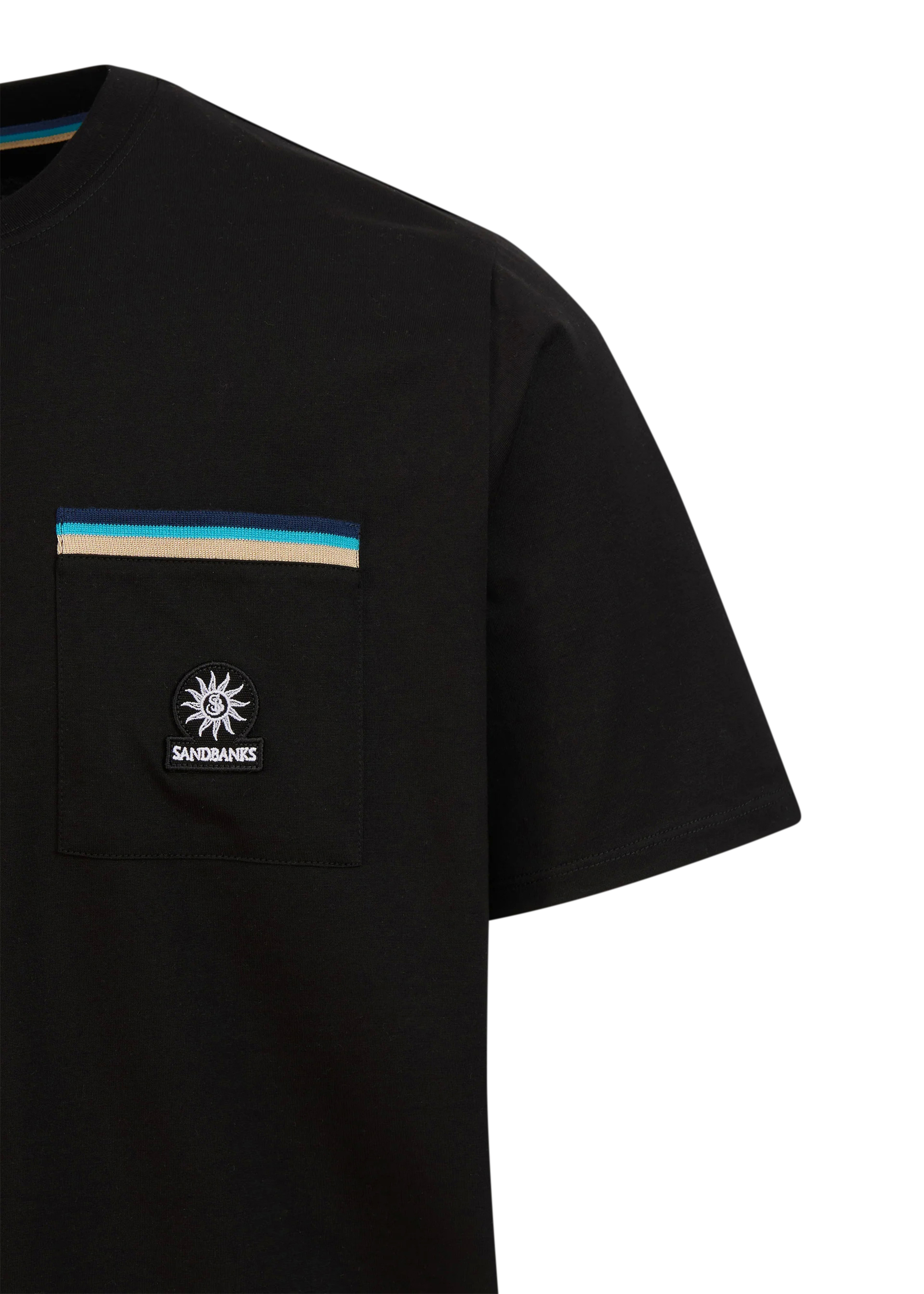 Sandbanks men's badge logo pocket t-shirt in black, made from mercerised 100% organic cotton for a silky and luxurious feel. This relaxed fitting crew neck t-shirt features statement pocket with embroidered badge logo and tri-colour rib binding pocket.
