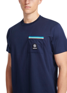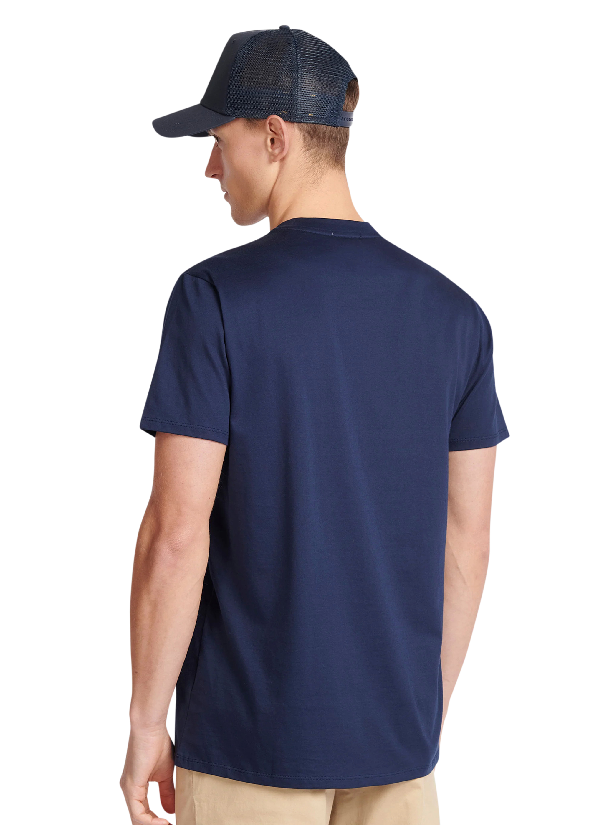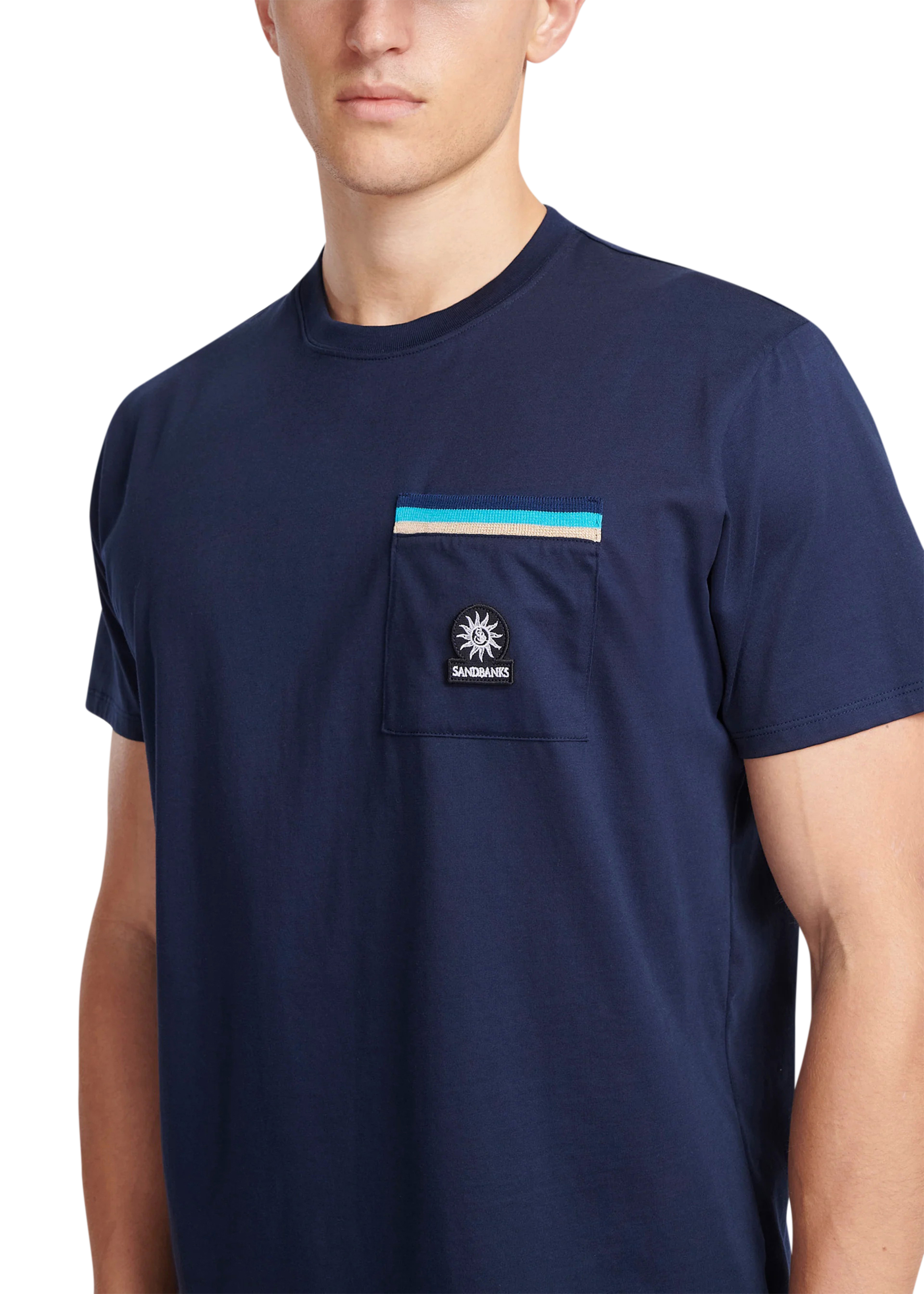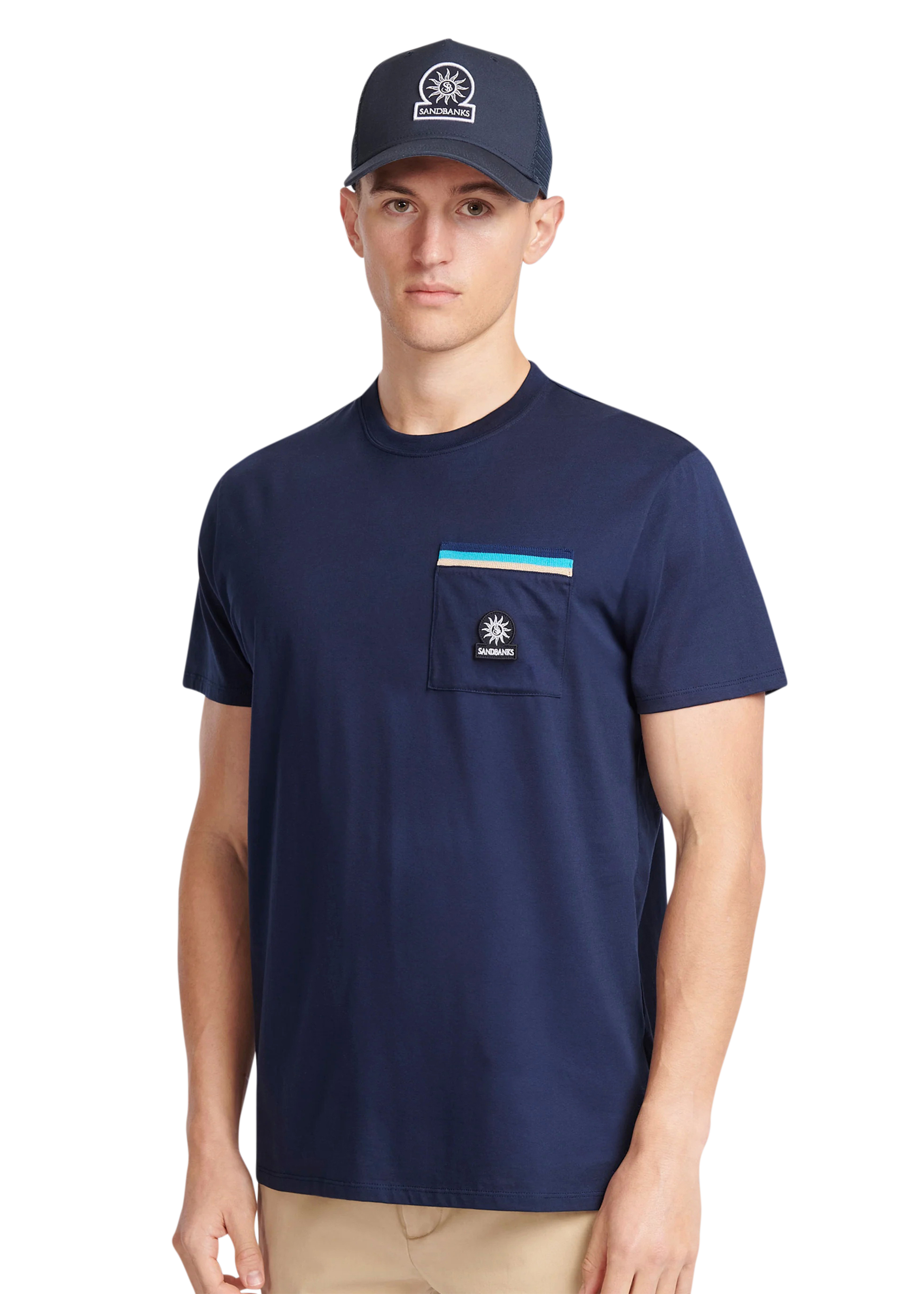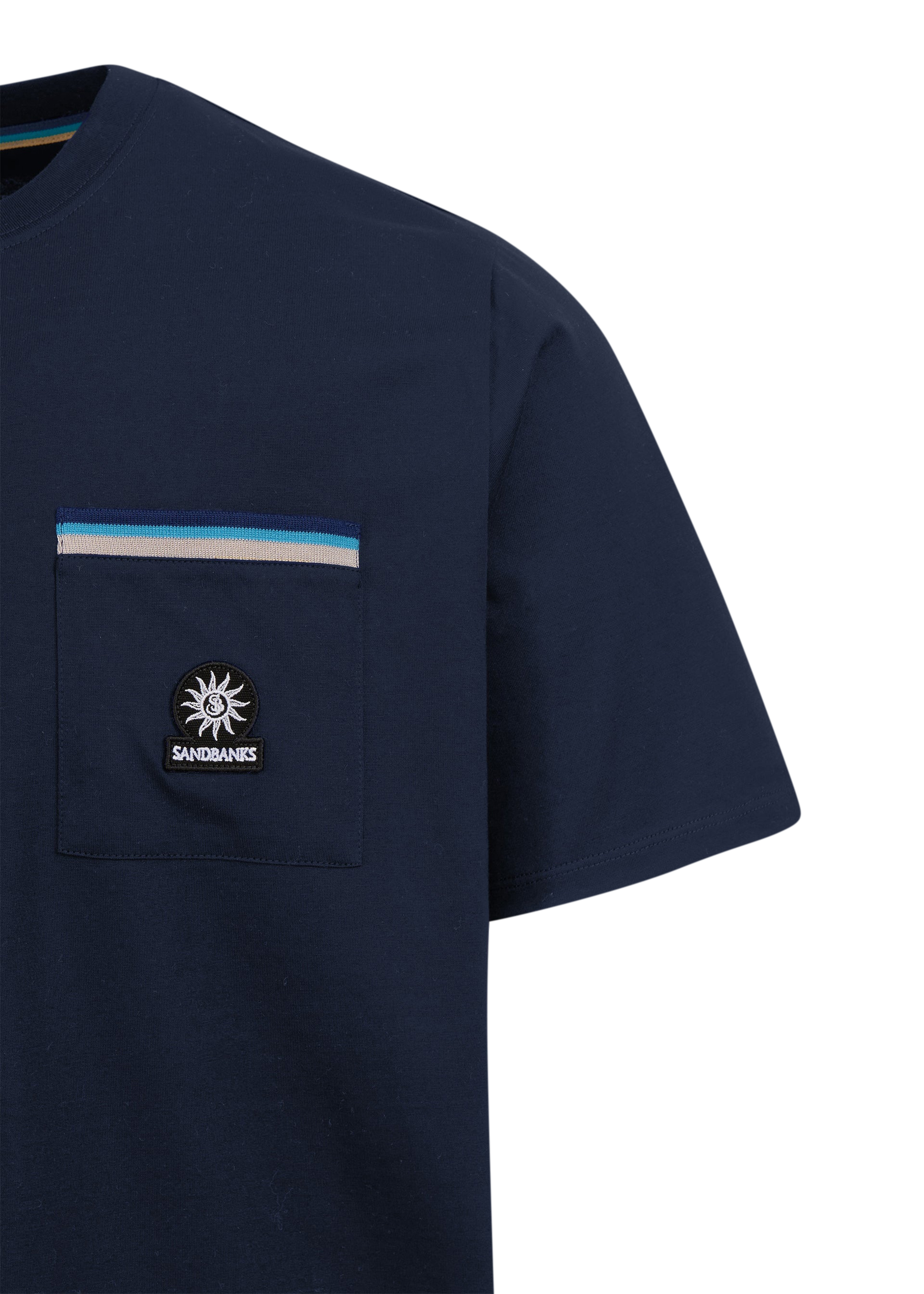 Sandbanks men's badge logo pocket t-shirt in navy, made from mercerised 100% organic cotton for a silky and luxurious feel. This relaxed fitting crew neck t-shirt features statement pocket with embroidered badge logo and tri-colour rib binding pocket.