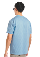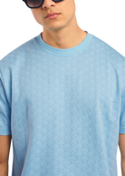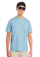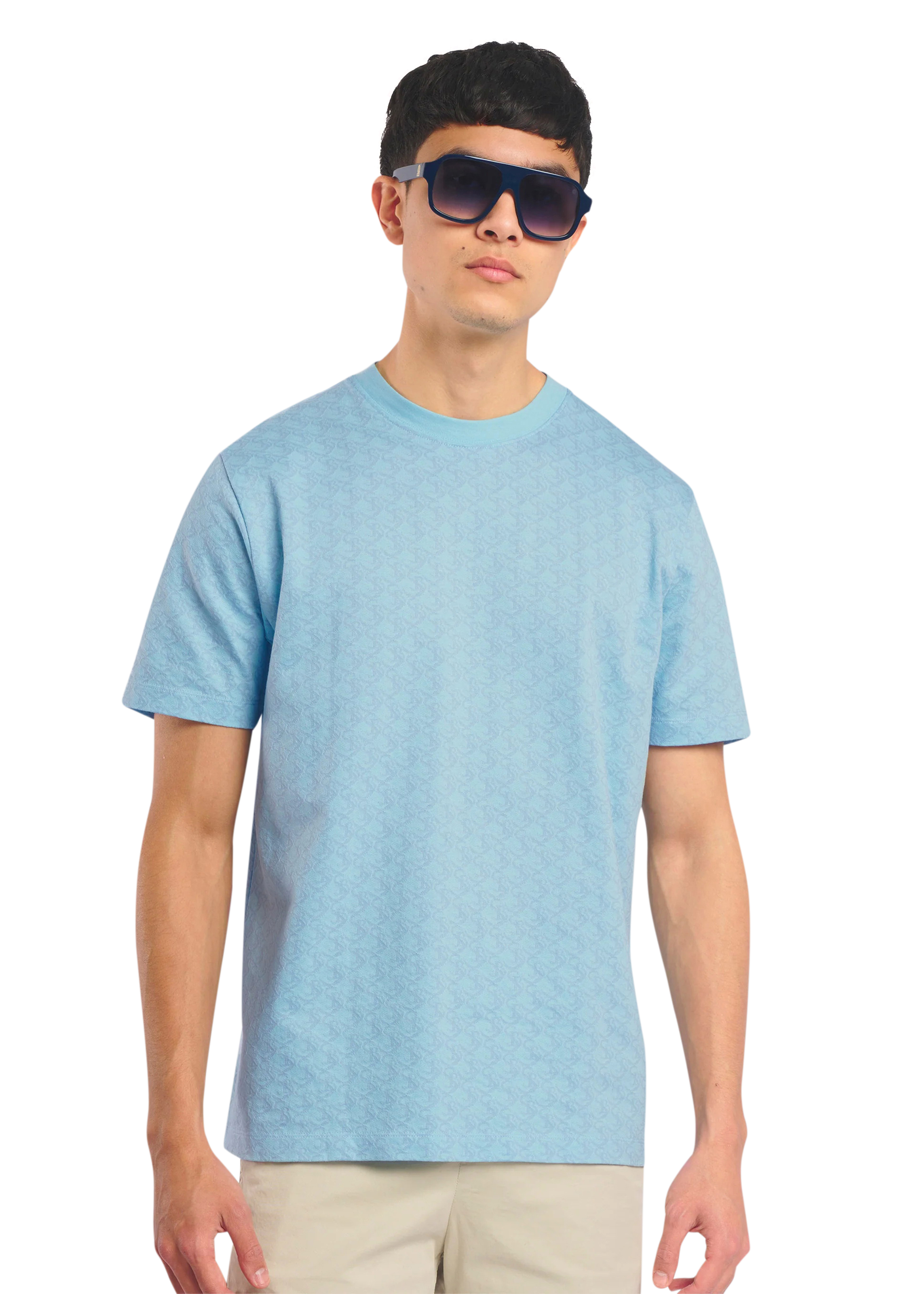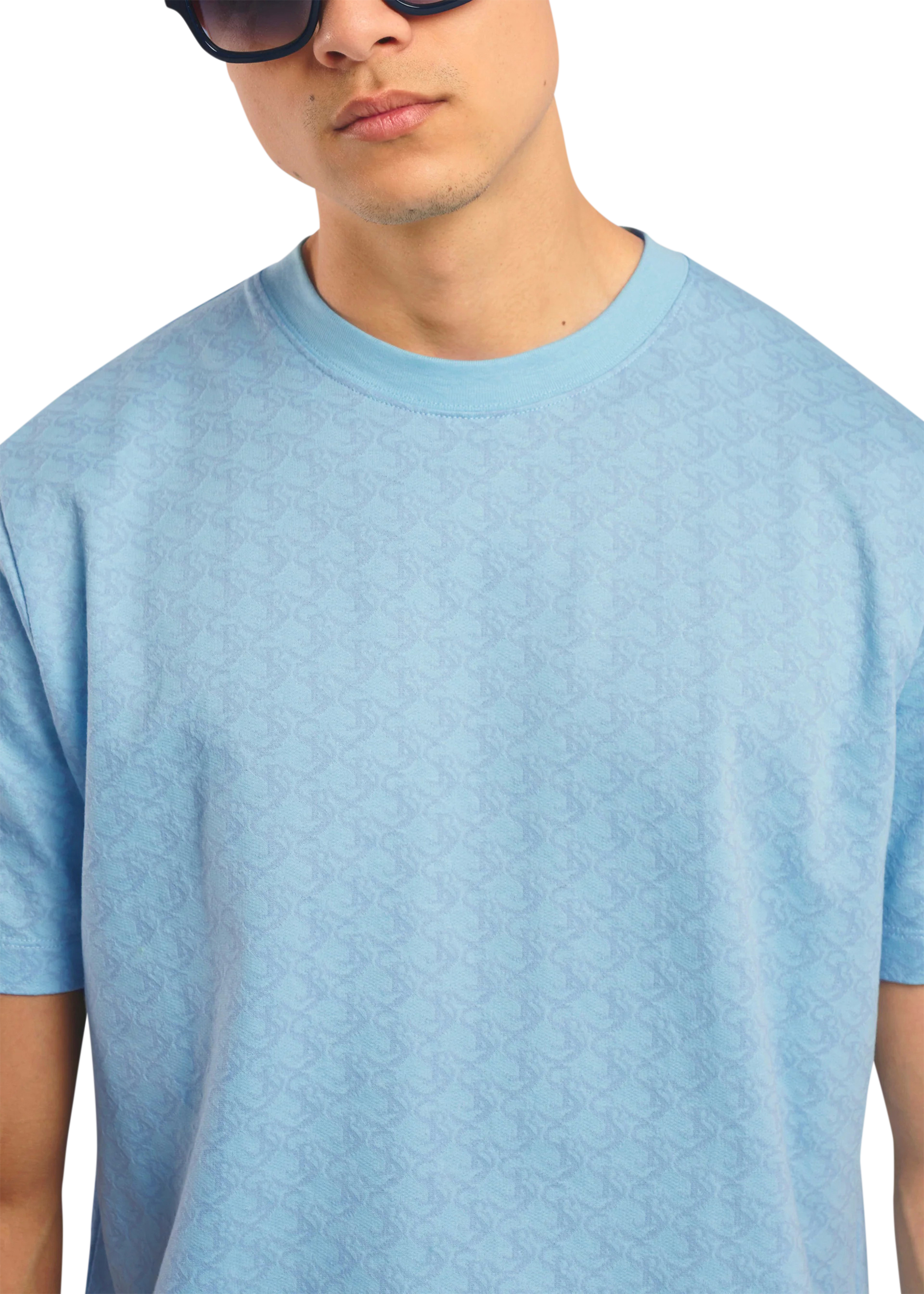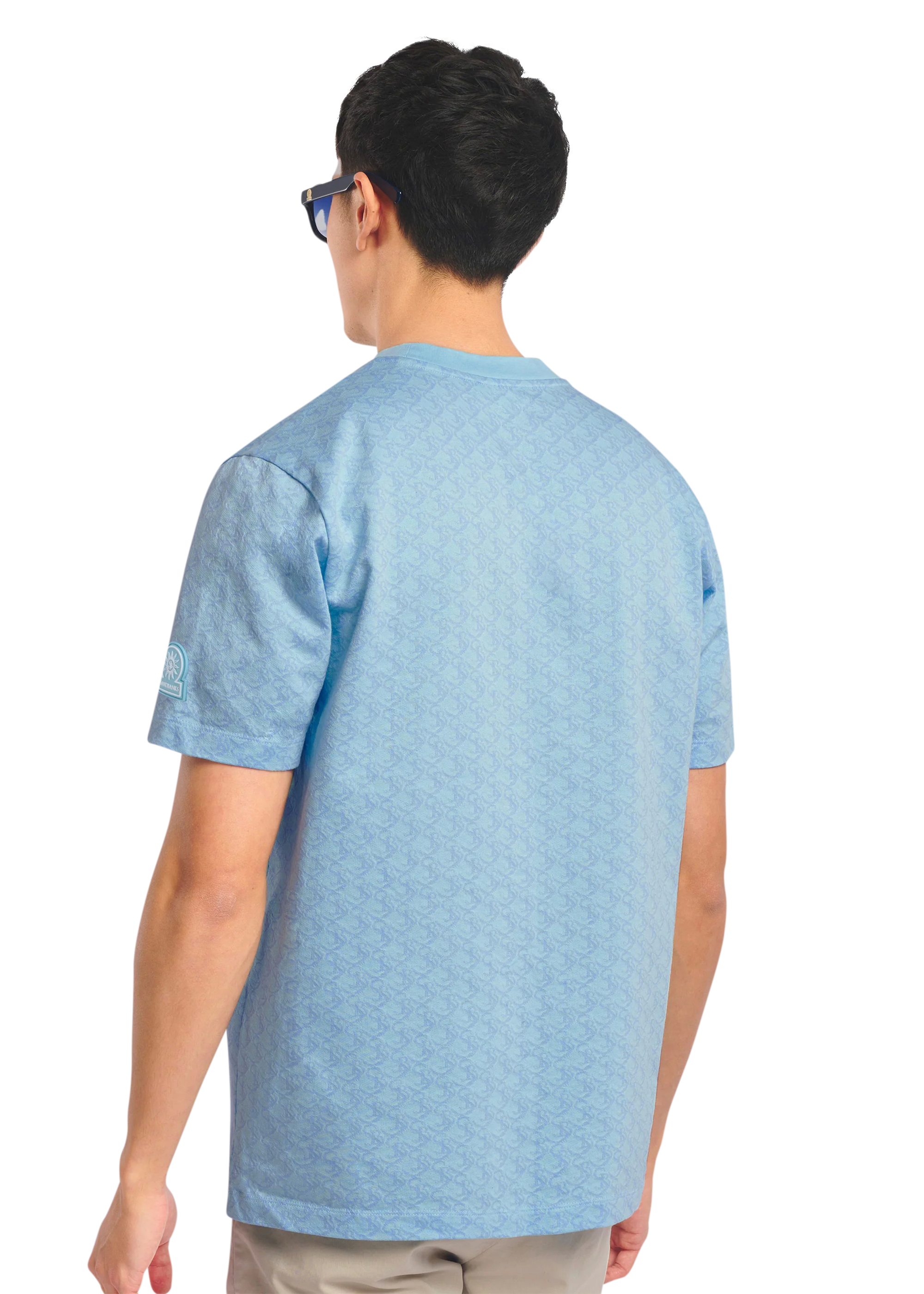 Sandbanks men's monogram t-shirt in crystal blue, made from 100% BCI Cotton. This relaxed fitting t-shirt features tonal crystal blue jacquard monogram, rubber badge logo on the arm, and tri-colour back neck binding.