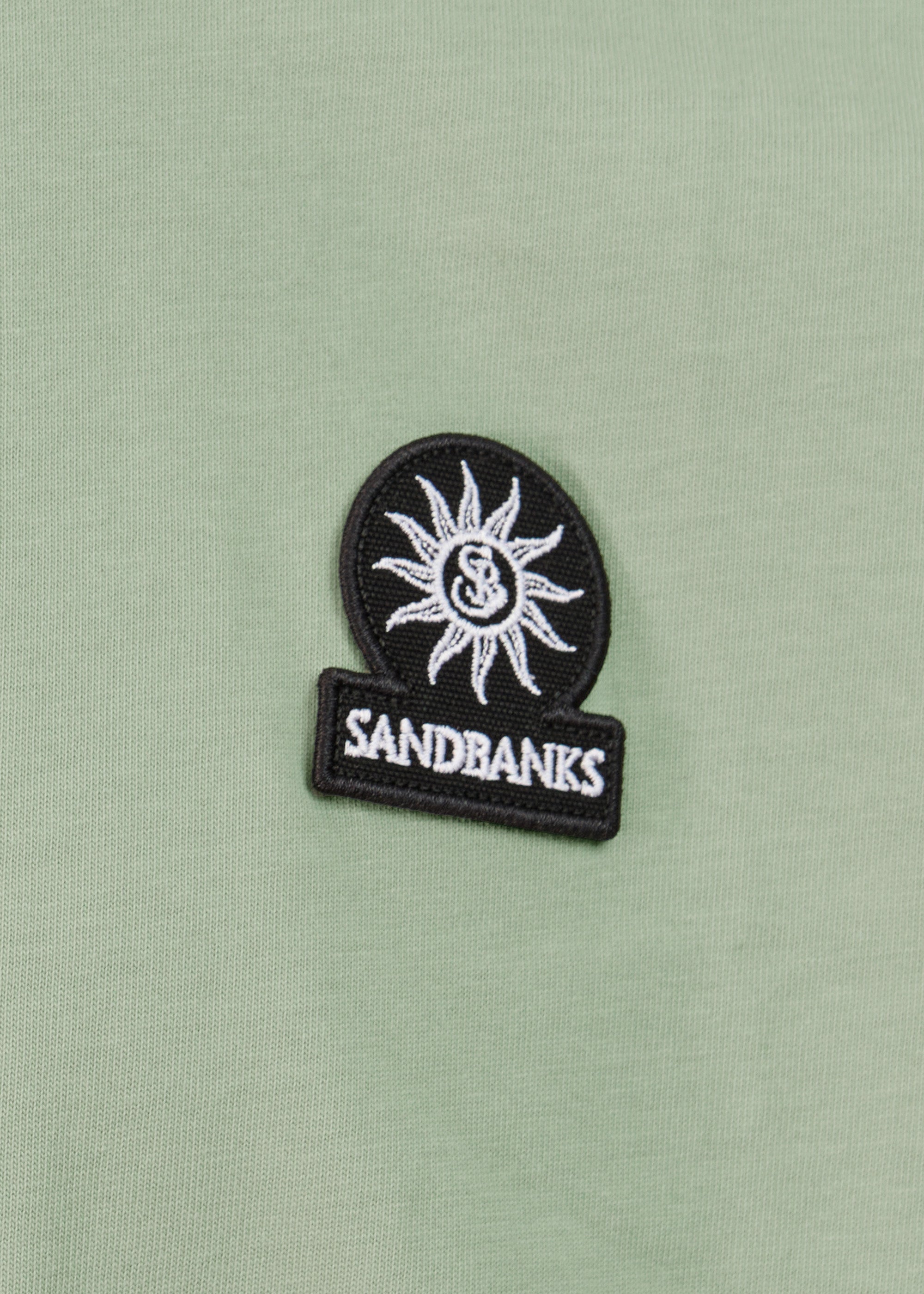 Sandbanks men's double jersey collegiate t-shirt in sage, made from mercerised cotton for a silky and luxurious feel. This relaxed fit crew neck t-shirt features an embroidered badge logo on the chest and tri-colour back neck binding.