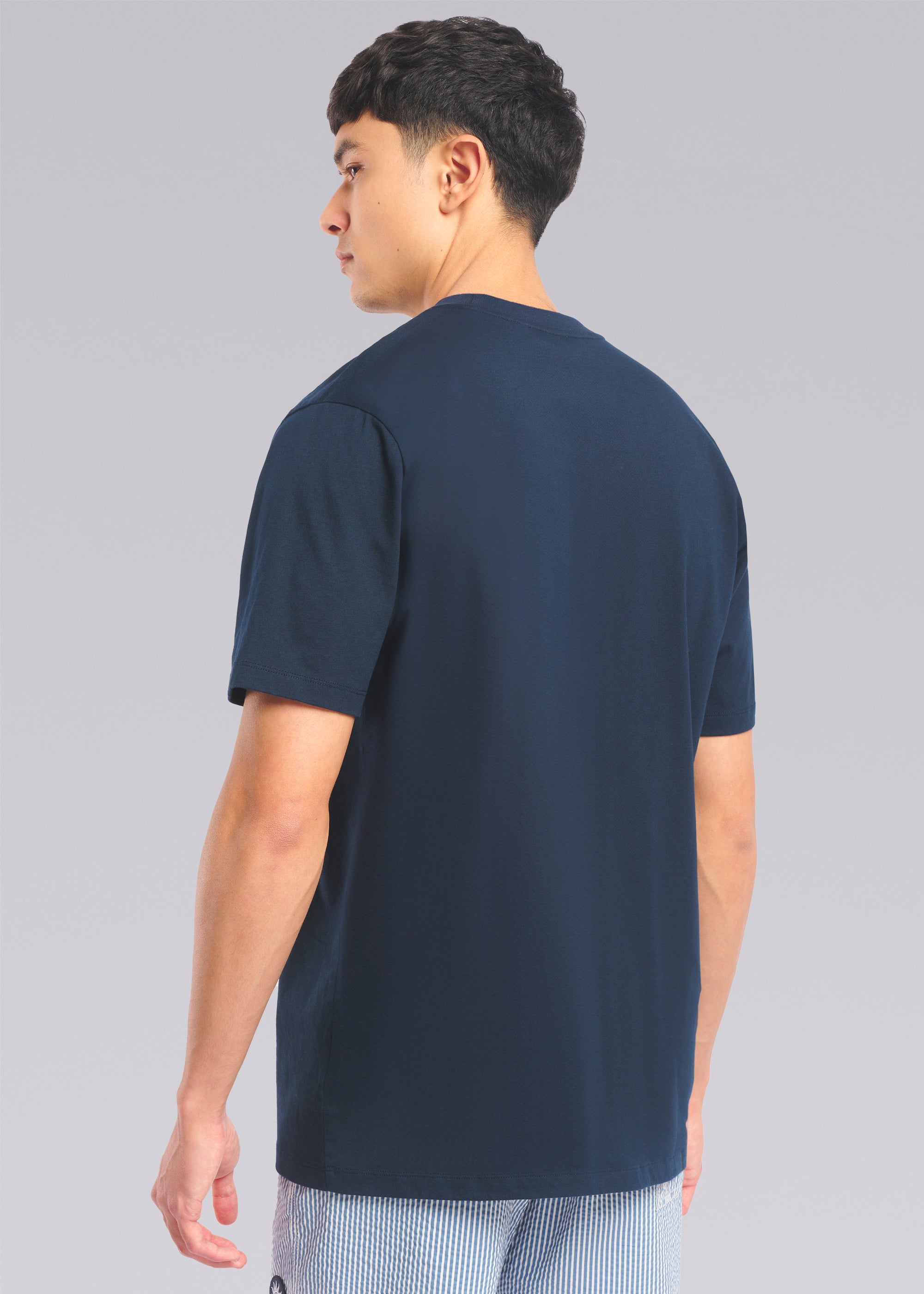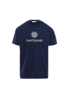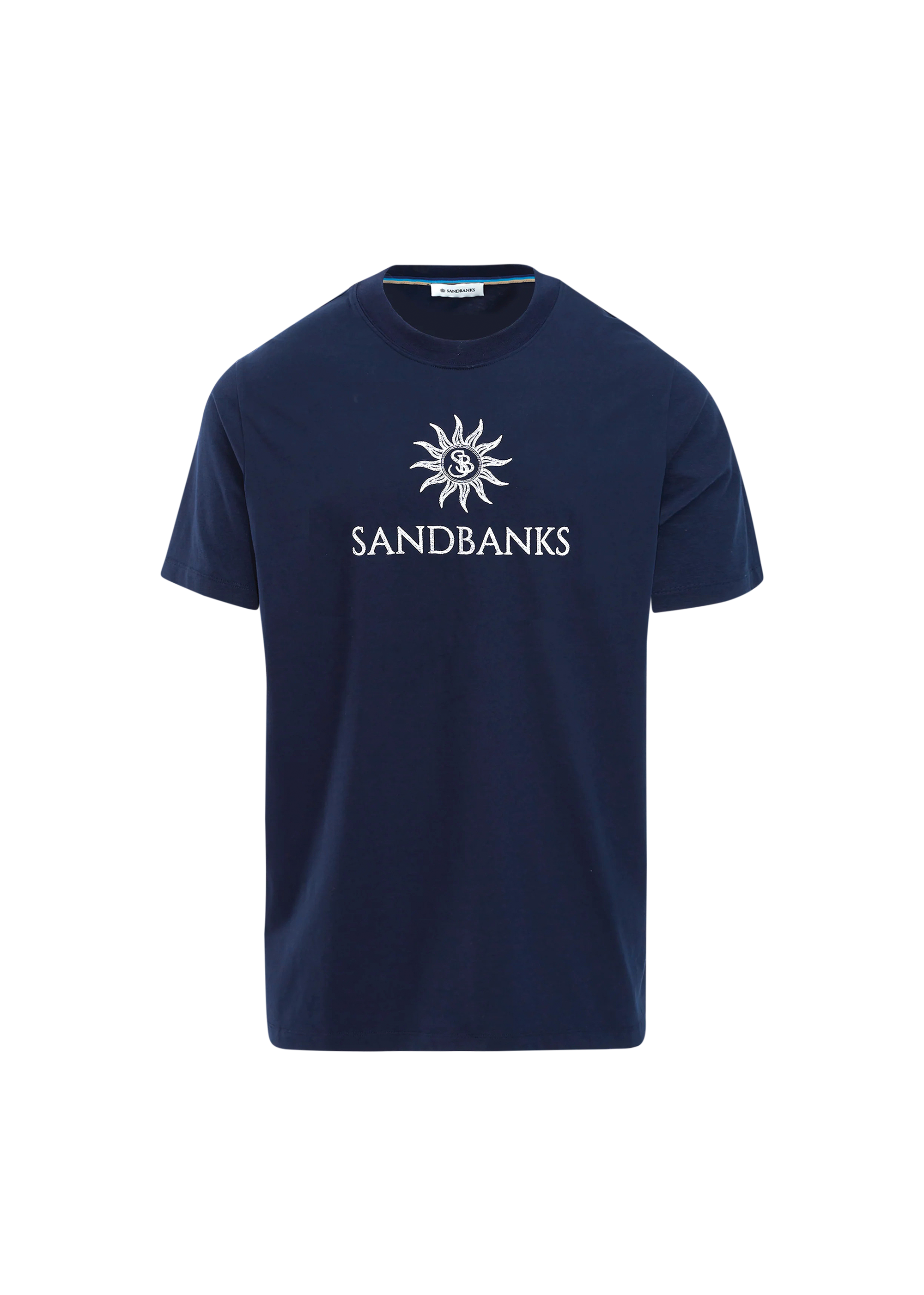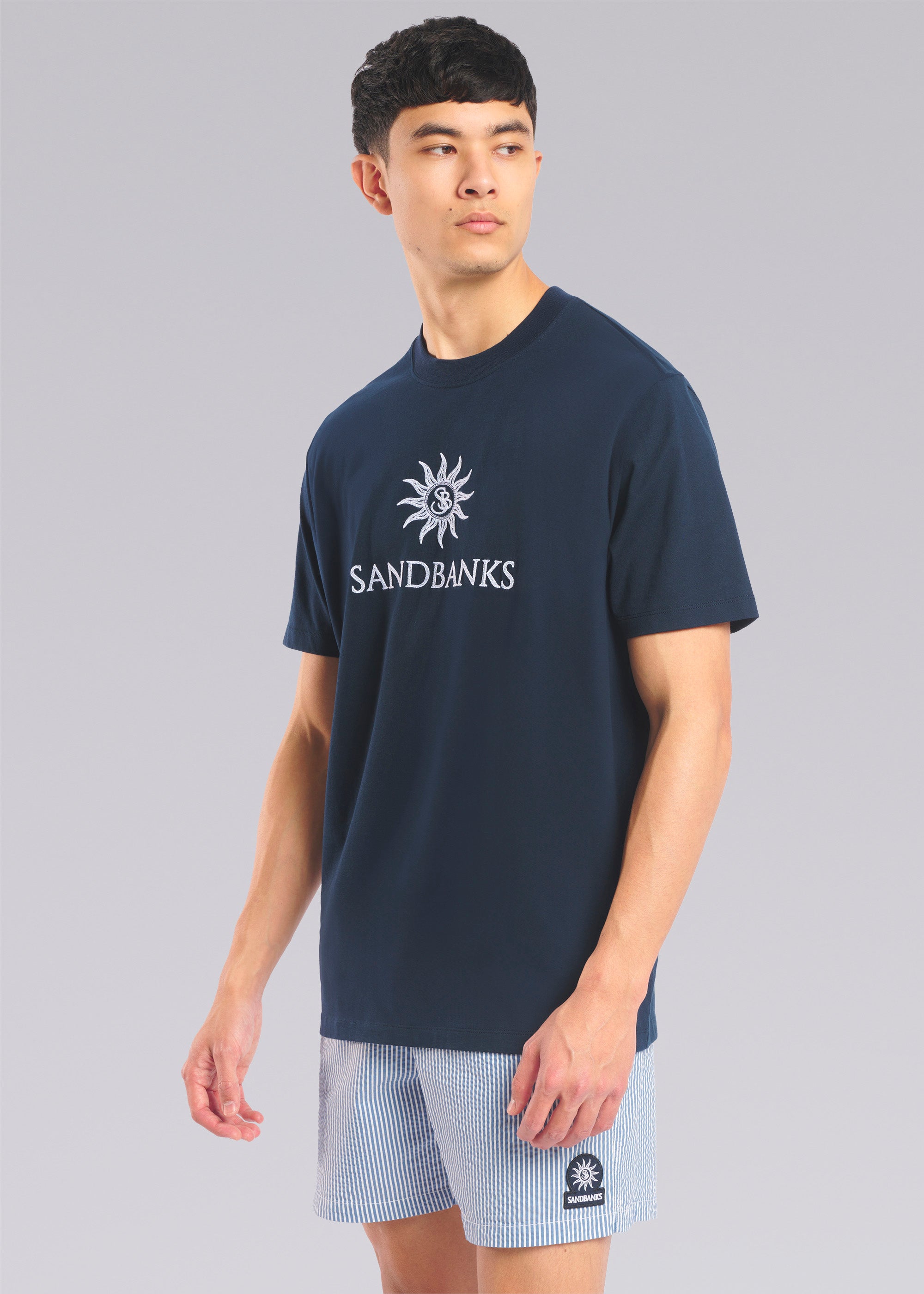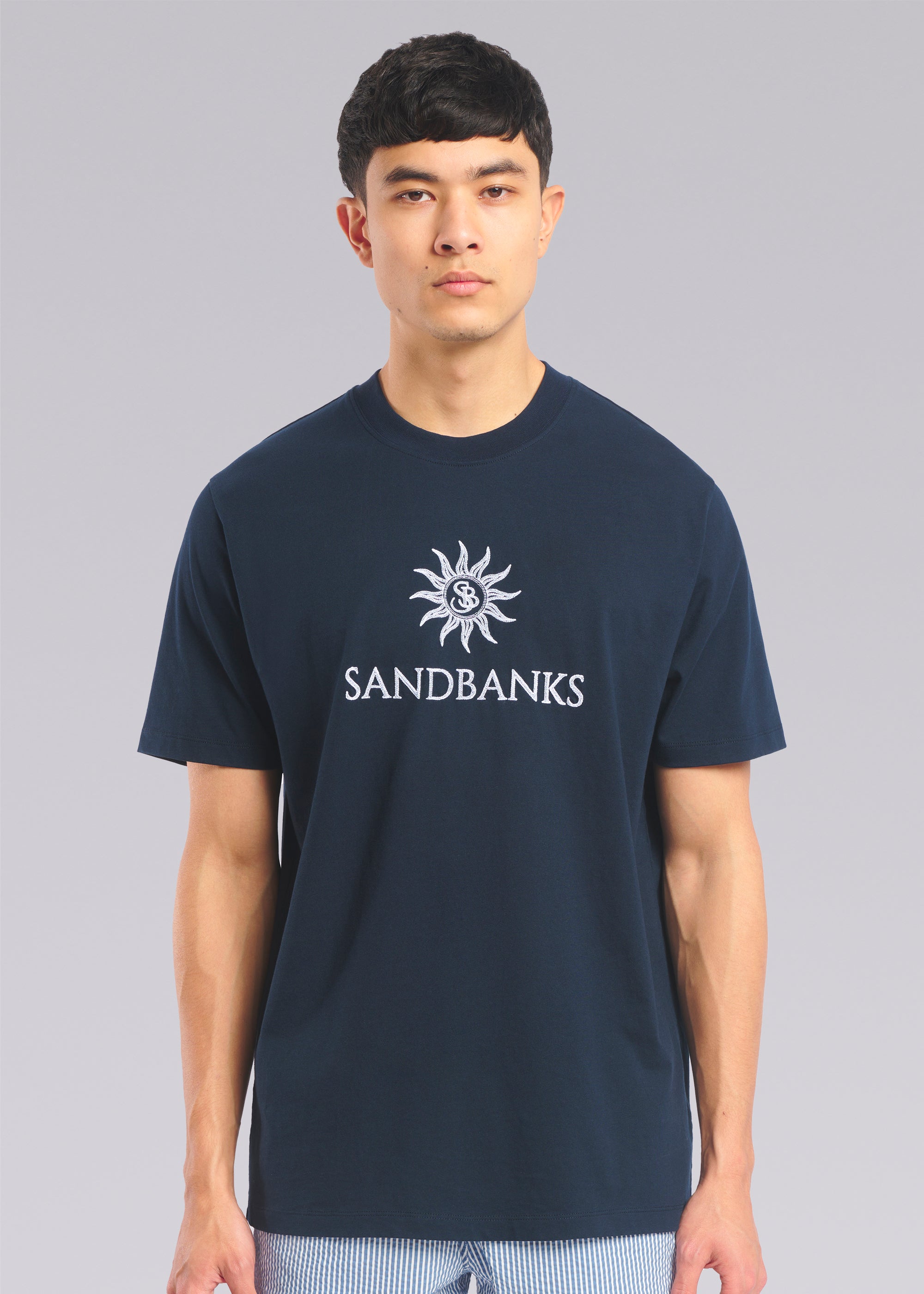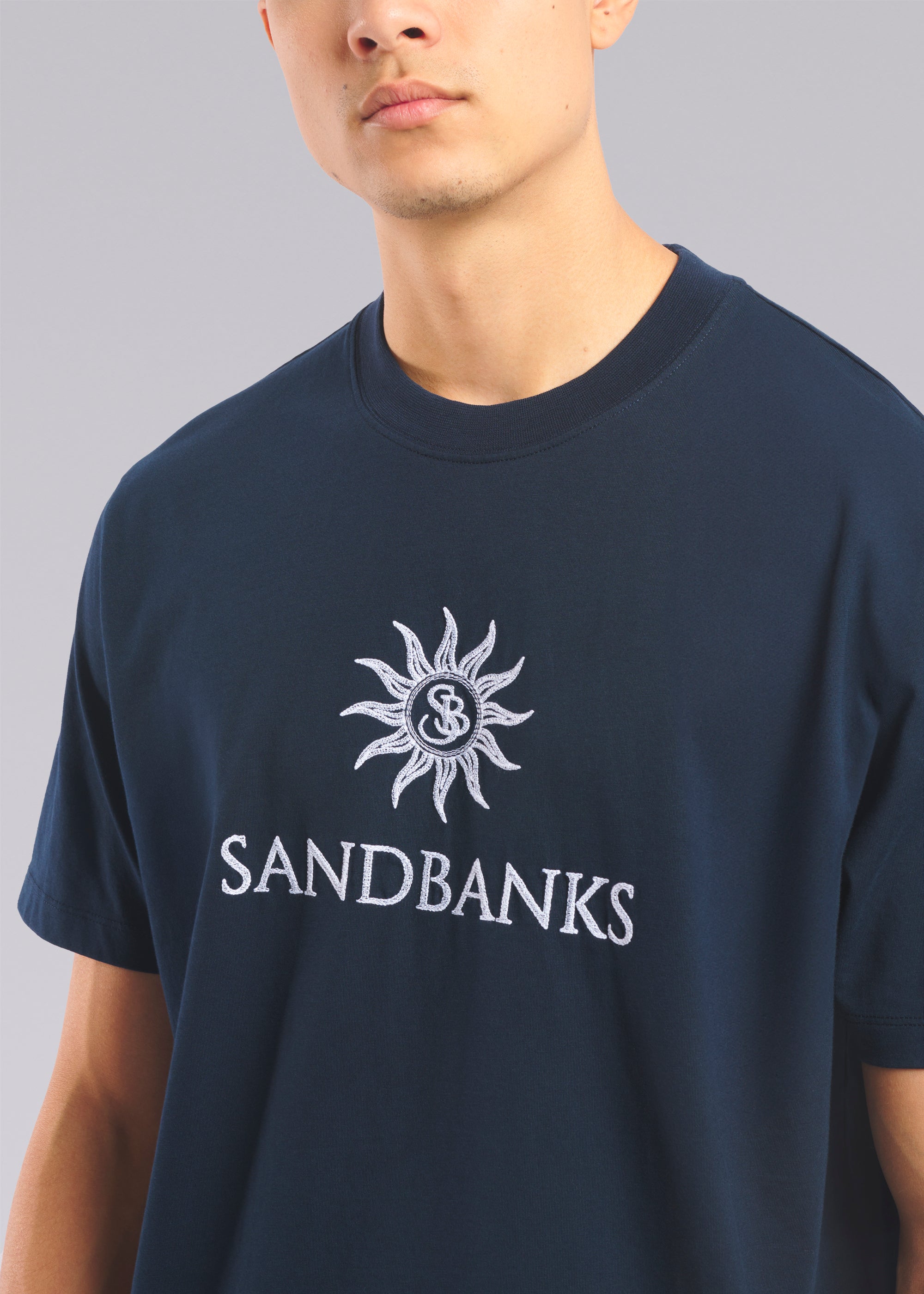 Sandbanks men's rope embroidery t-shirt in navy, made from 100% organic cotton. This relaxed fitting crew neck t-shirt features rope embroidered Sandbanks logo in white, and tri-colour back neck binding.