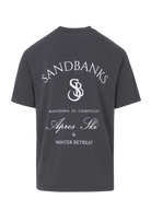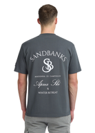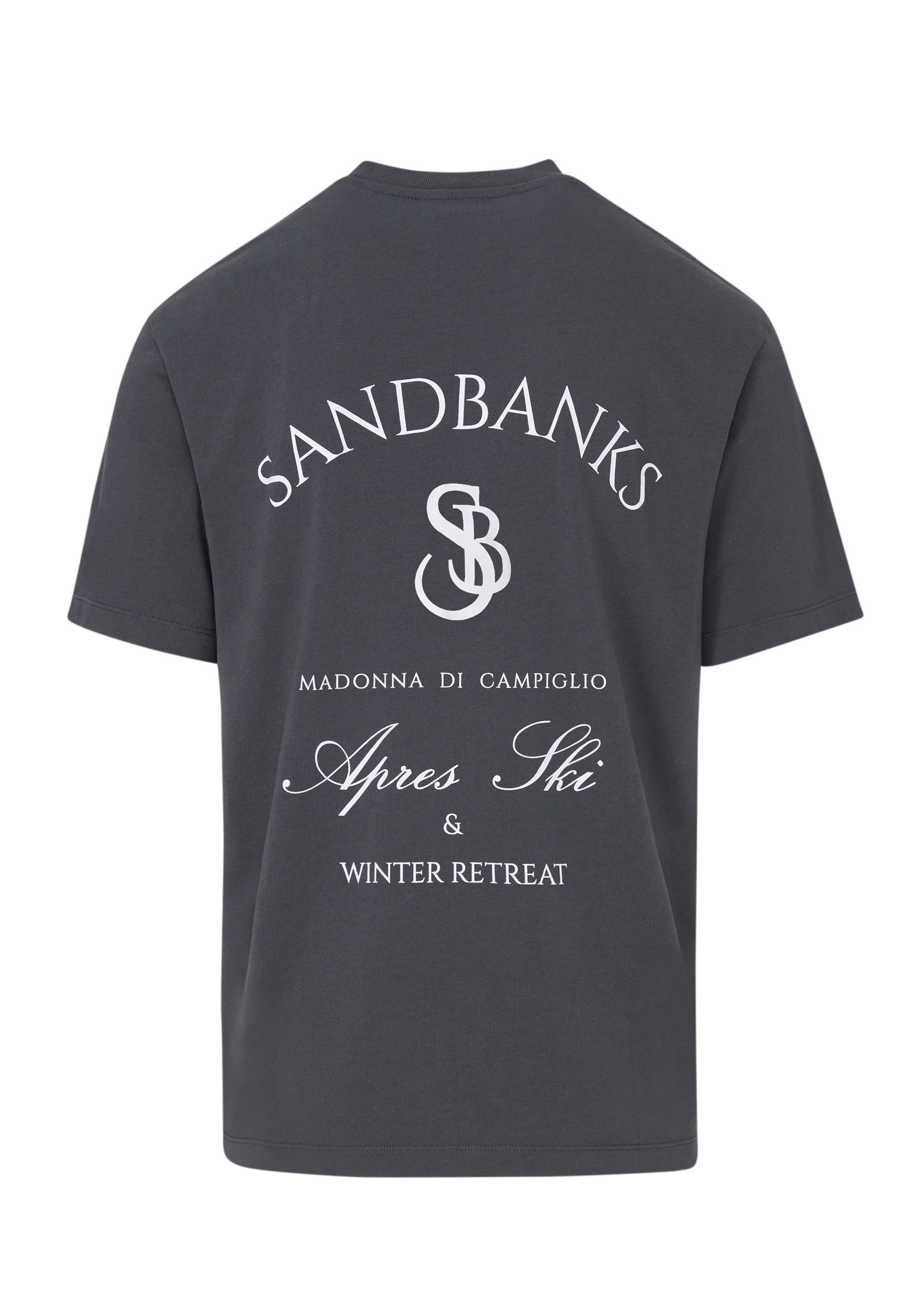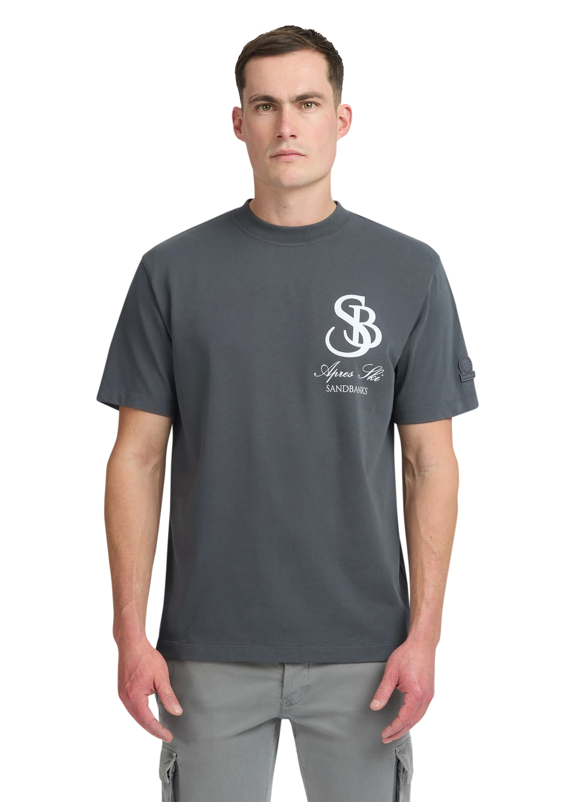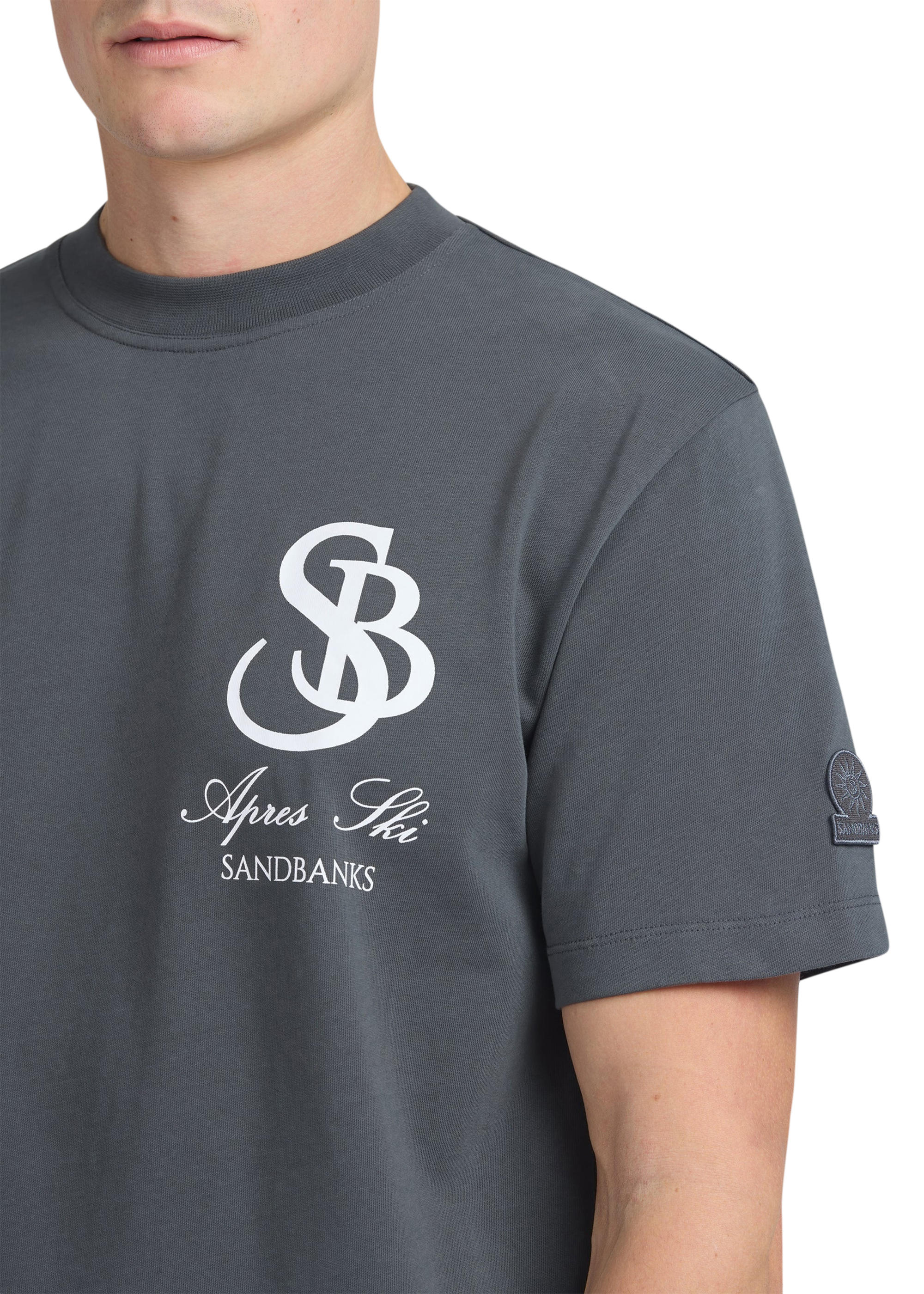 Our Sandbanks SB Après Ski t-shirt in anthracite is made from 100% BCI Cotton with tonal sleeve embroidered badge logo and statement white SB Après print. This edit captures the essence of outdoor exploration and the thrill of adventure, bringing the spirit of the mountains and the freedom of the open air into everyday wear.