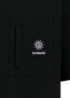 Sandbanks zip pocket T-shirt in black, crafted from premium 350gsm cotton interlock. Designed with a functional zip pocket highlighted by a contrasting silicone Sandbanks badge logo, and finished with a signature tri-colour back neck binding.
