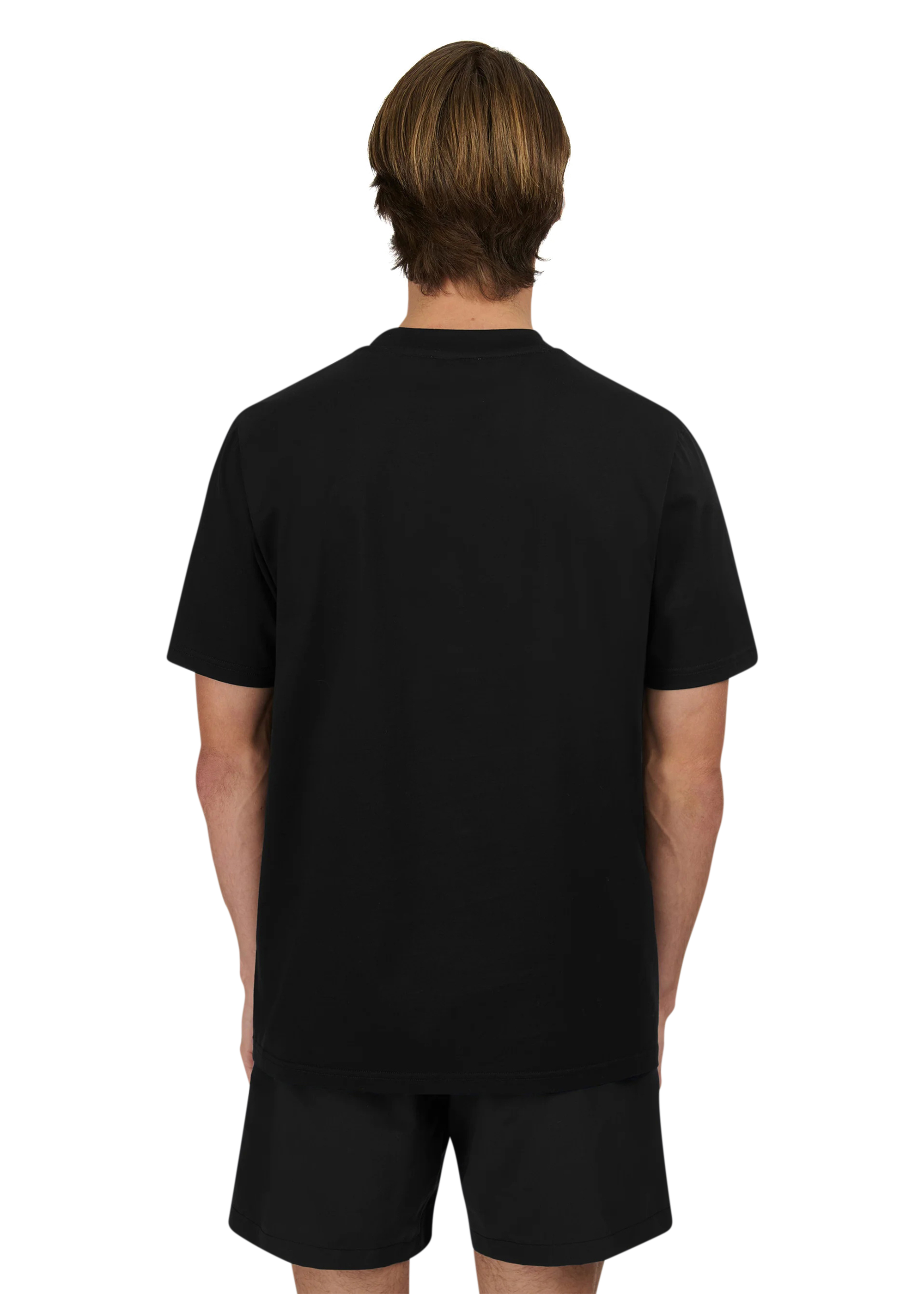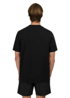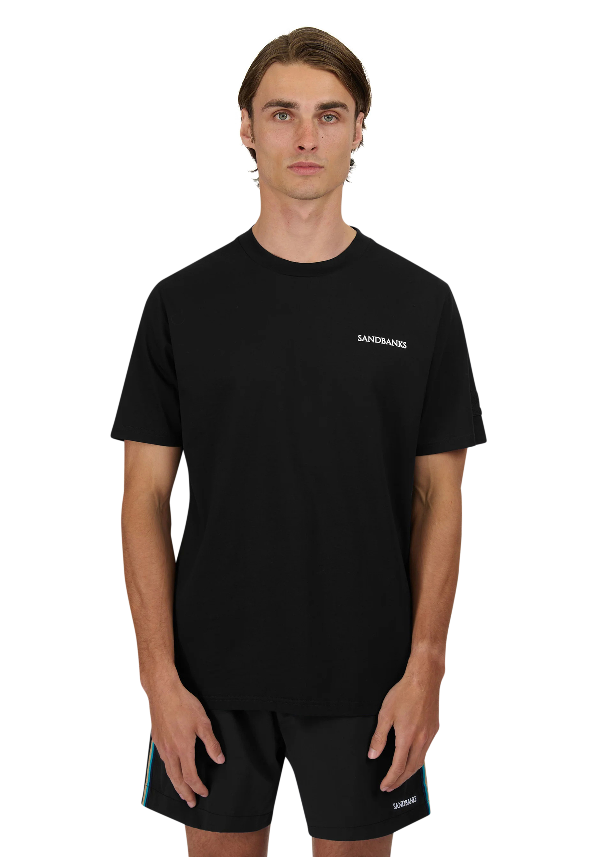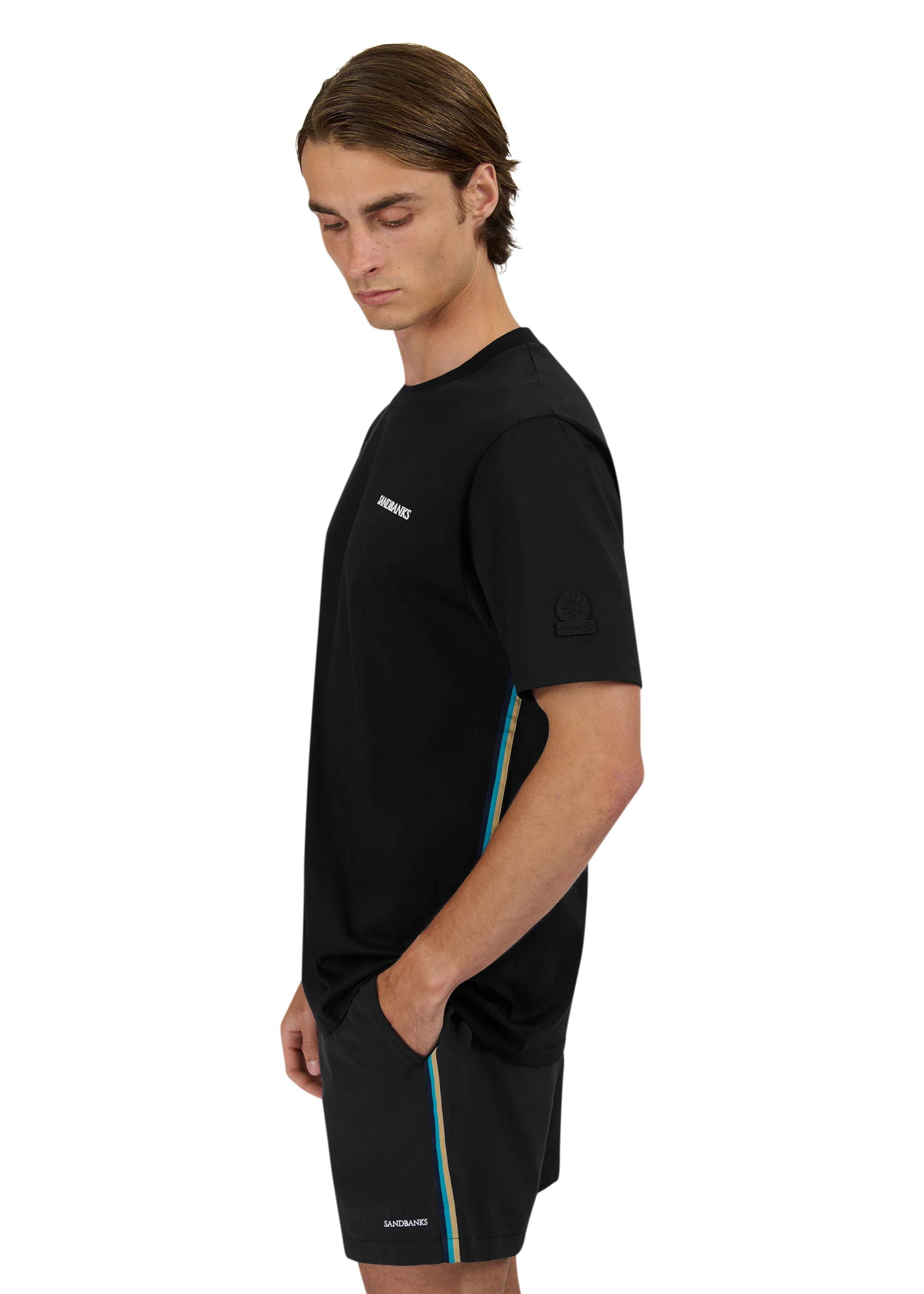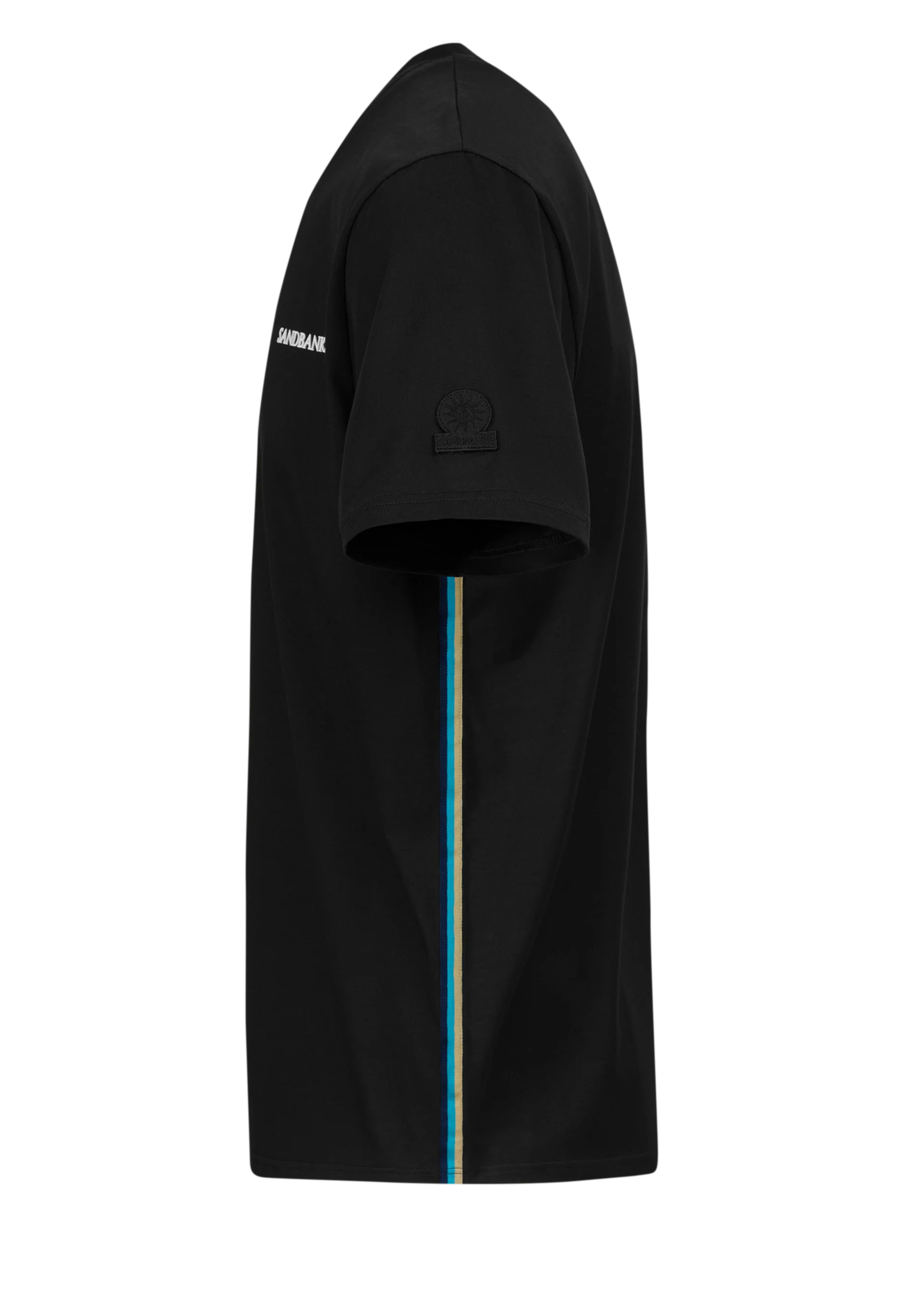 Sandbanks side stripe t-shirt in black, made from mercerised 100% bci cotton with a silky and luxurious feel. This relaxed fitting crew neck t-shirt features a raised rubber 'Sandbanks' print on the chest in white, a tonal embroidered logo badge on the sleeve and tri-colour tape on the side seam.