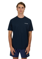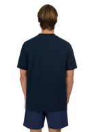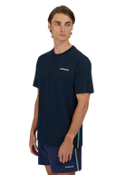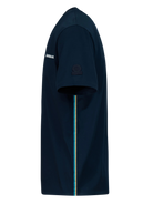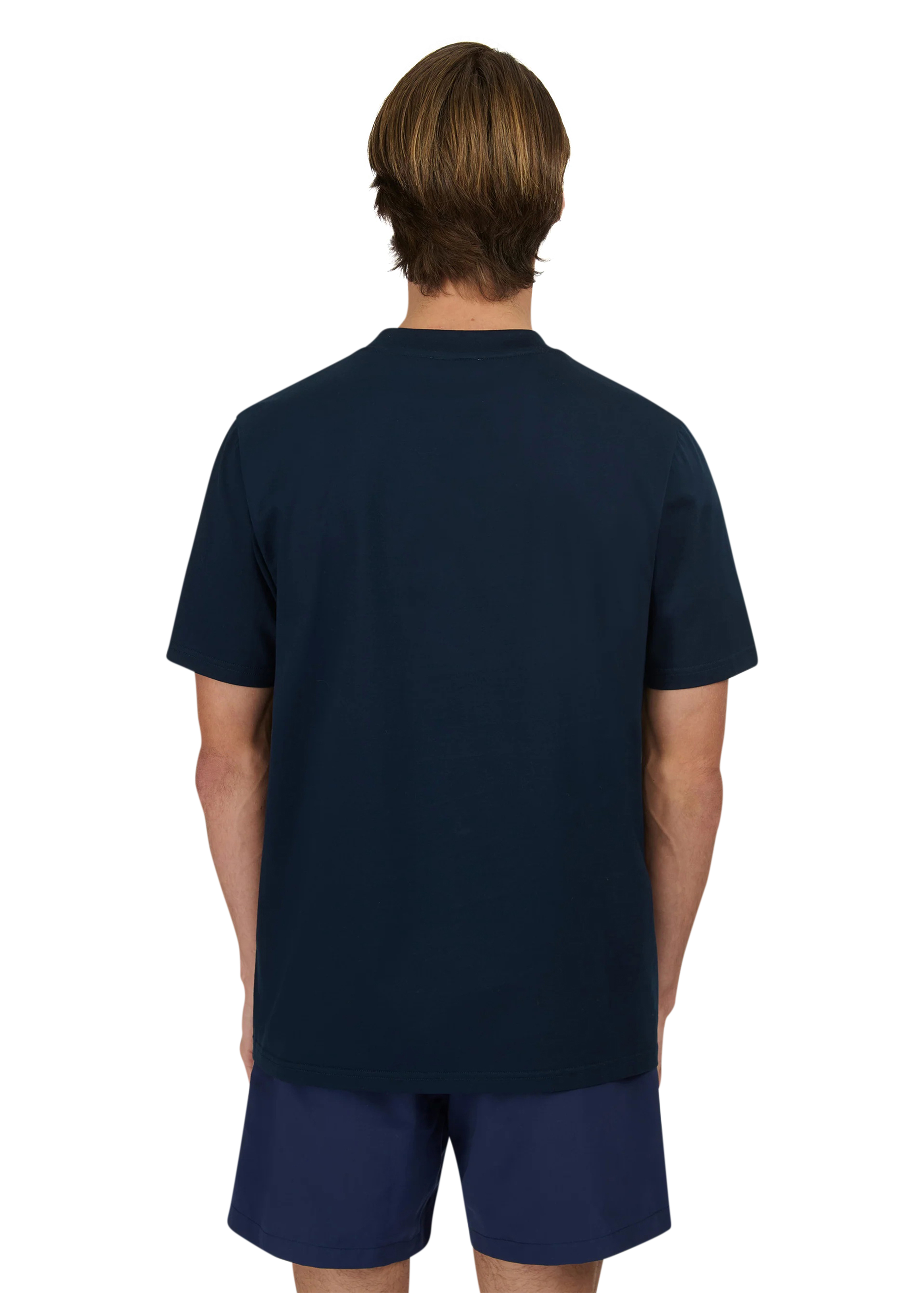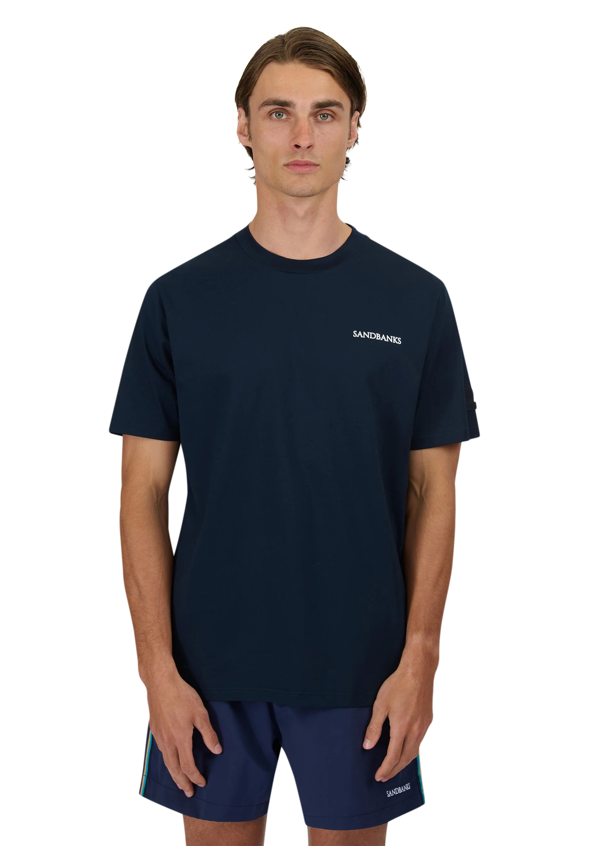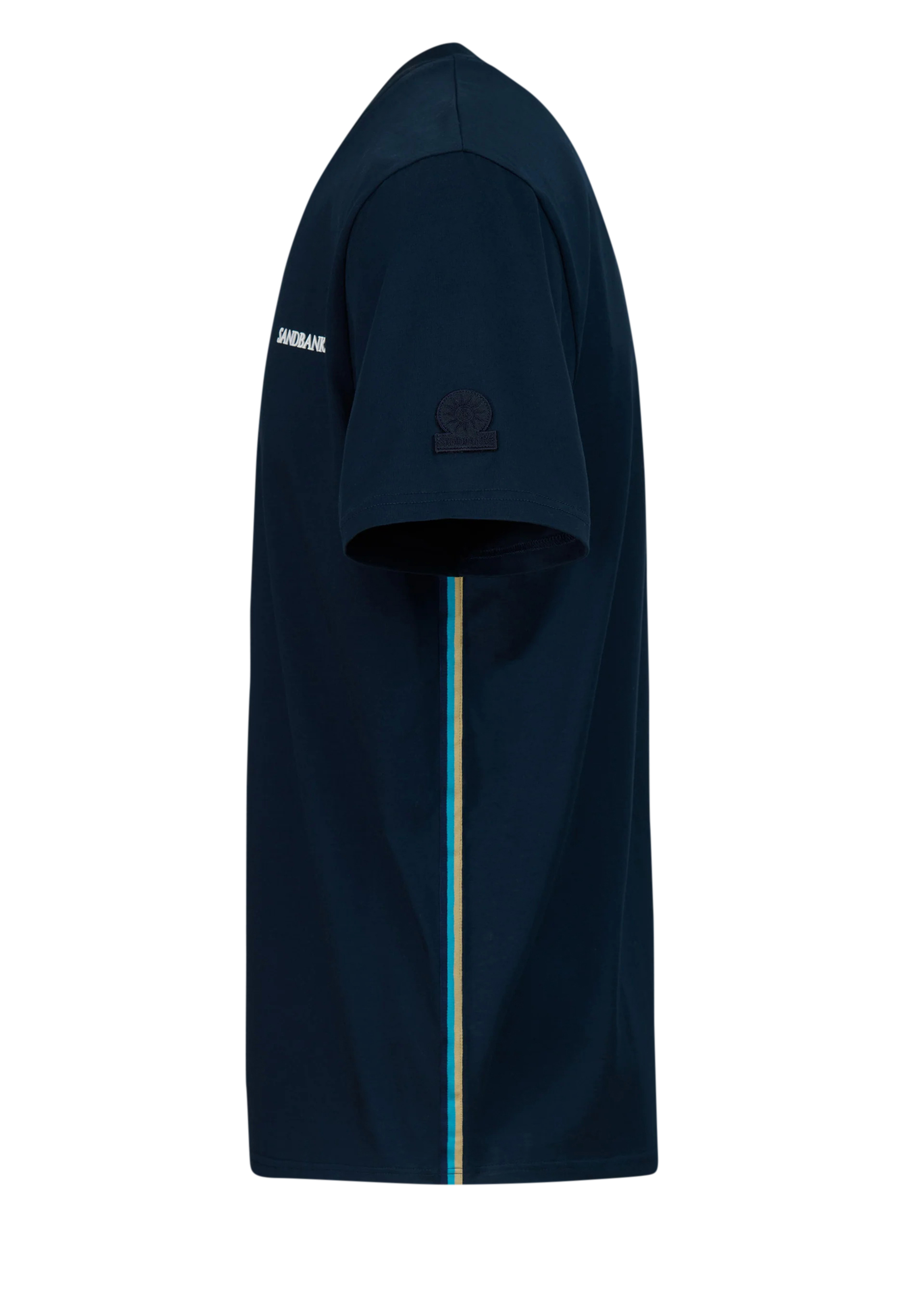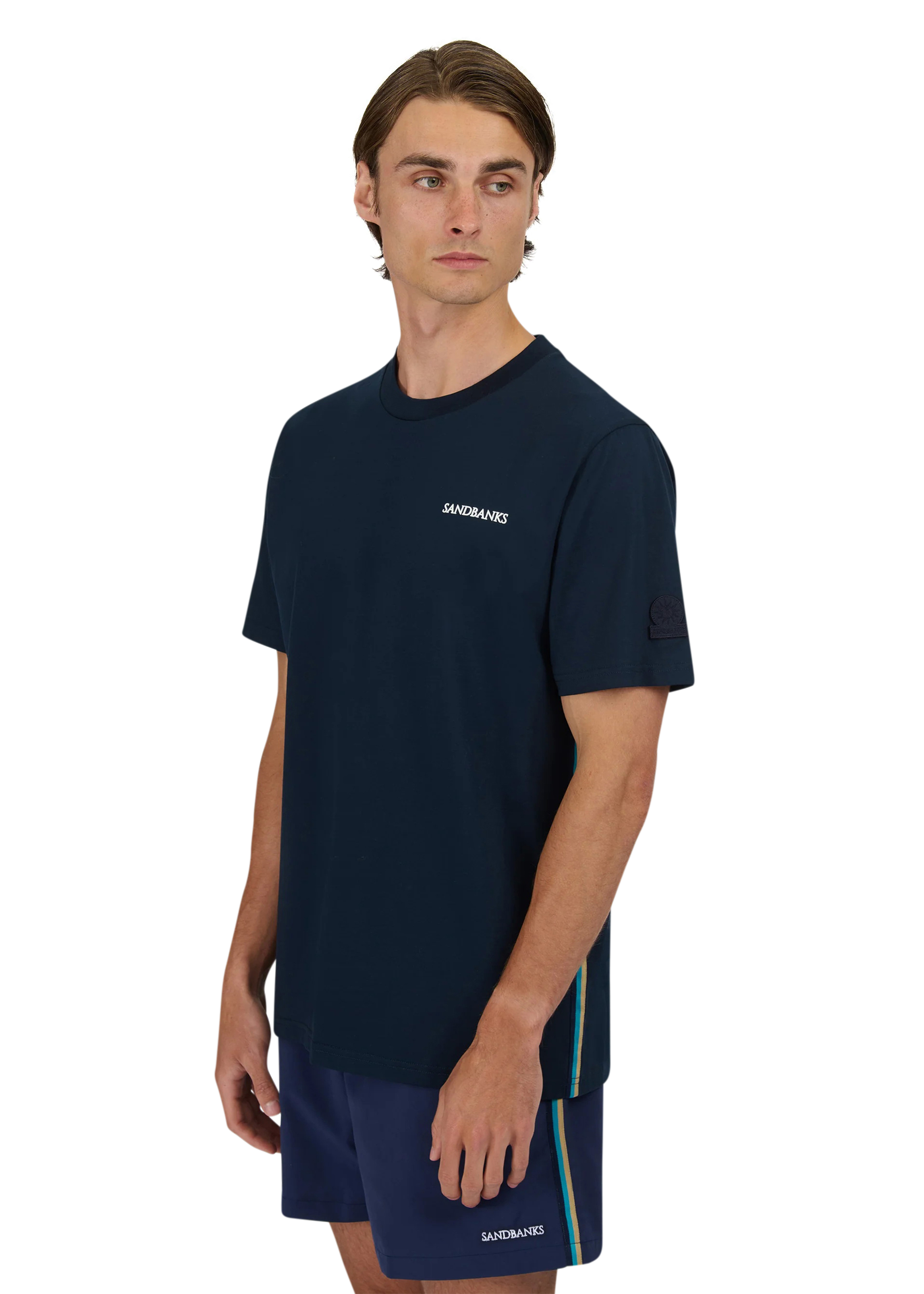 Sandbanks side stripe t-shirt in navy, made from mercerised 100% bci cotton with a silky and luxurious feel. This relaxed fitting crew neck t-shirt features a raised rubber 'Sandbanks' print on the chest in white, a tonal embroidered logo badge on the sleeve and tri-colour tape on the side seam.