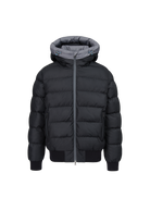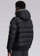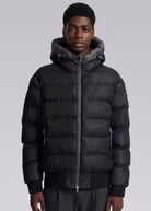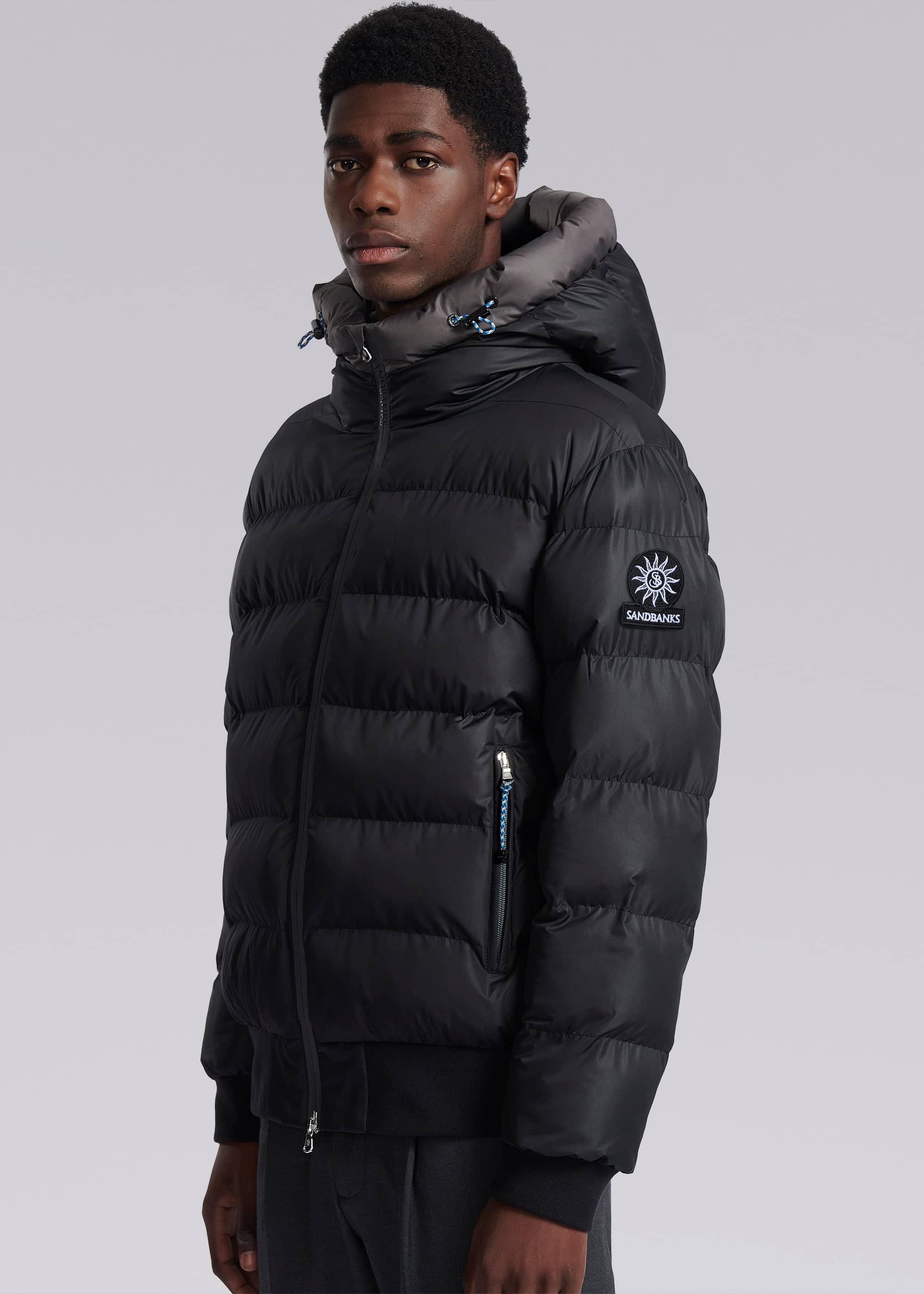Sandbanks Après puffer jacket in black the look and feel of a bomber jacket with the warmth and lightness of a puffer. This luxury Sandbanks jacket features an Italian Lampo silicone zip with subtle printed logo, coil zip side entry pockets with fleece lining for warmth and comfort, enamel components, signature tri-colour cord details and ribbed hem and cuffs.