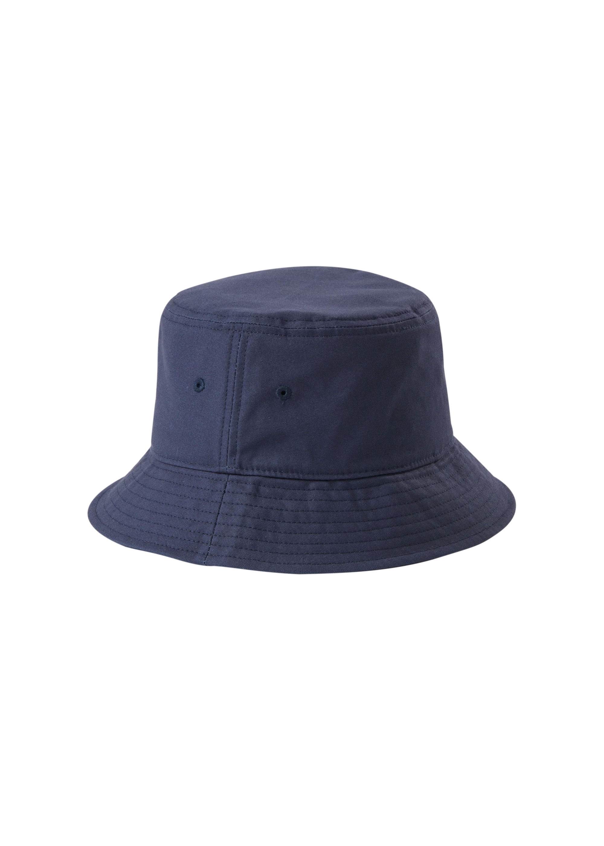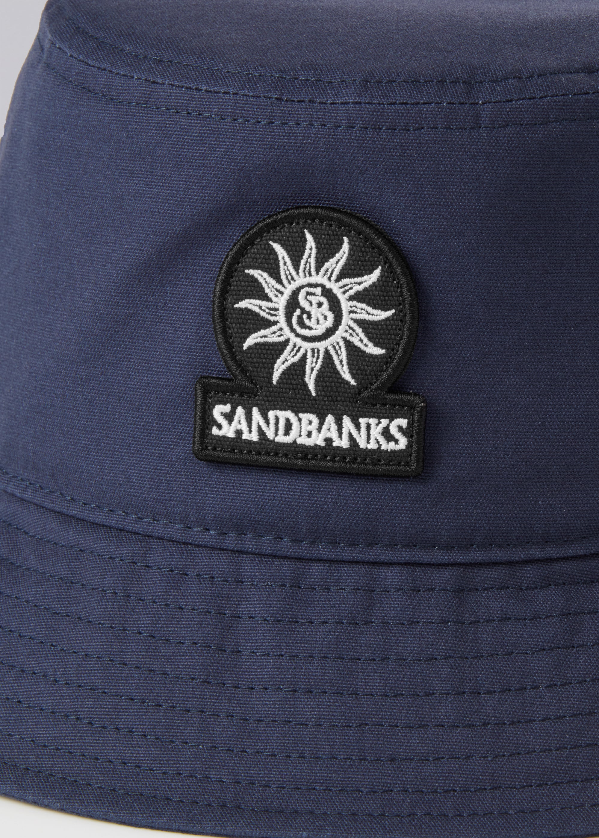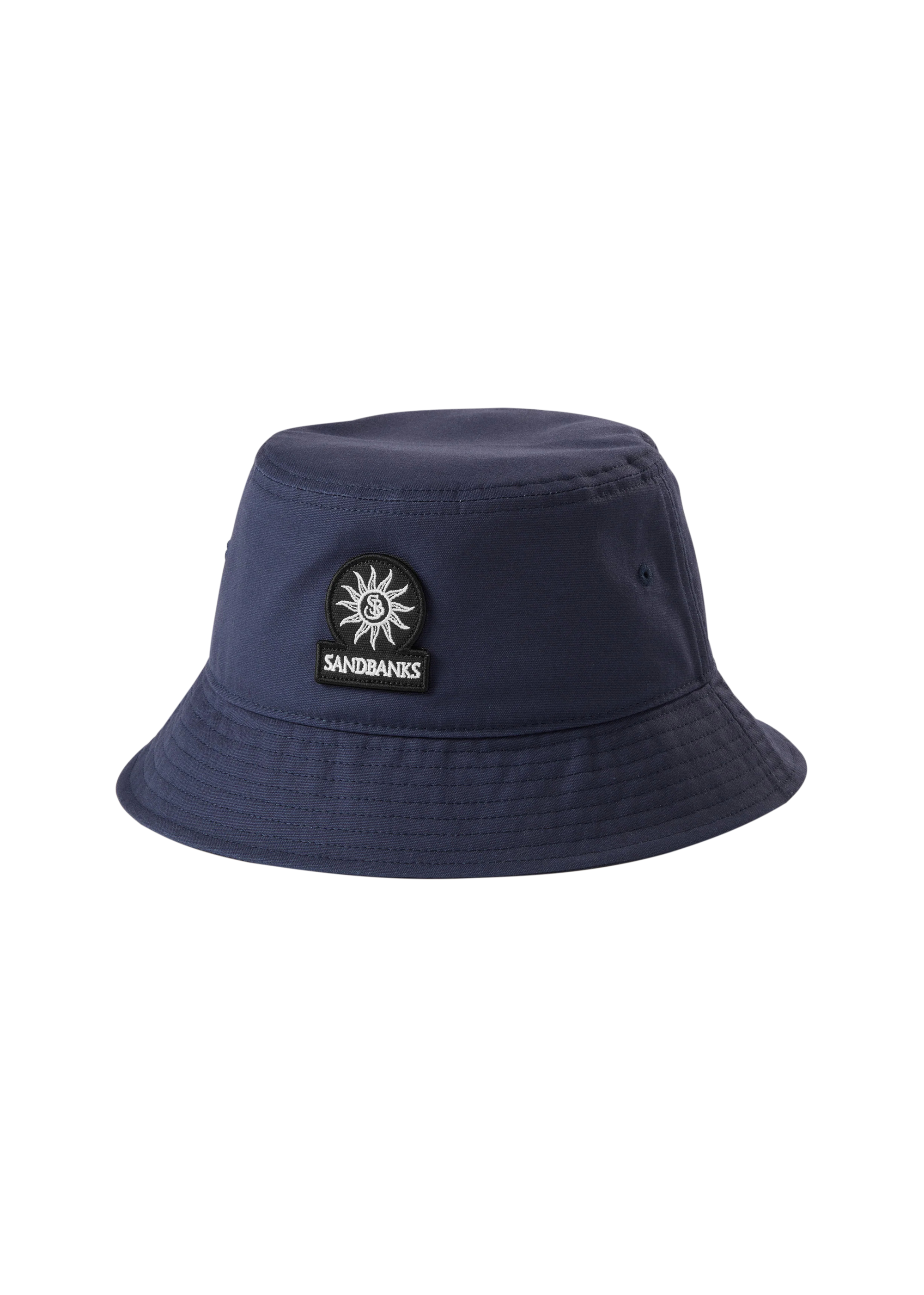 Sandbanks badge logo bucket hat in navy made from 100% organic cotton, featuring black badge logo with white embroidery, internal Sandbanks binding and embroidered eyelets.