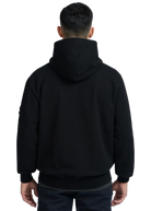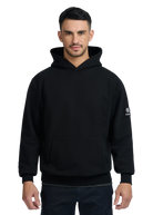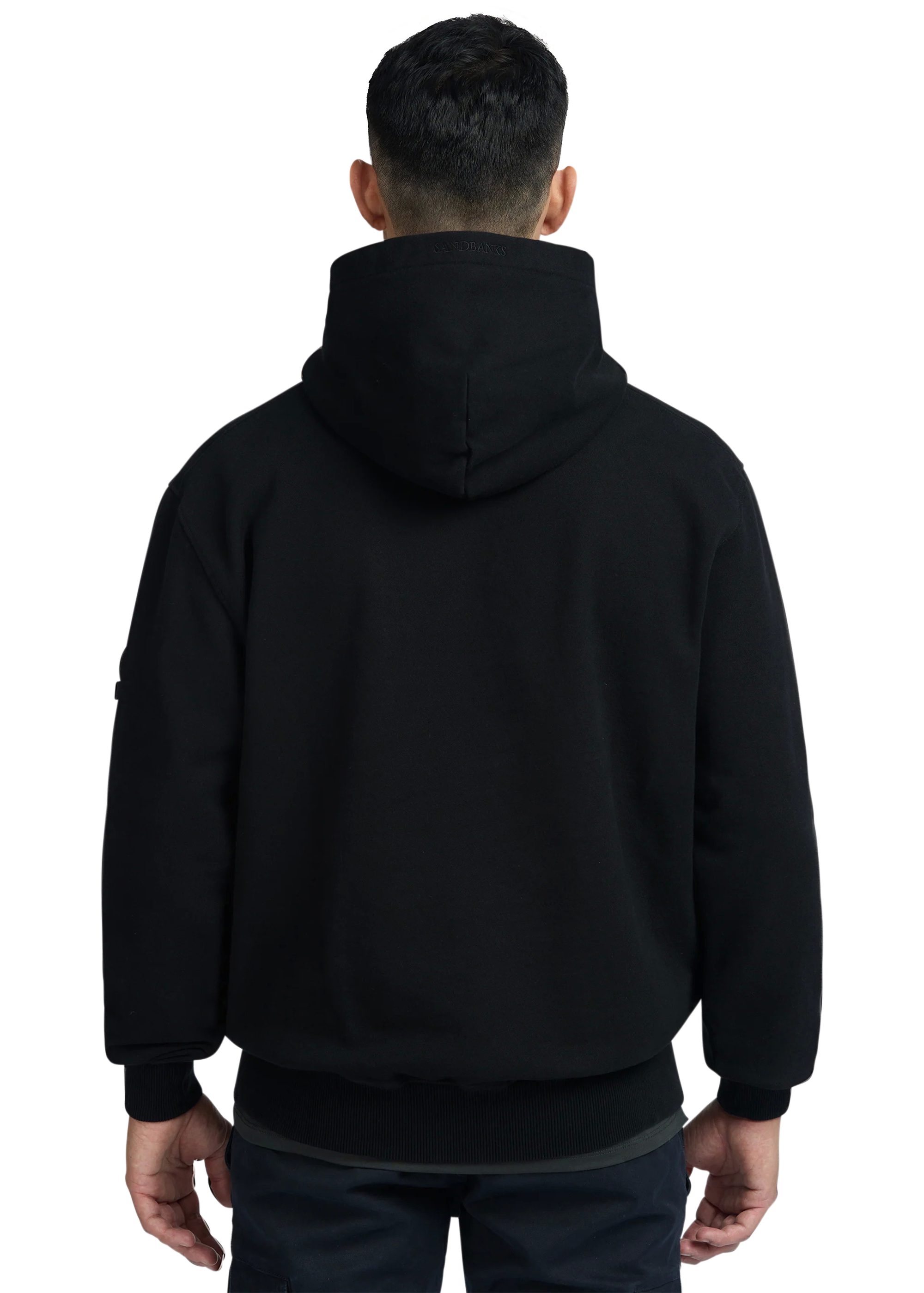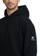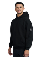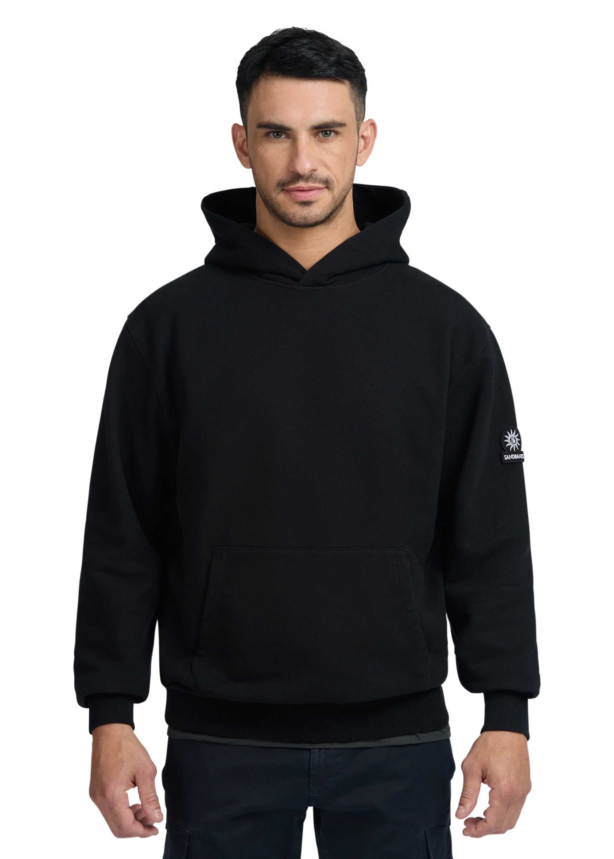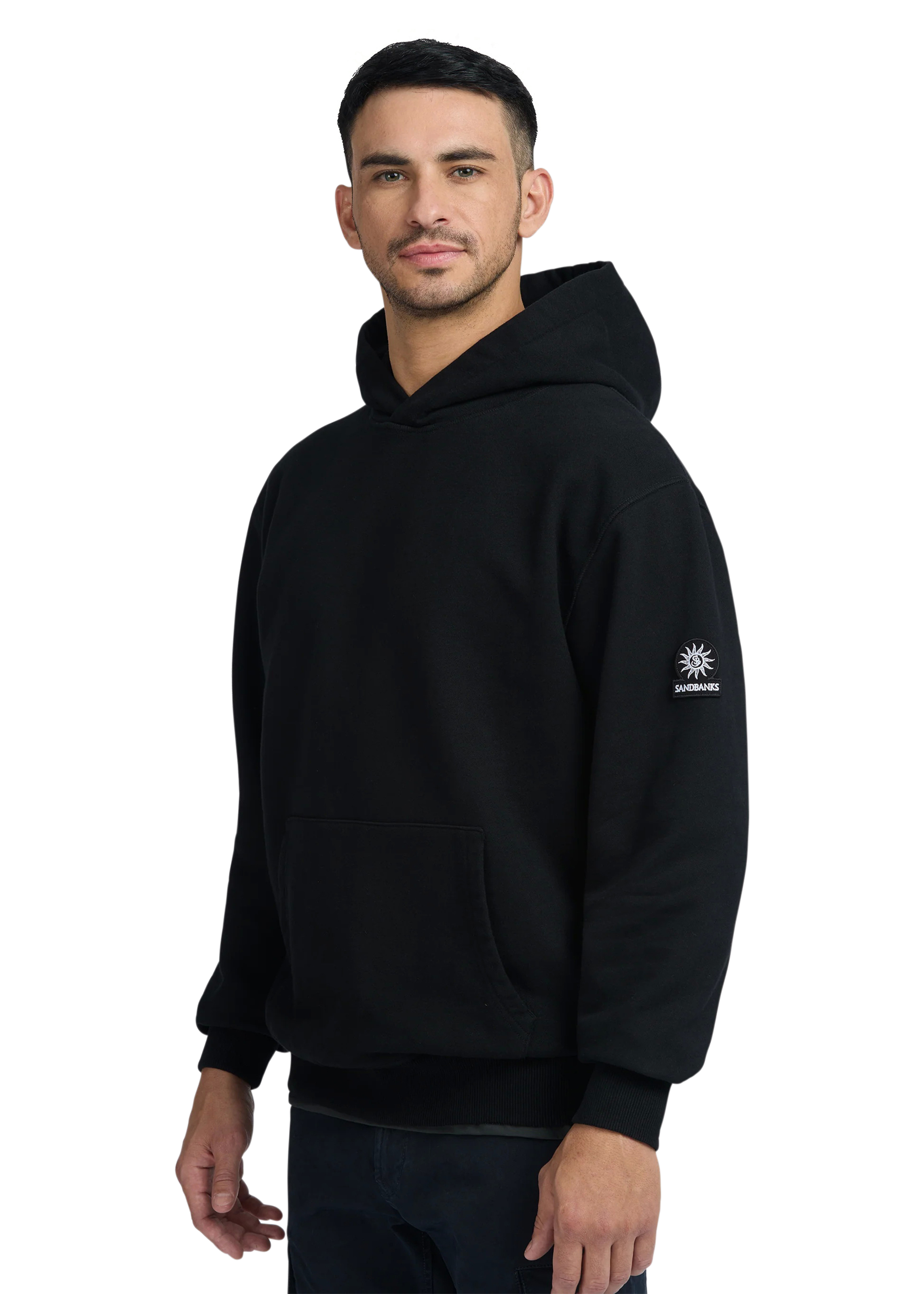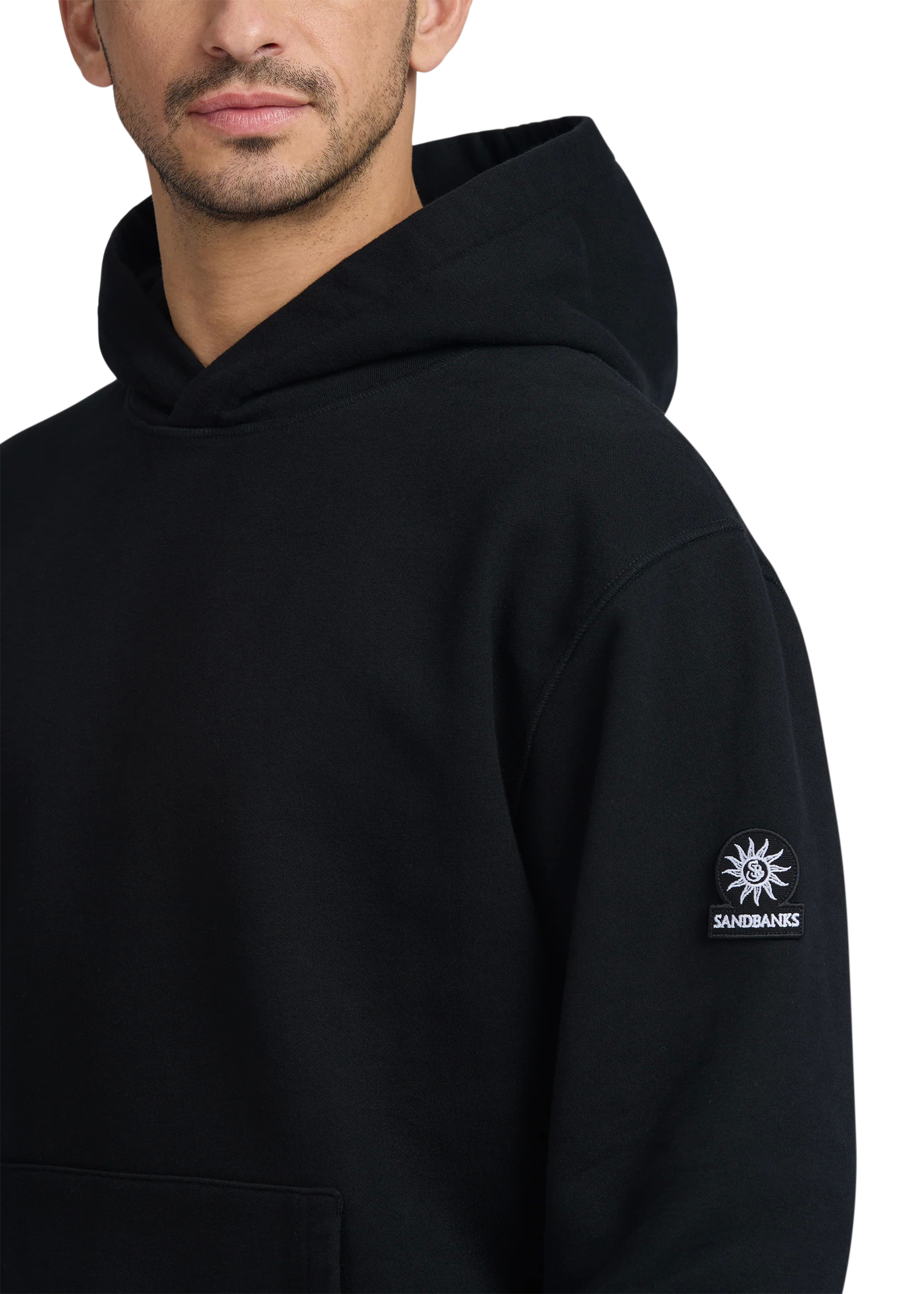 Our new and improved men's Sandbanks badge logo hoodie in black. This garment has been upgraded with a 400gsm diagonal knitted fabric that features a slight brushed back for a superior soft feeling and warmth, whilst remaining breathable. Made from 100% BCI Cotton with a sleeve embroidered badge logo and cover stitch details.
