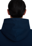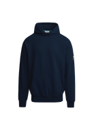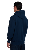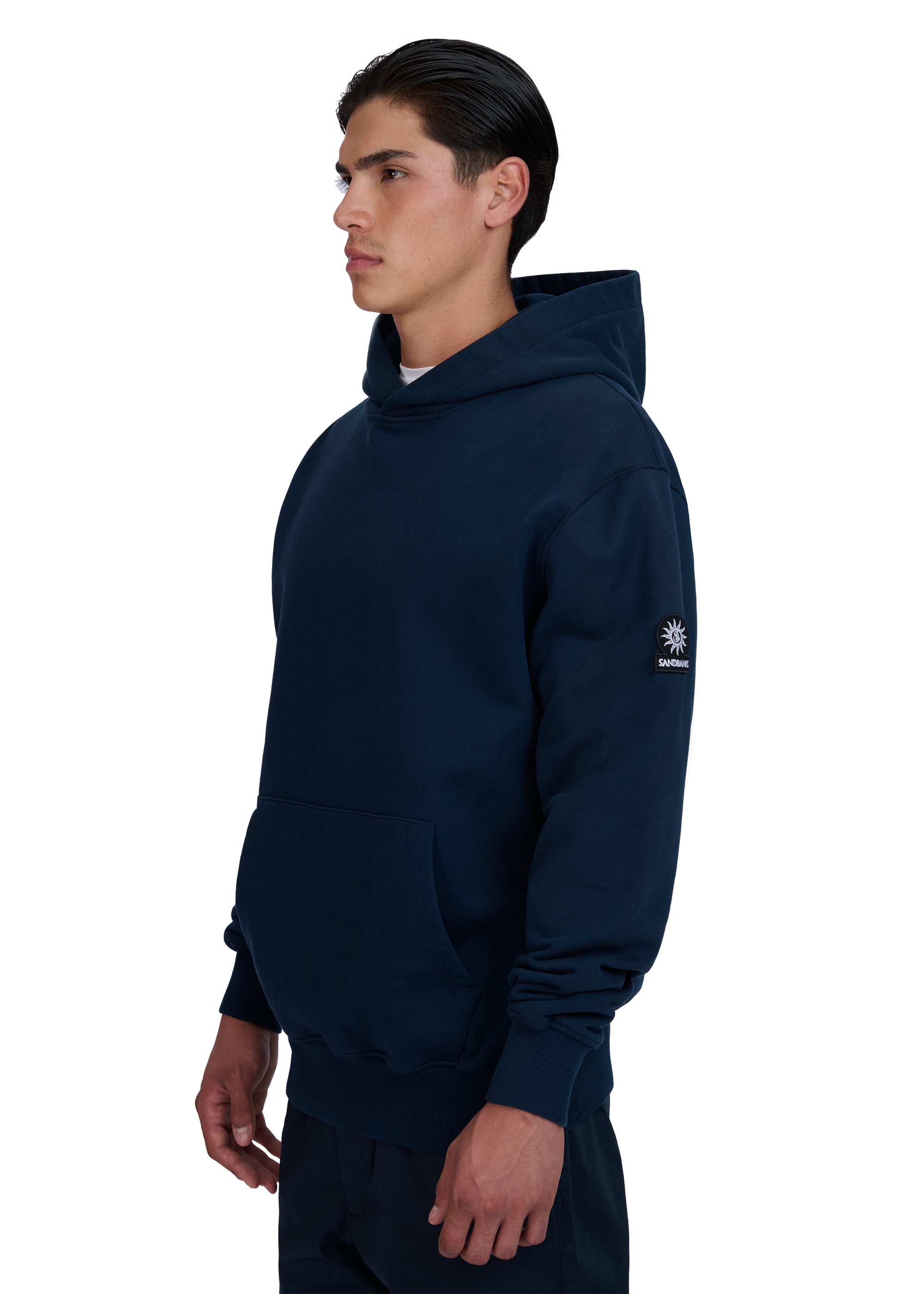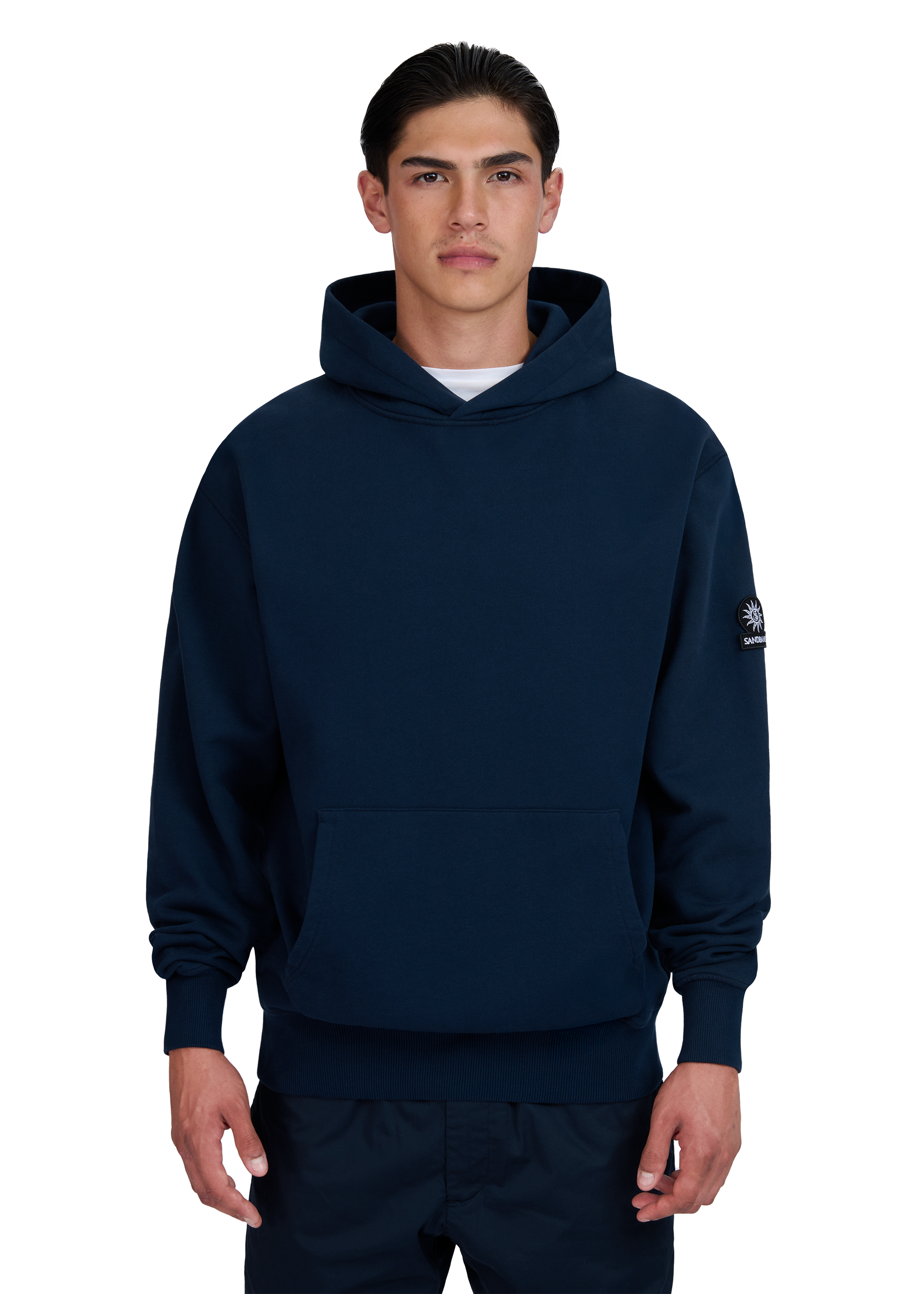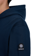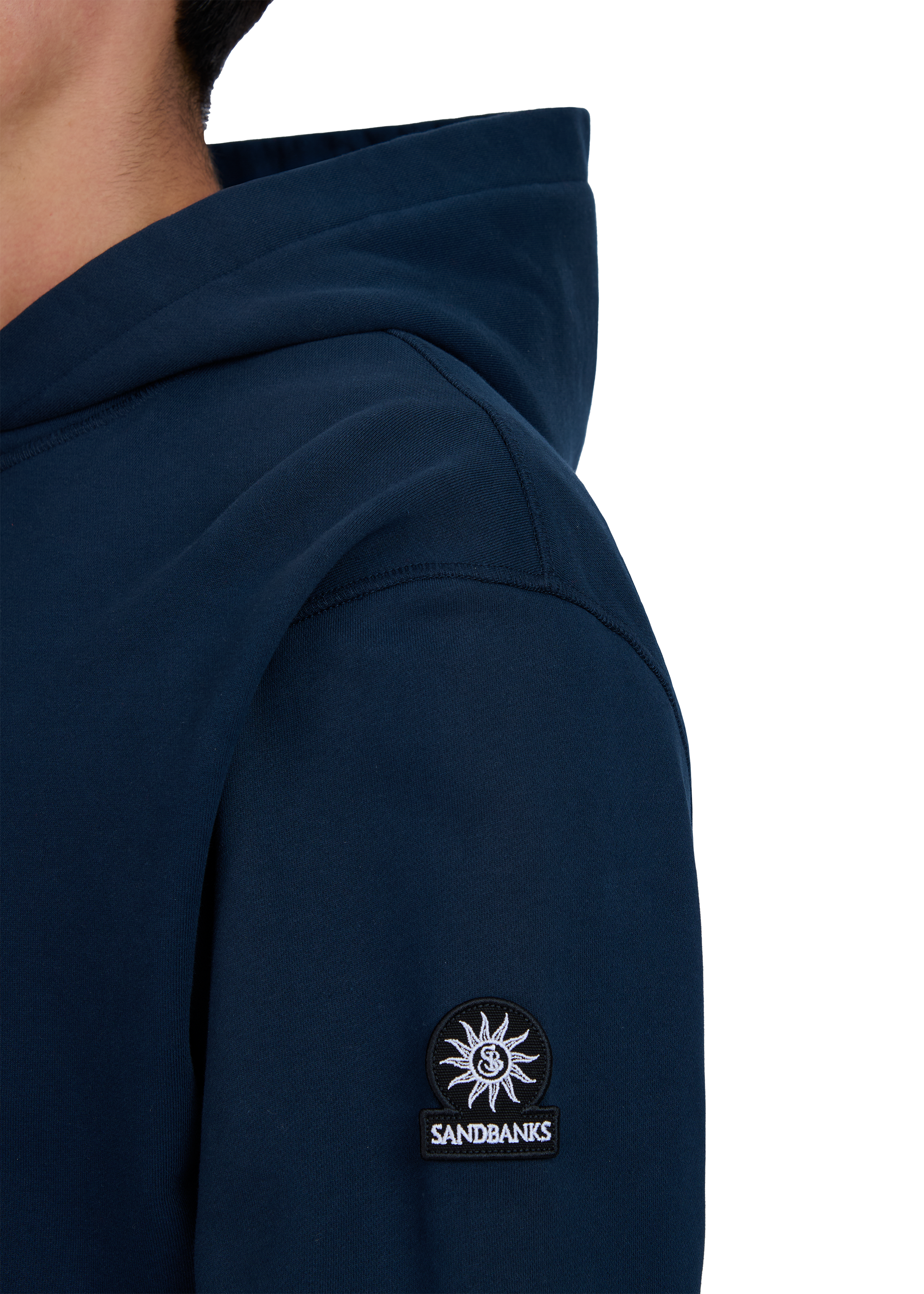Our new and improved men's Sandbanks badge logo hoodie in navy. This garment has been upgraded with a 380gsm diagonal knitted fabric that features a slight brushed back for a superior soft feeling and warmth, whilst remaining breathable. Made from a 97% cotton 3% elastane for improved feel, shape retention and finished with a sleeve embroidered badge logo and cover stitch details.