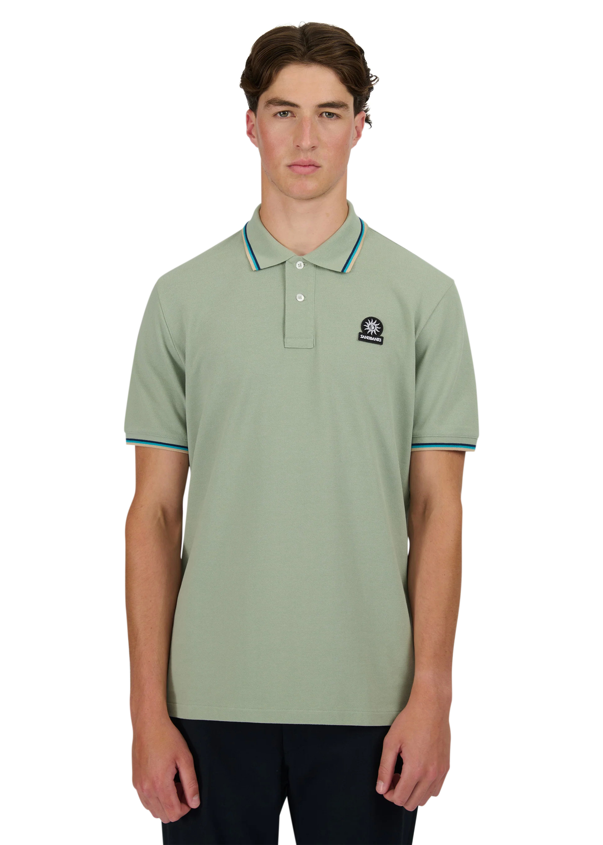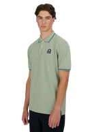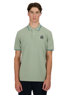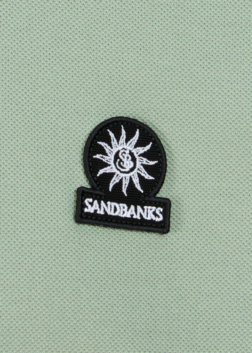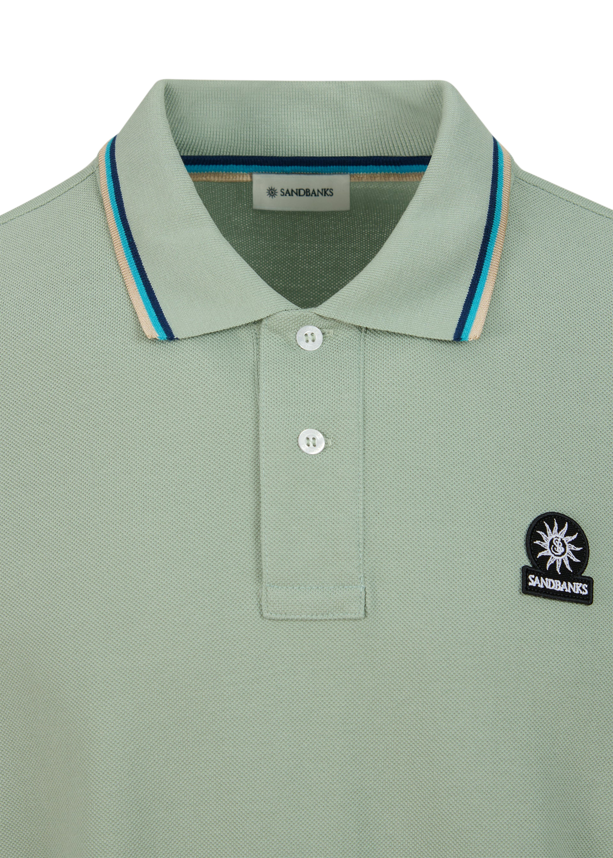Sandbanks men's badge logo polo shirt in sage, made from 100% organic cotton. This classic fitting 2 button polo shirt features an embroidered badge logo on the chest, tri-colour tipped ribbed collar, cuff and back neck binding.
