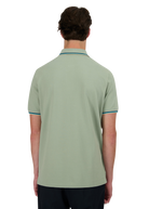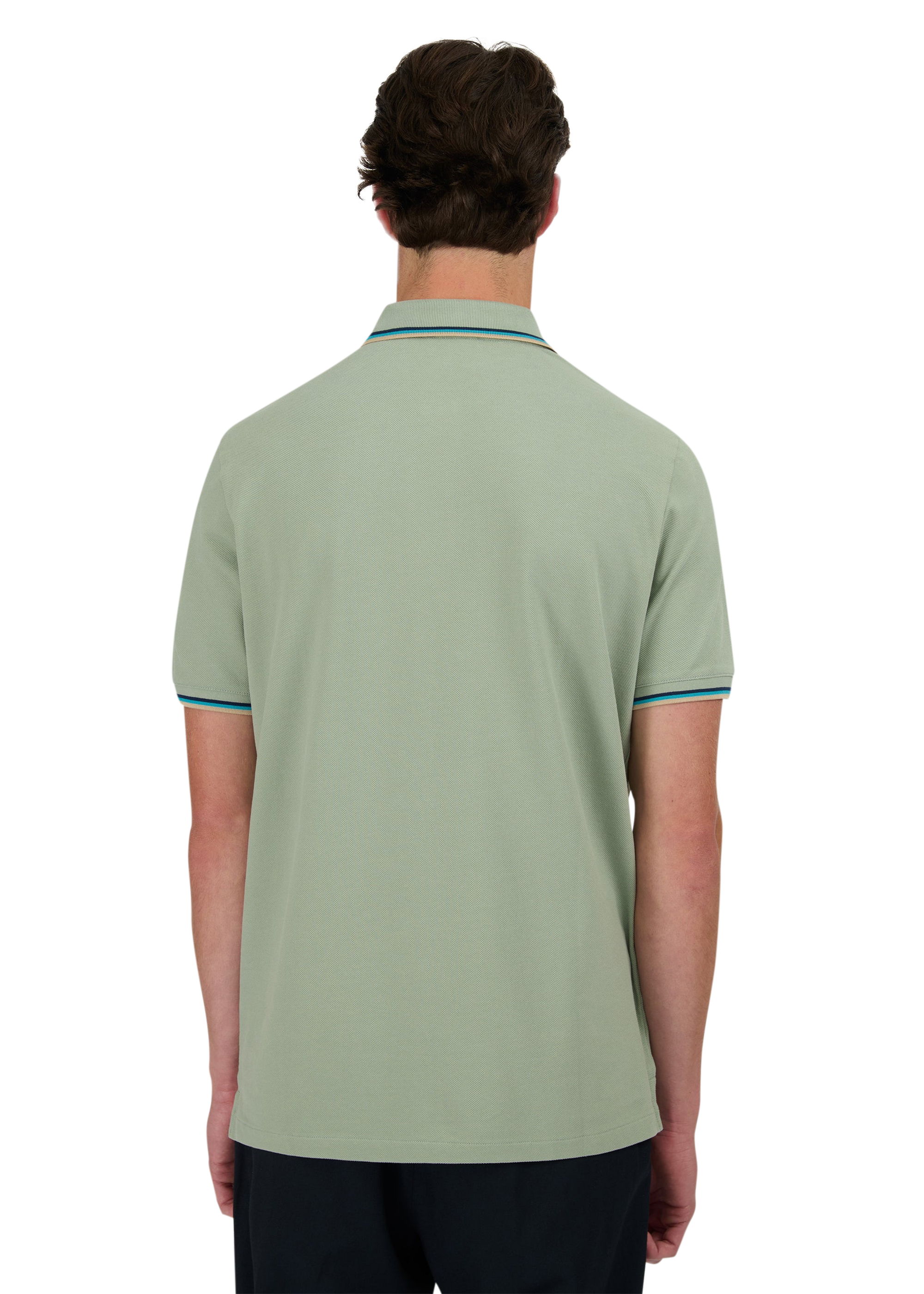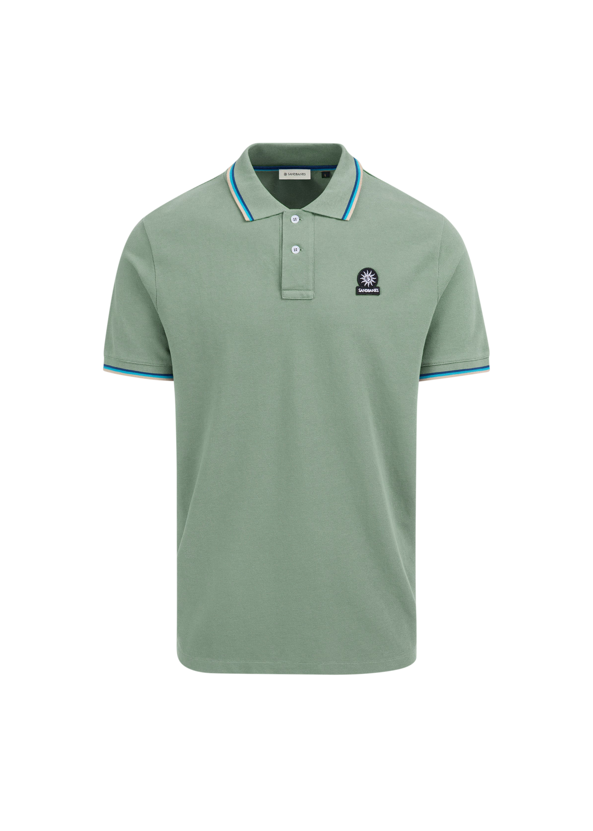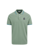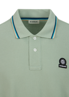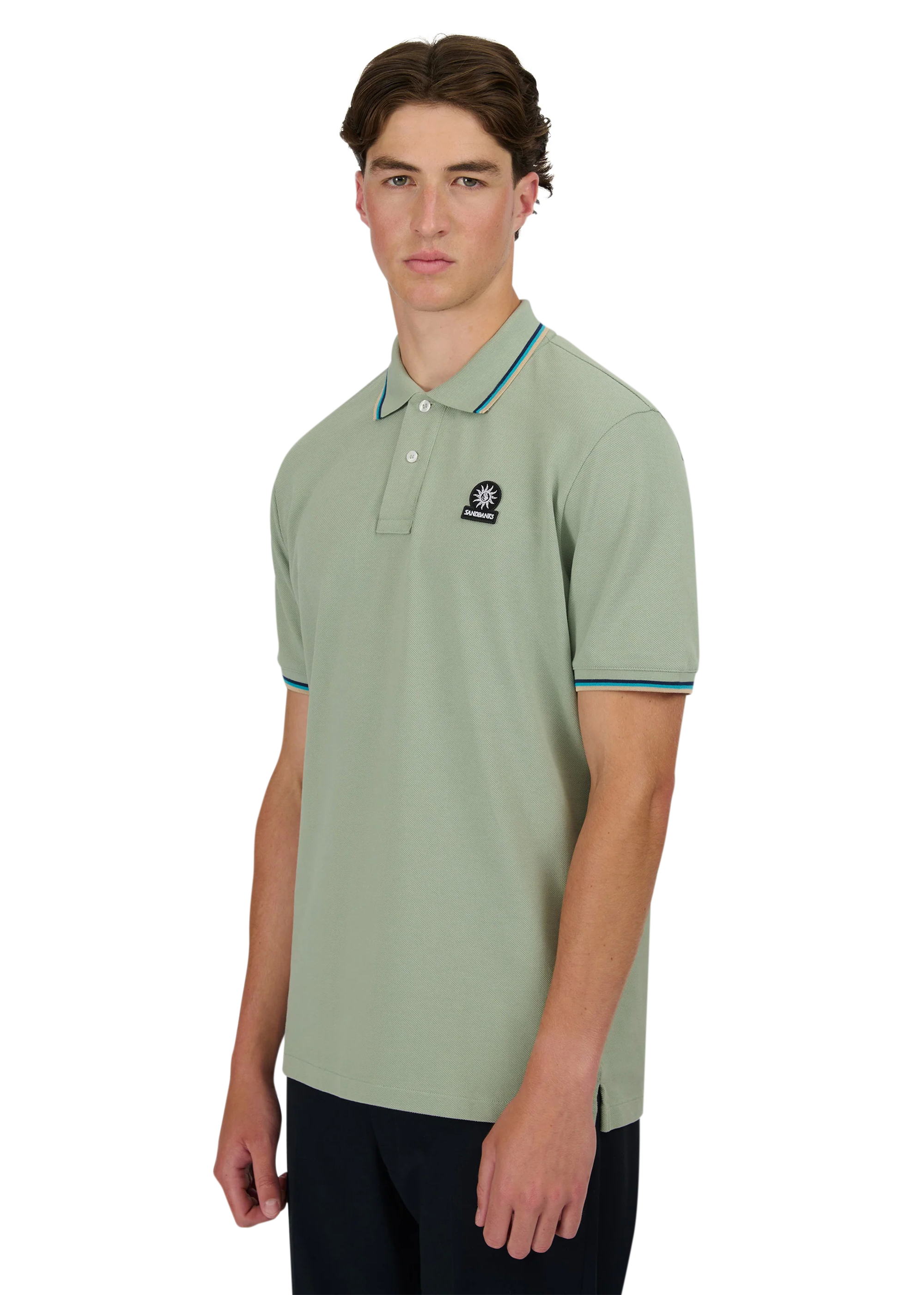 Sandbanks men's badge logo polo shirt in sage, made from 100% organic cotton. This classic fitting 2 button polo shirt features an embroidered badge logo on the chest, tri-colour tipped ribbed collar, cuff and back neck binding.