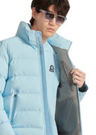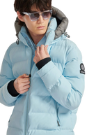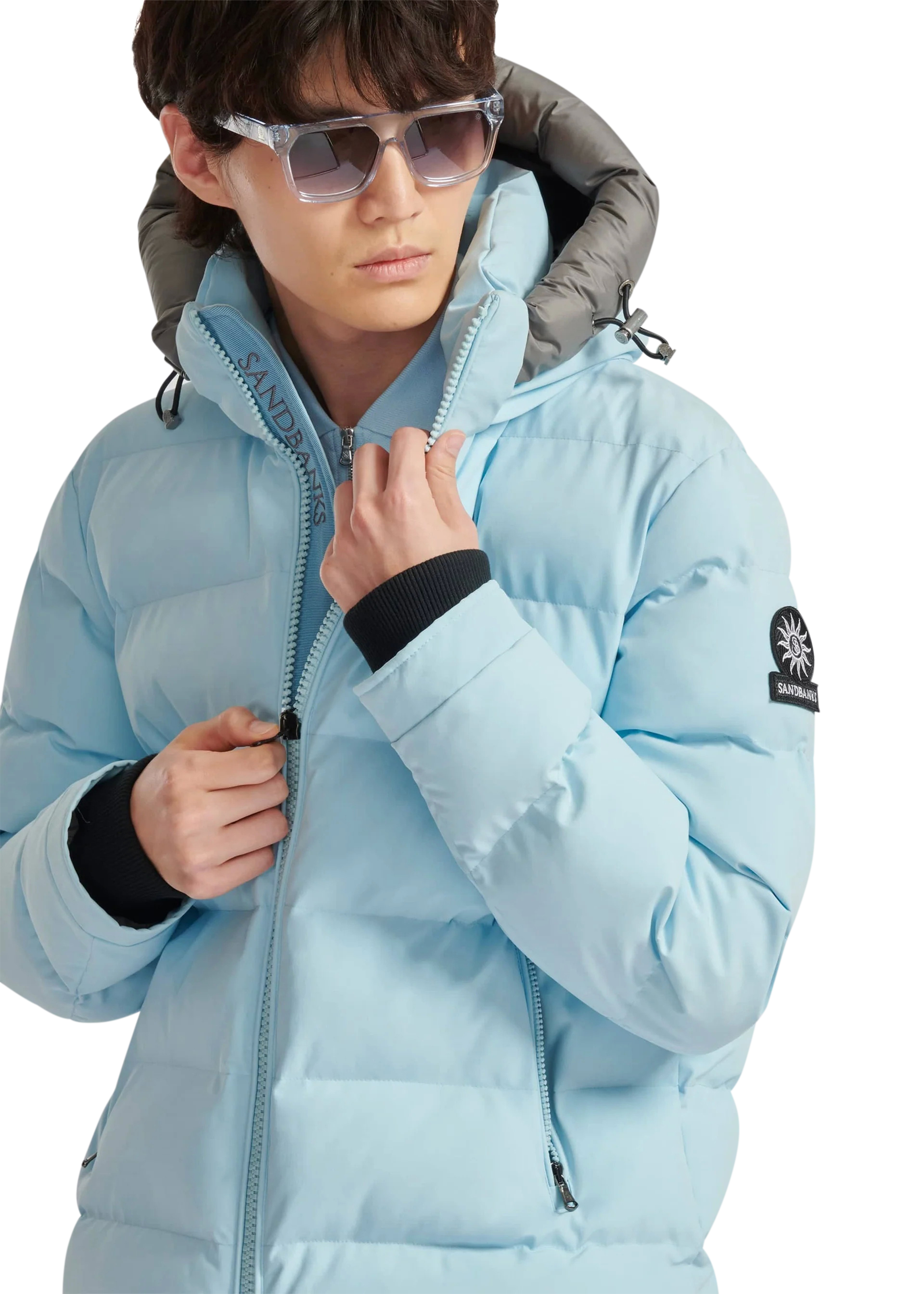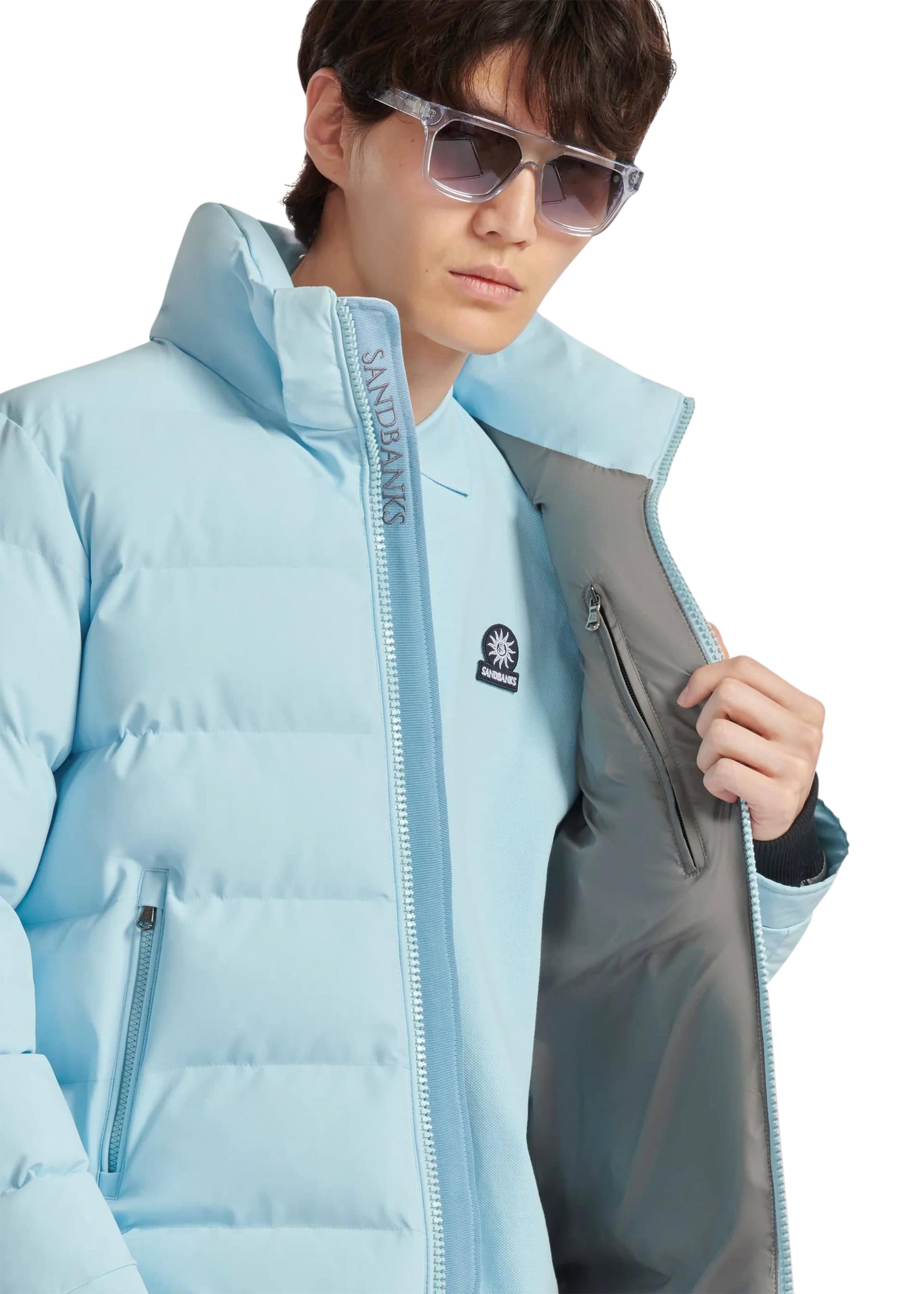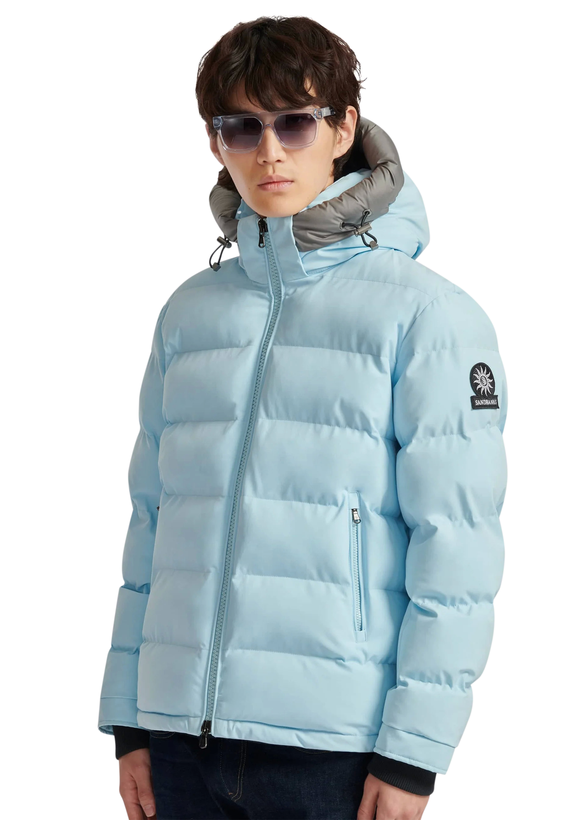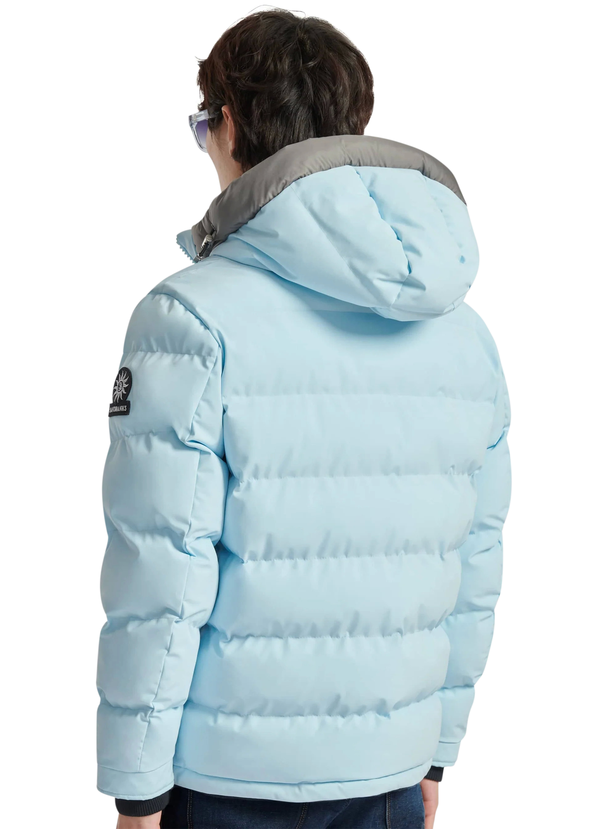 Sandbanks Banks puffer jacket is made almost entirely from recycled plastic bottles. With a crystal blue shell fabric, this jacket has high thermal retention and features a Sandbanks embroidered logo badges, large lower pocket/chest pocket details and detachable hood.