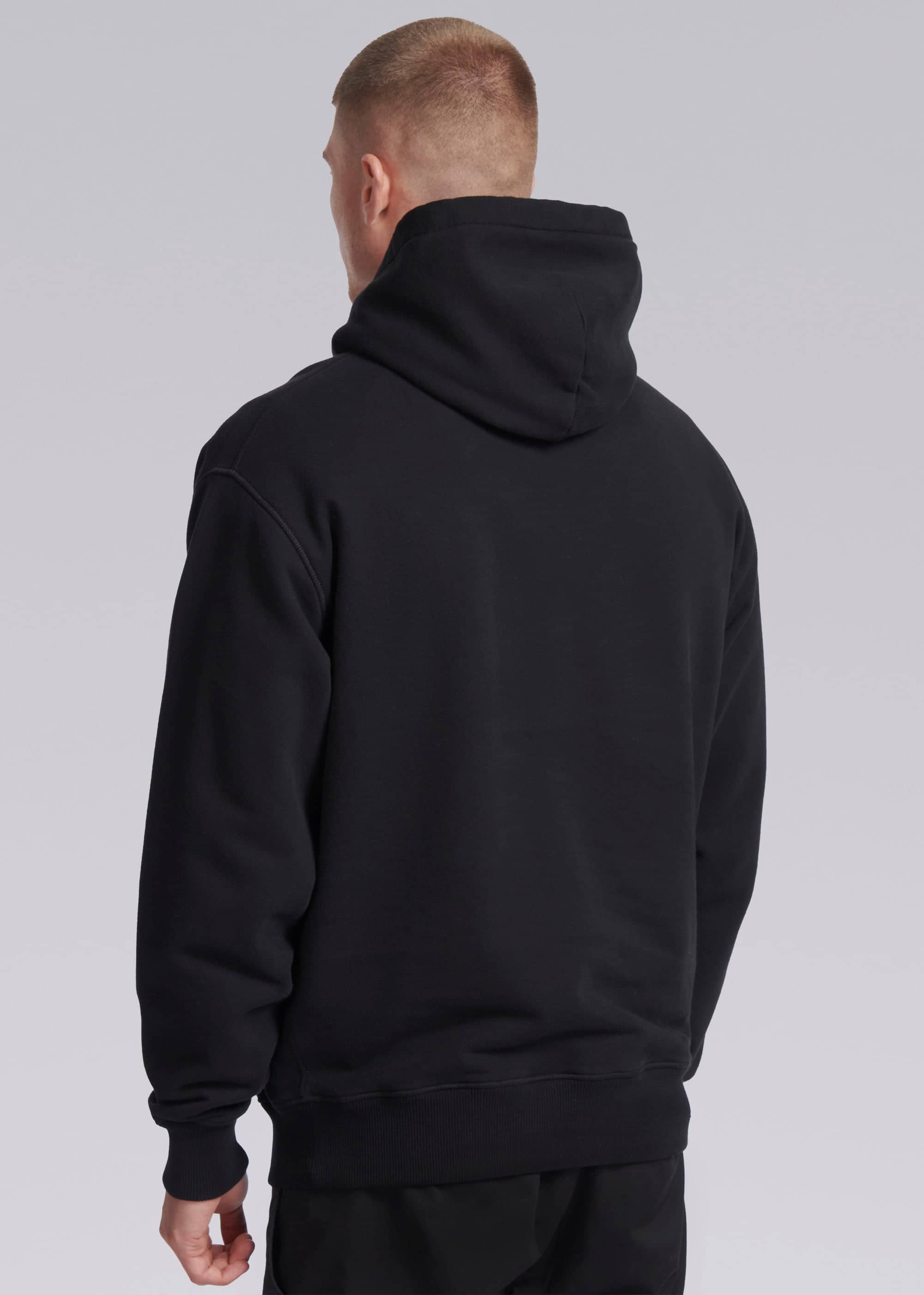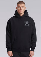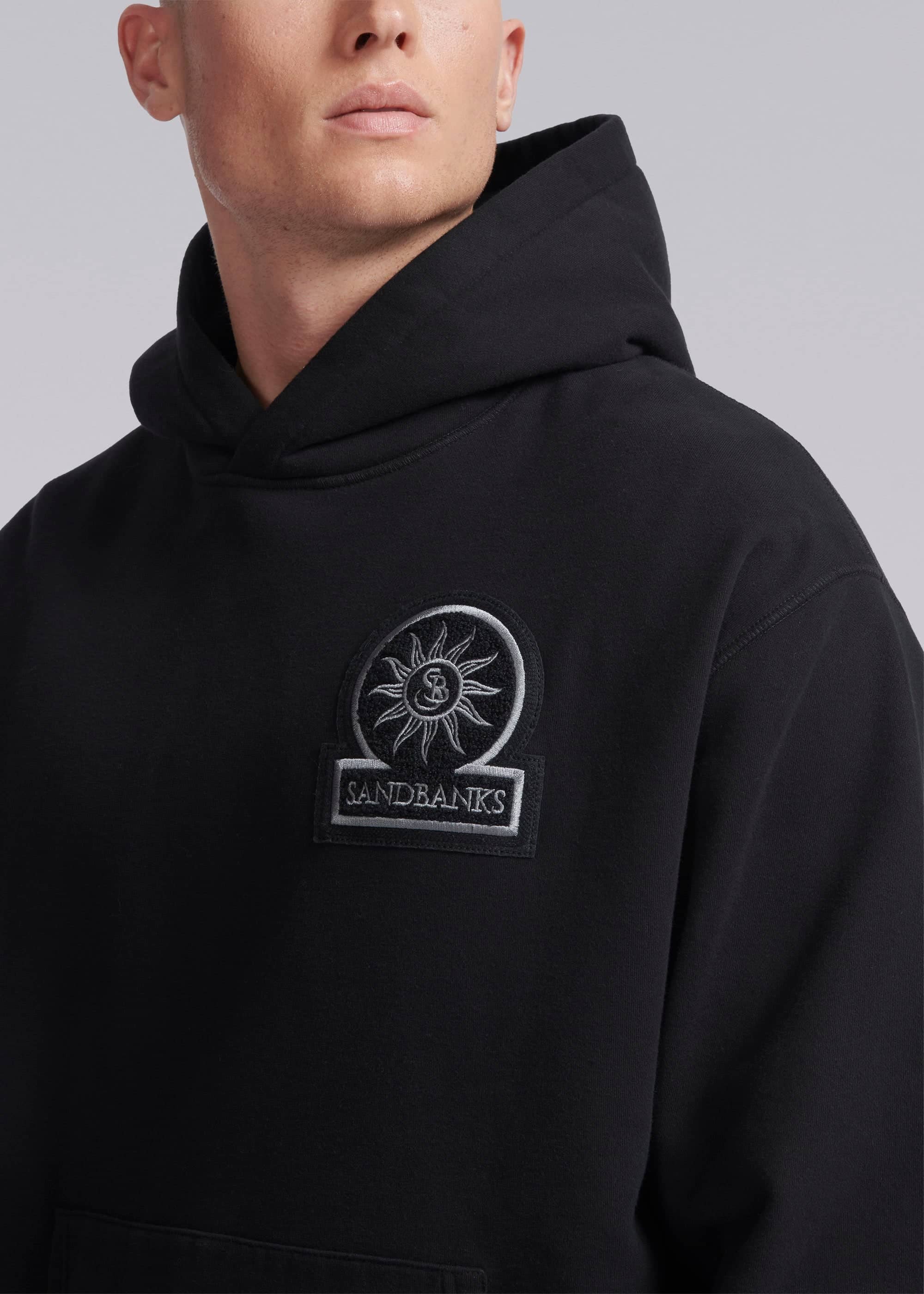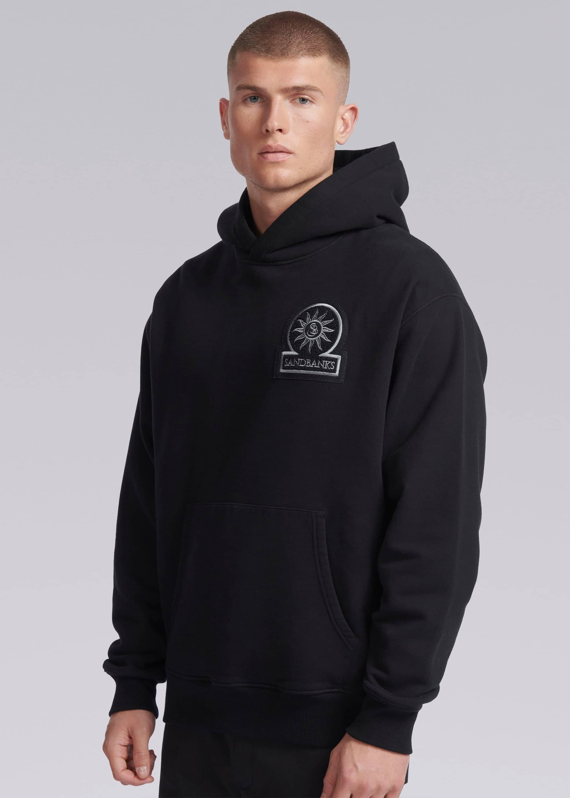 Sandbanks men's boucle badge hoodie in black, made from 100% organic cotton diagonal weave knit that is brushed internally for a soft and warm feel. This hoodie features a Sandbanks tonal boucle badge logo on chest, tri-colour neck binding, ribbed cuff and hem.