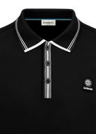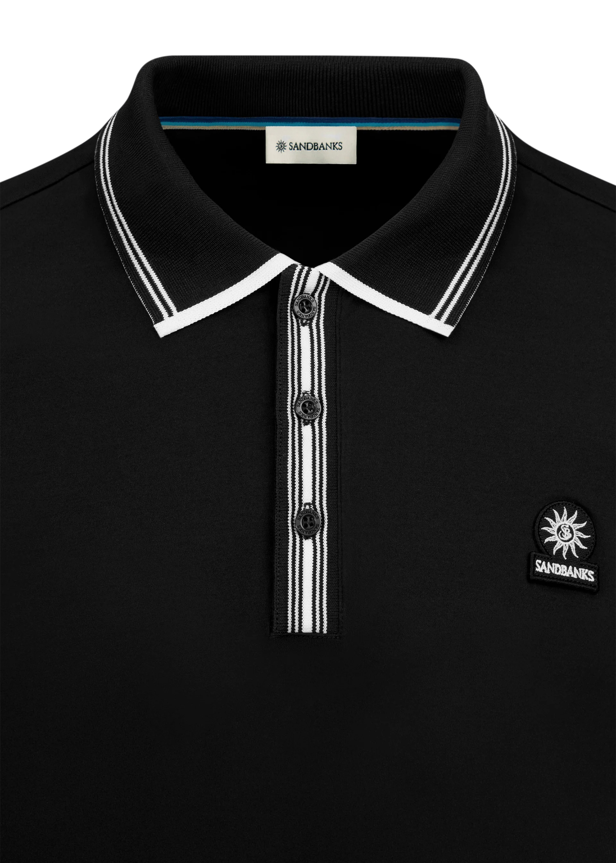 Sandbanks men's contrast stripe polo shirt in black, made from sustainably sourced 100% BCI Cotton. This classic fitting polo shirt features statement contrast stripe collar and placket, Sandbanks embroidered chest badge, and tri-colour back neck binding.