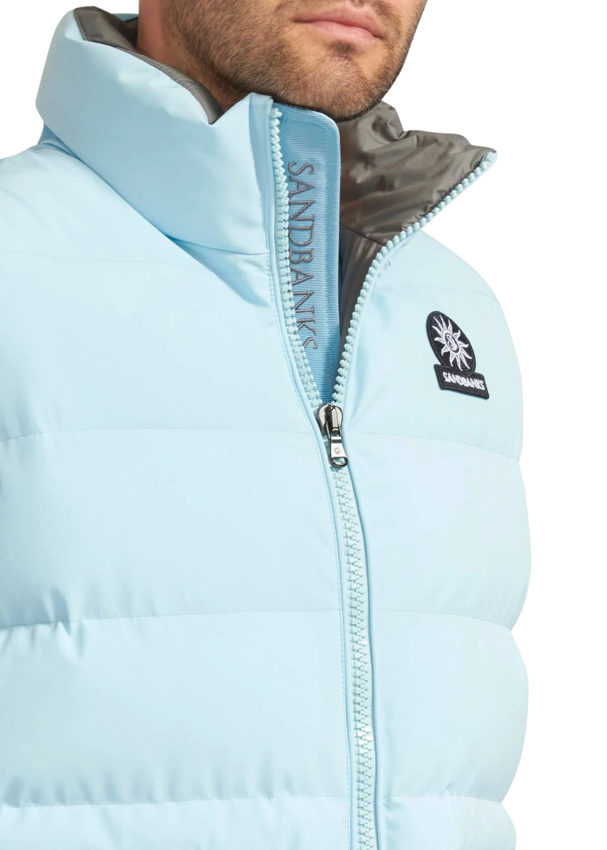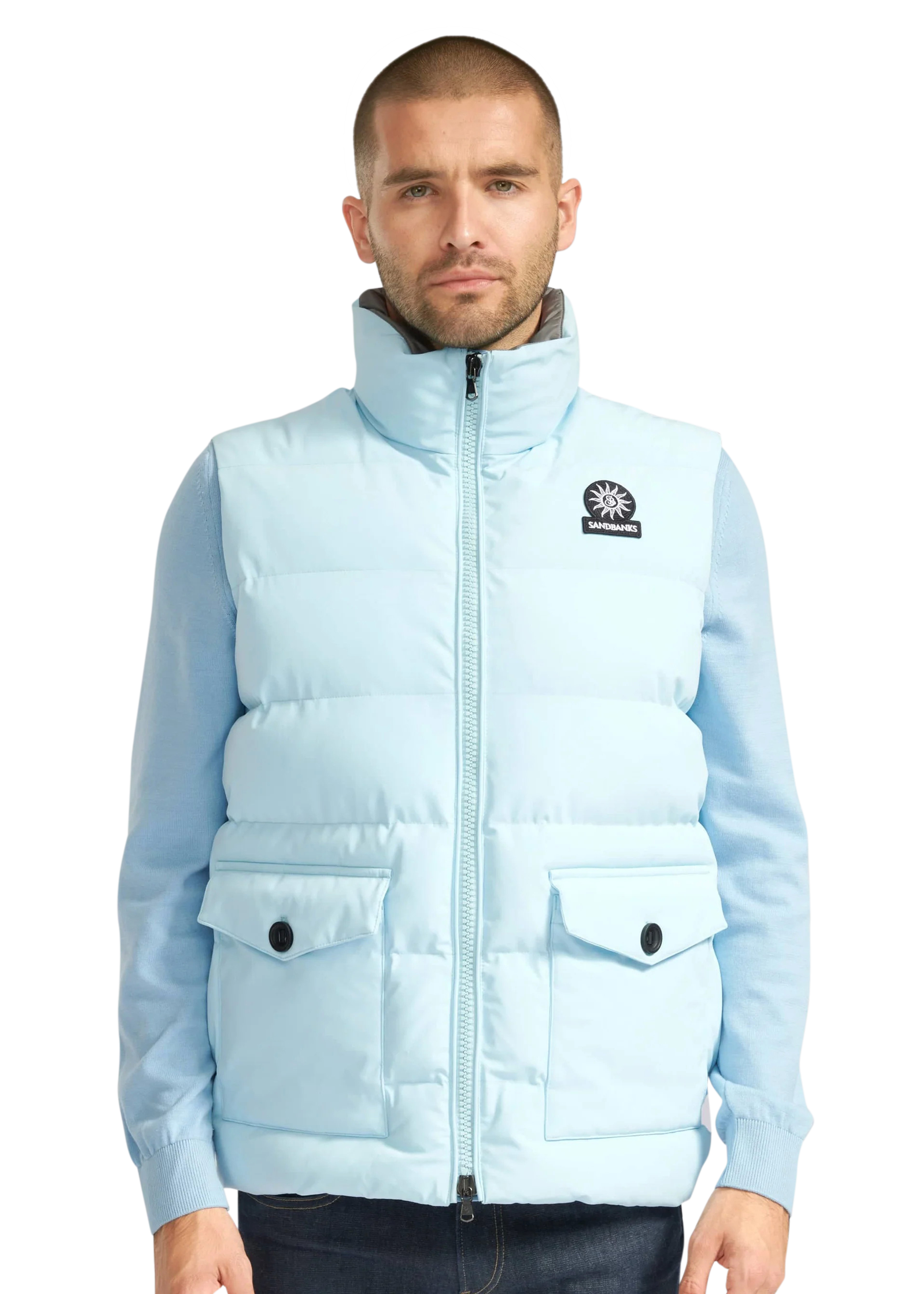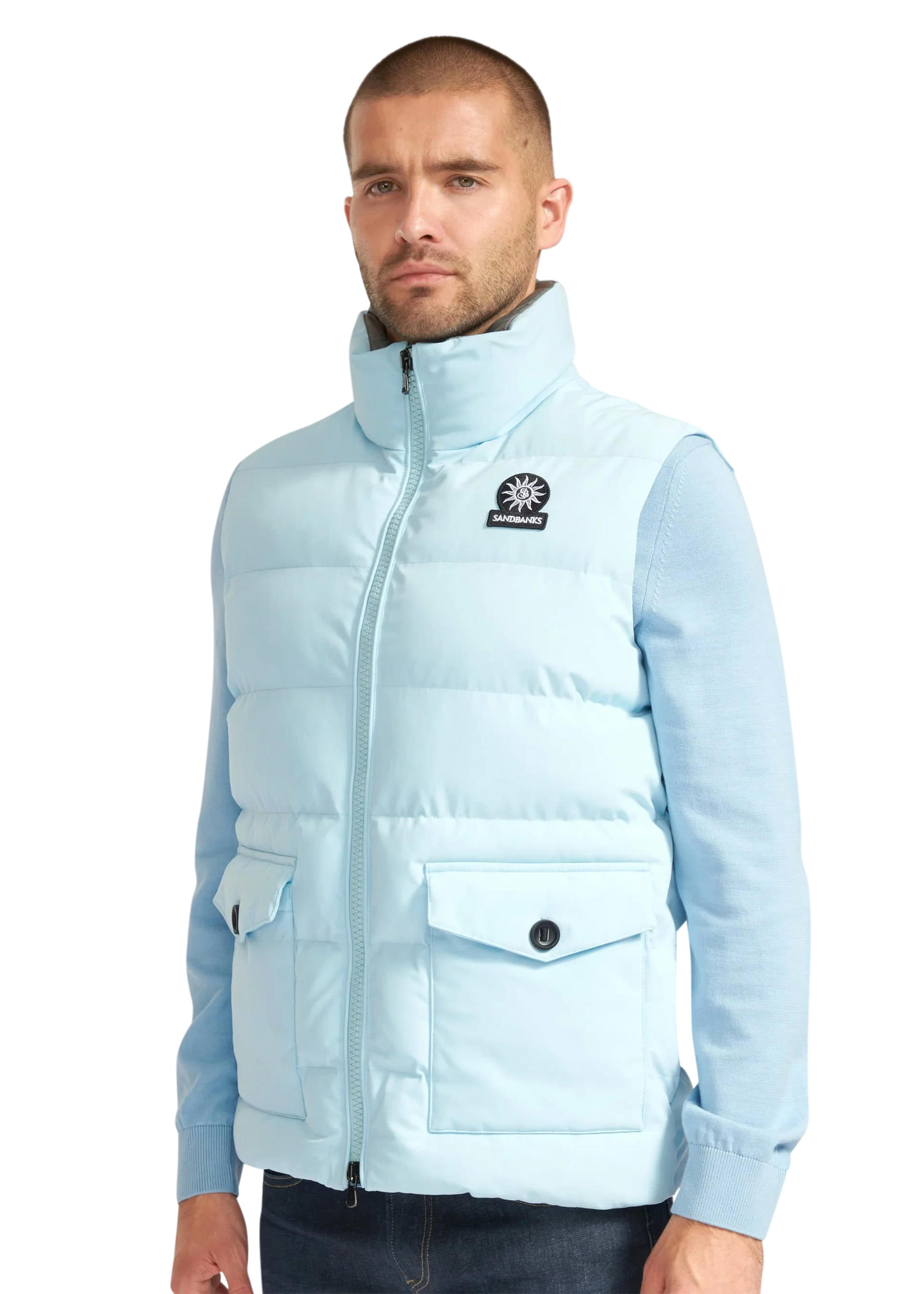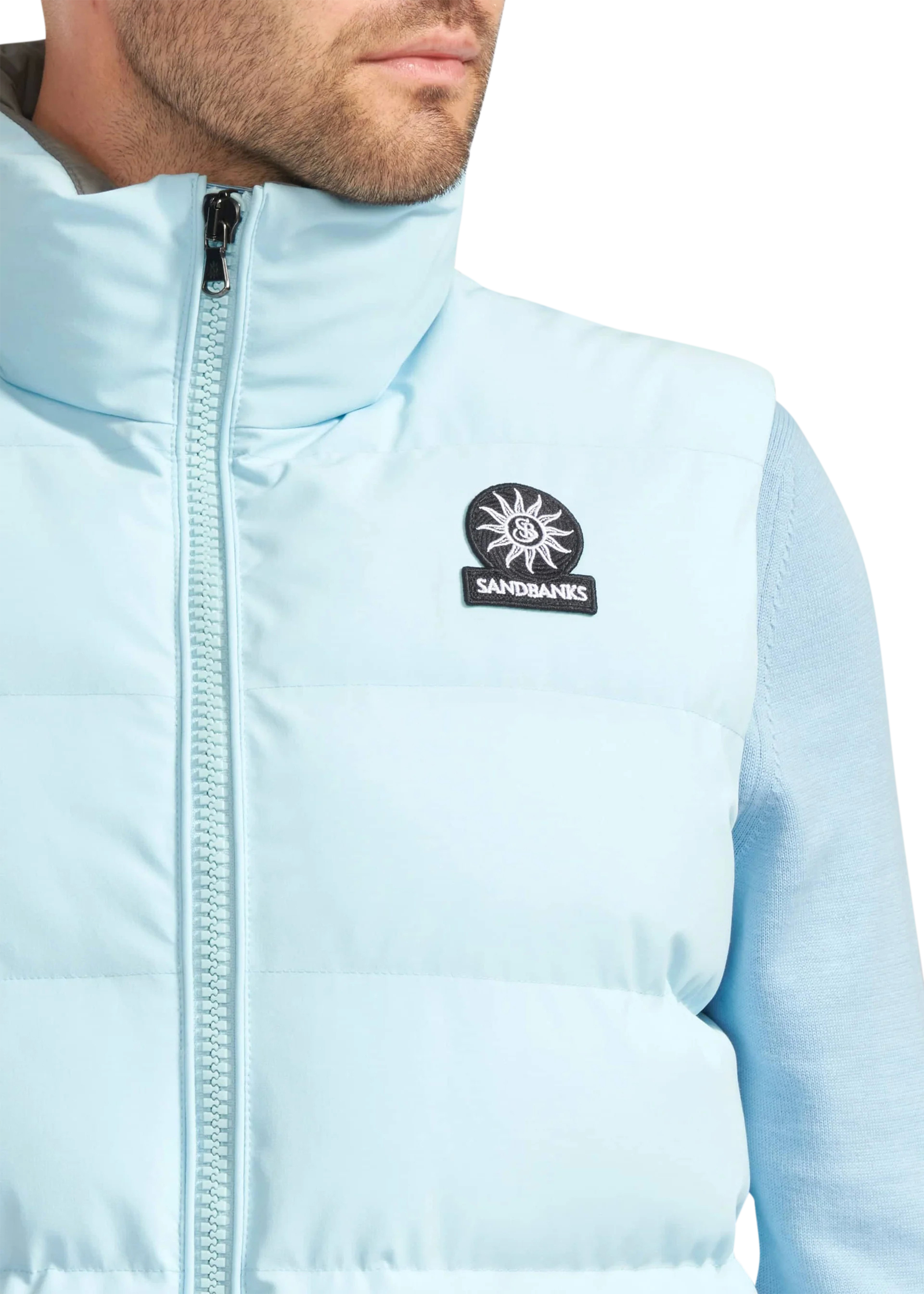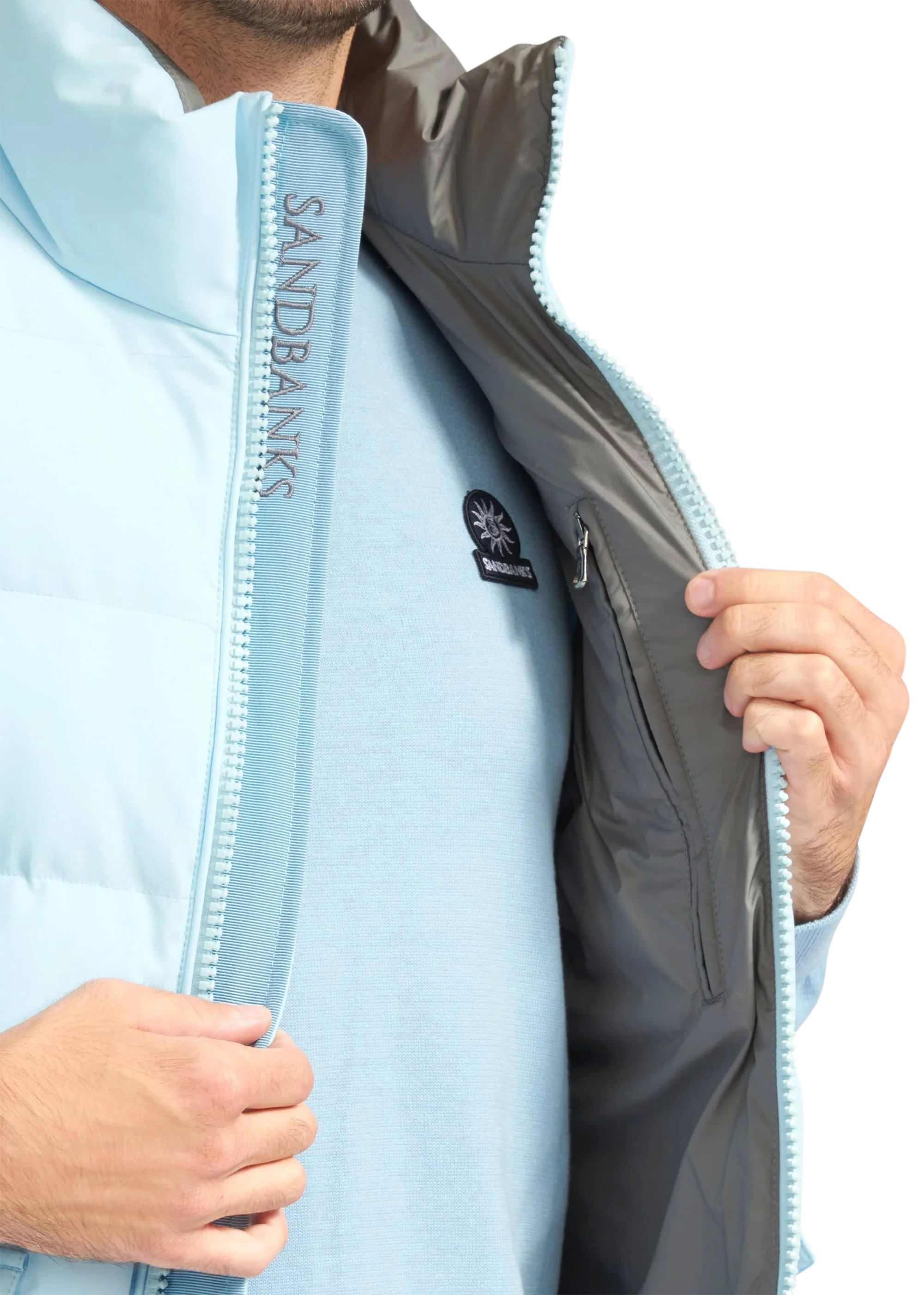 Sandbanks Explorer gilet is made almost entirely from recycled plastic bottles. With a crystal blue shell fabric, this gilet features a Sandbanks embroidered logo badge, placket embroidery and large lower utility pocket details.