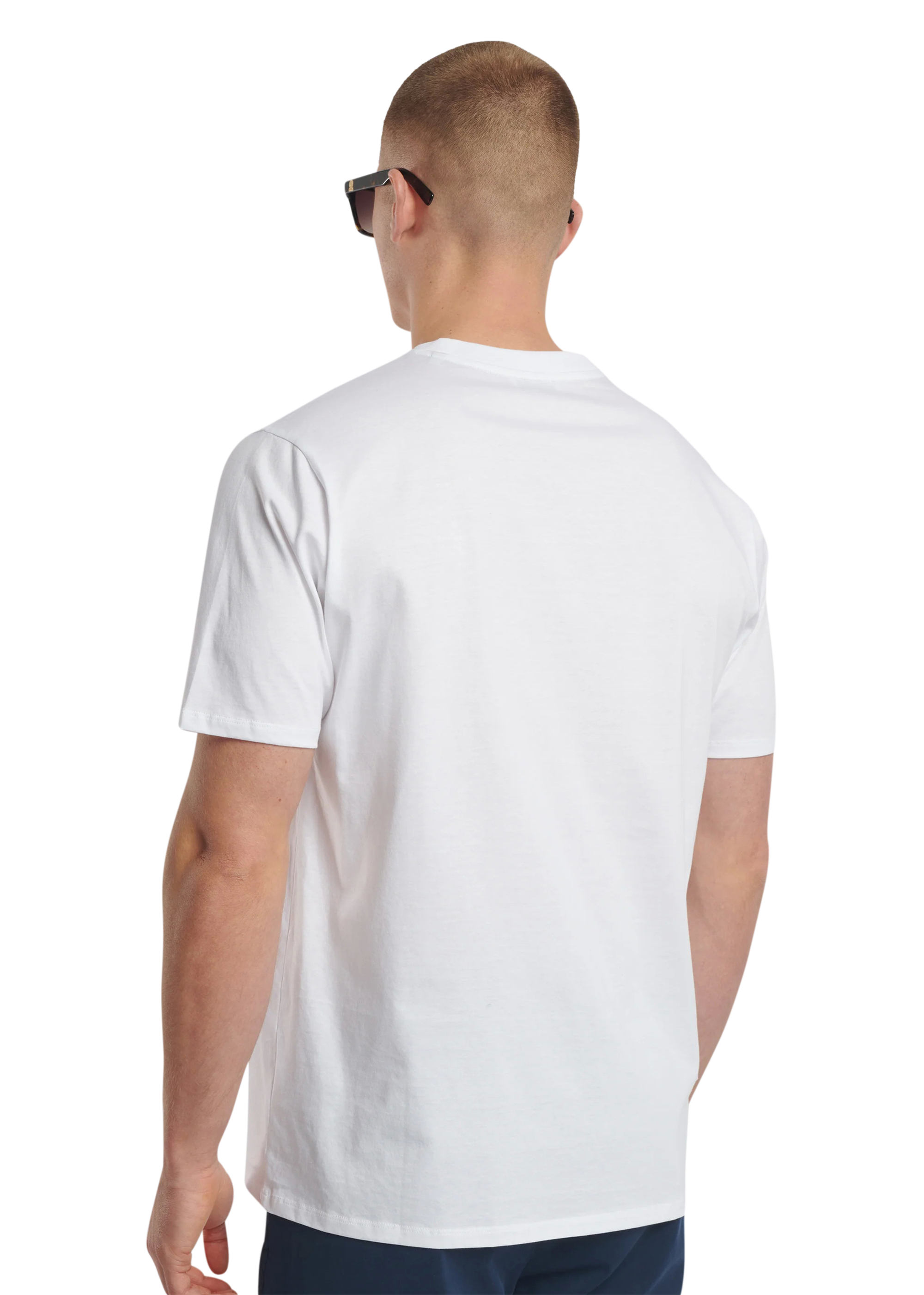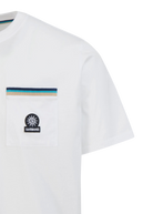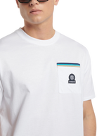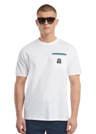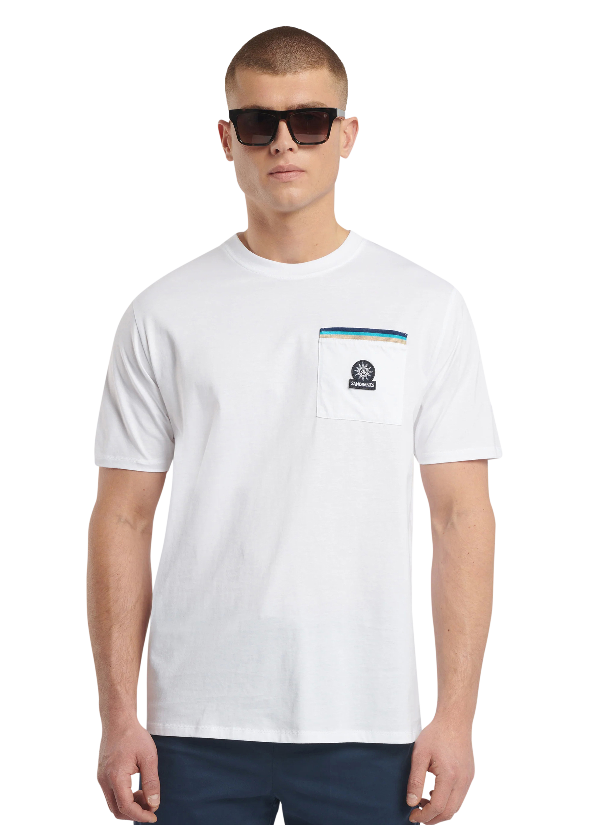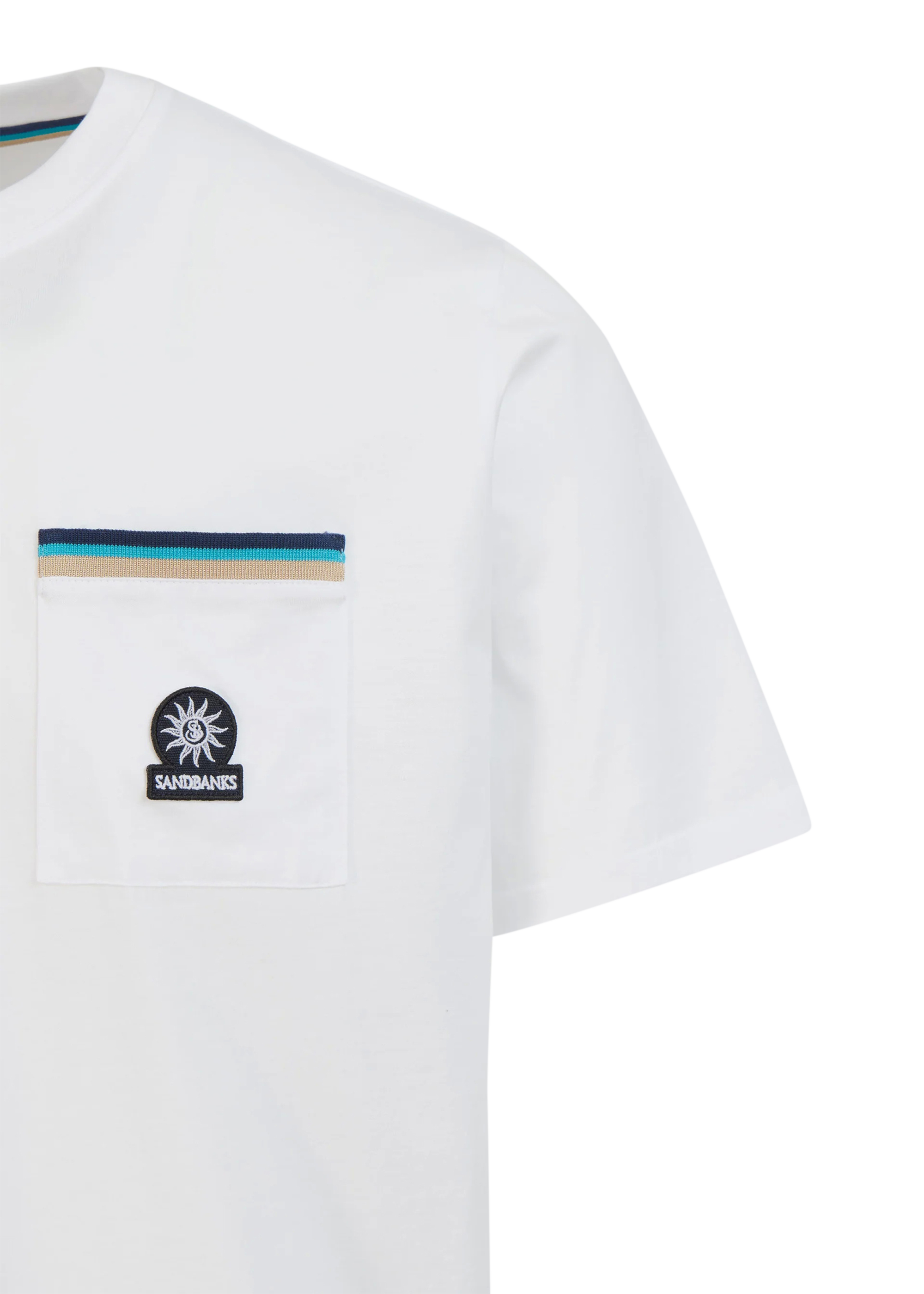 Sandbanks men's badge logo pocket t-shirt in white, made from mercerised 100% organic cotton for a silky and luxurious feel. This relaxed fitting crew neck t-shirt features statement pocket with embroidered badge logo and tri-colour rib binding pocket.