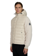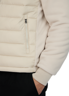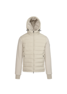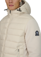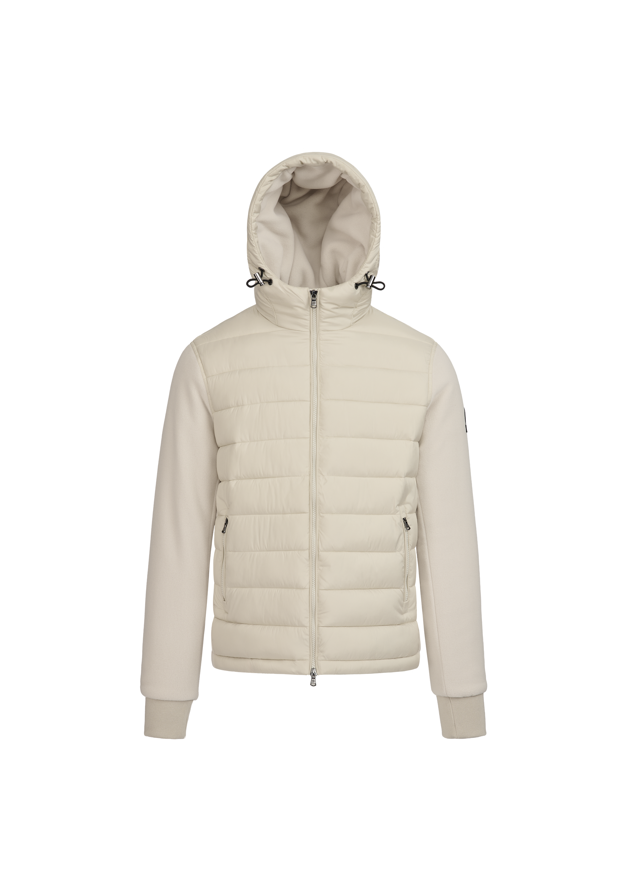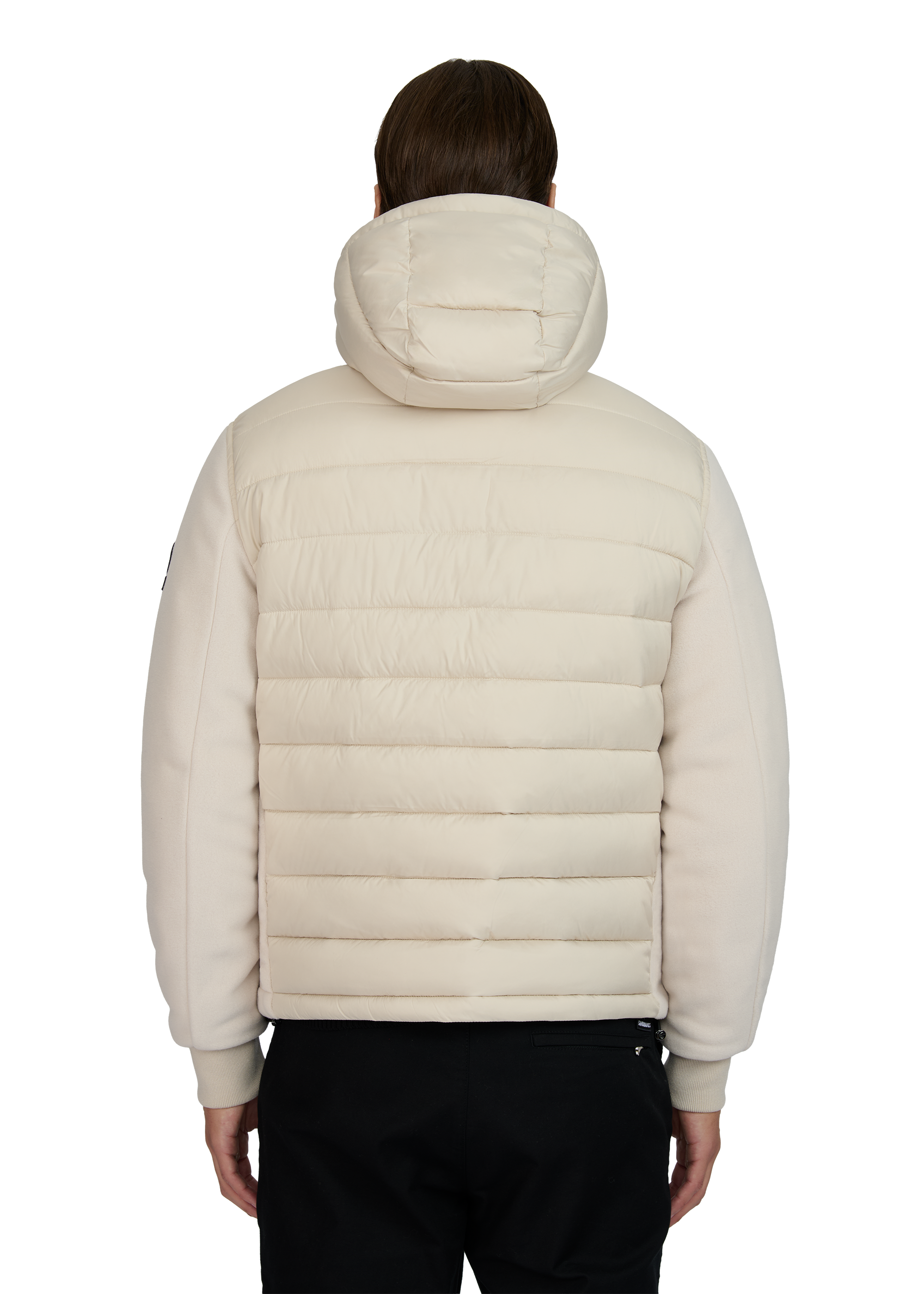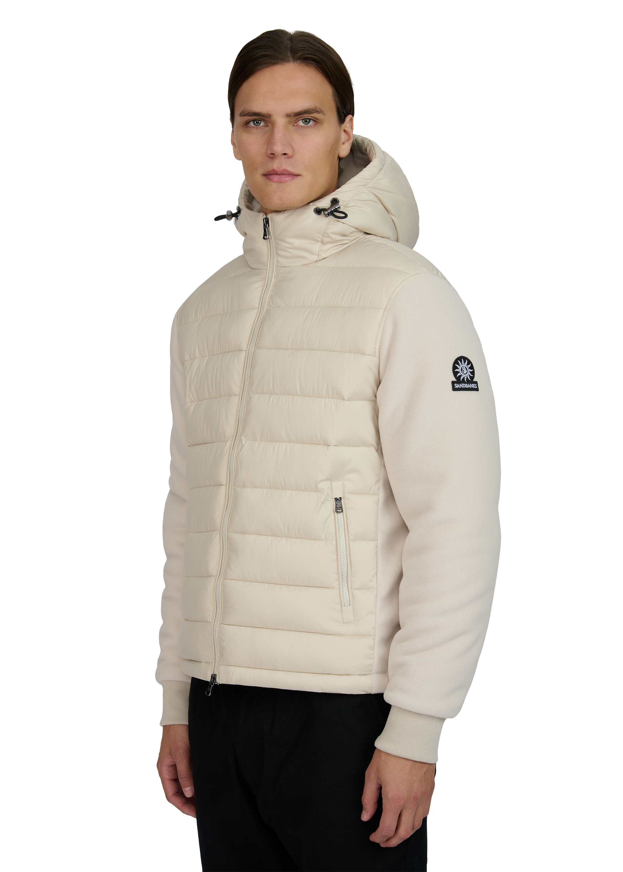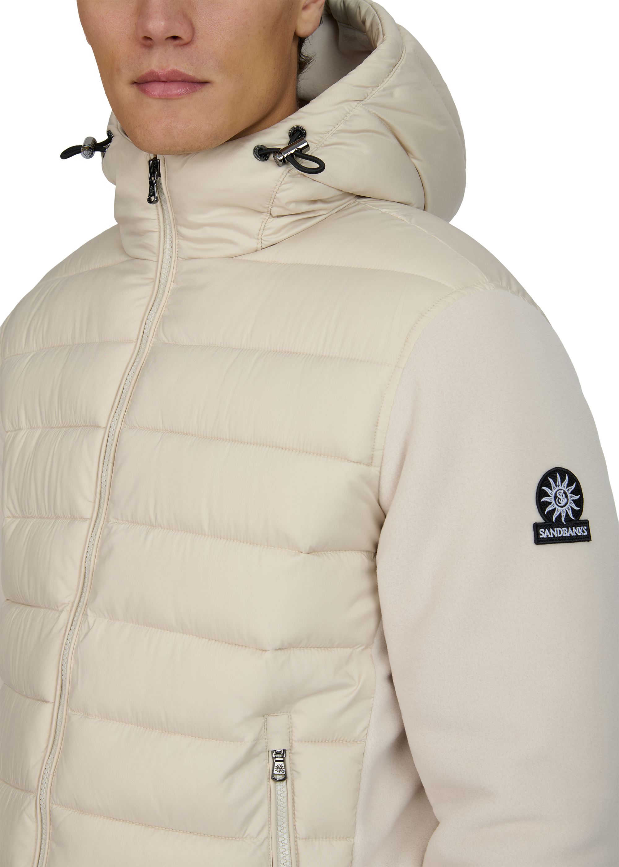 Sandbanks Outlander micro fleece hooded hybrid jacket in stone - a warm and lightweight everyday casual jacket. This style features a warm eco down puffer filled front and rear, polar fleece sleeves, hood internal and pockets for comfort and warmth, YKK 2-Way Vislon front zip and side zip pockets, embroidered logo badge and finished with gun metal branded cord adjusters and eyelets.