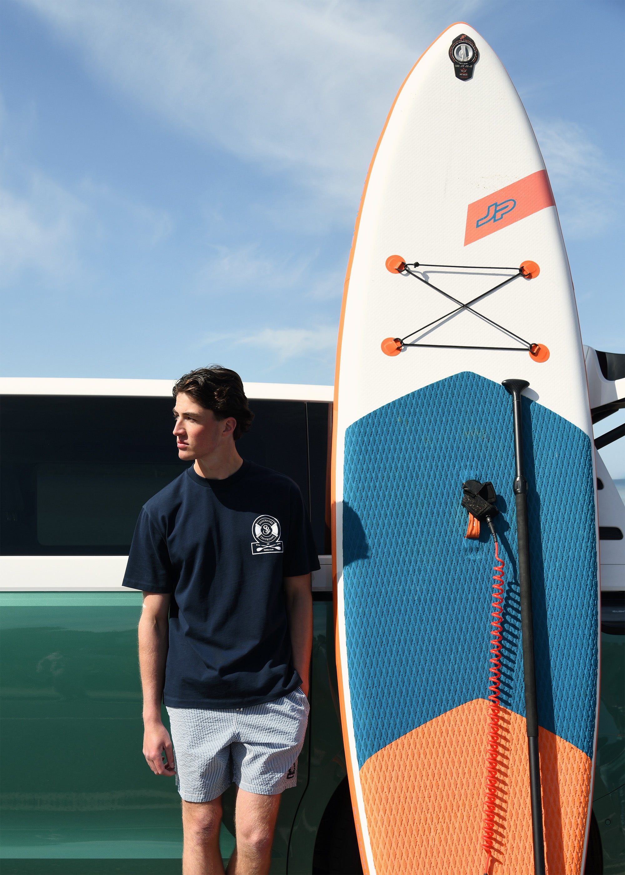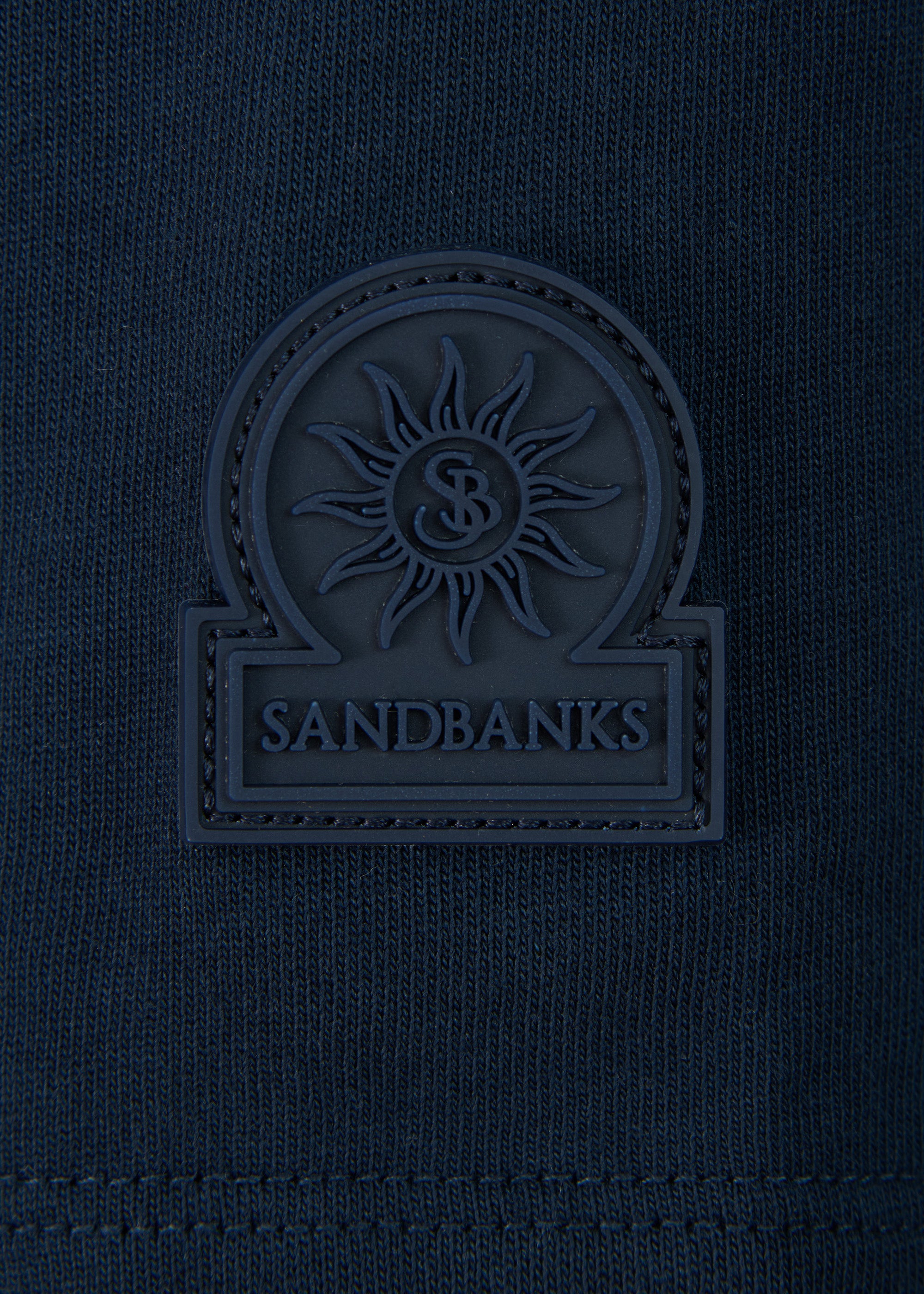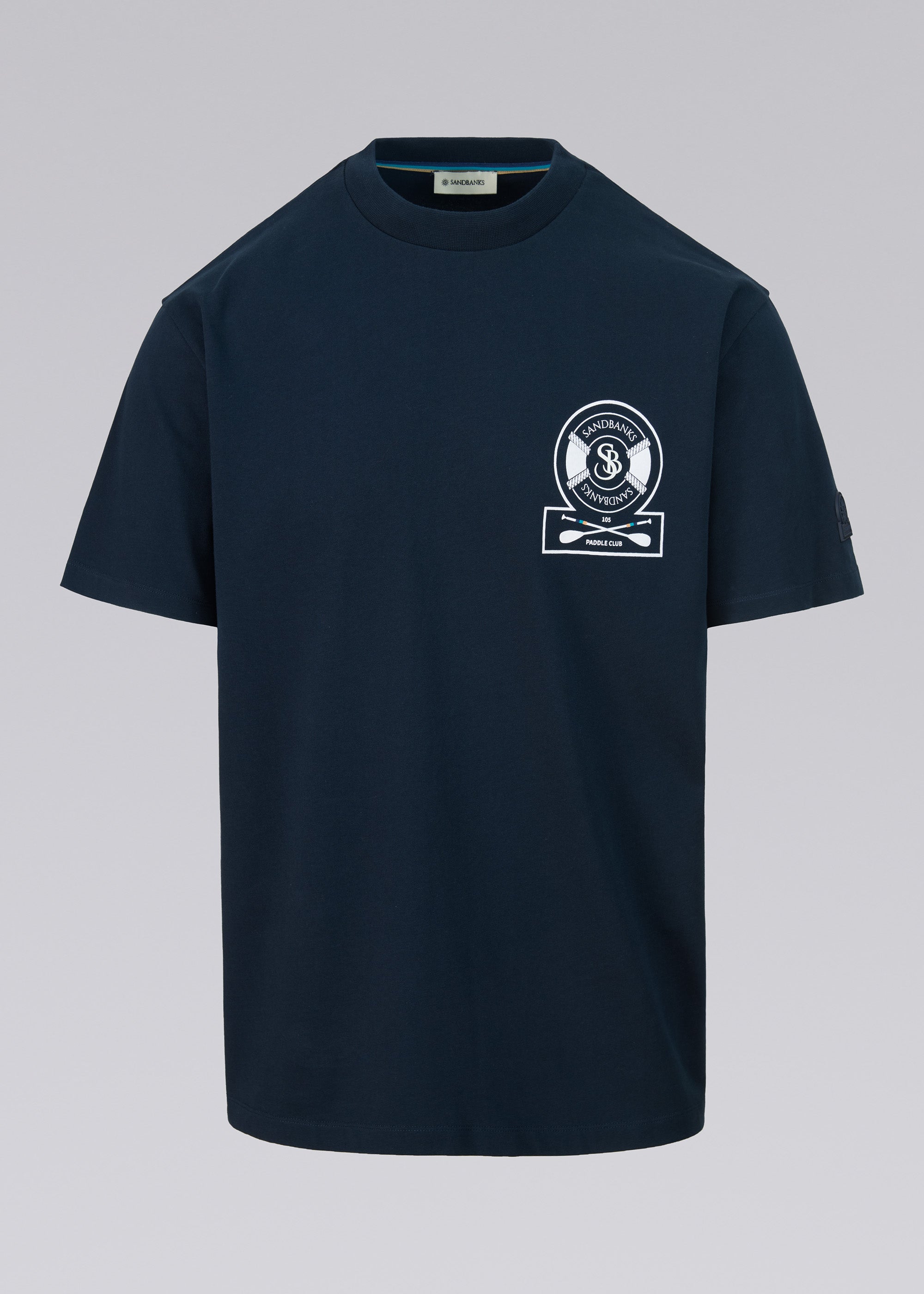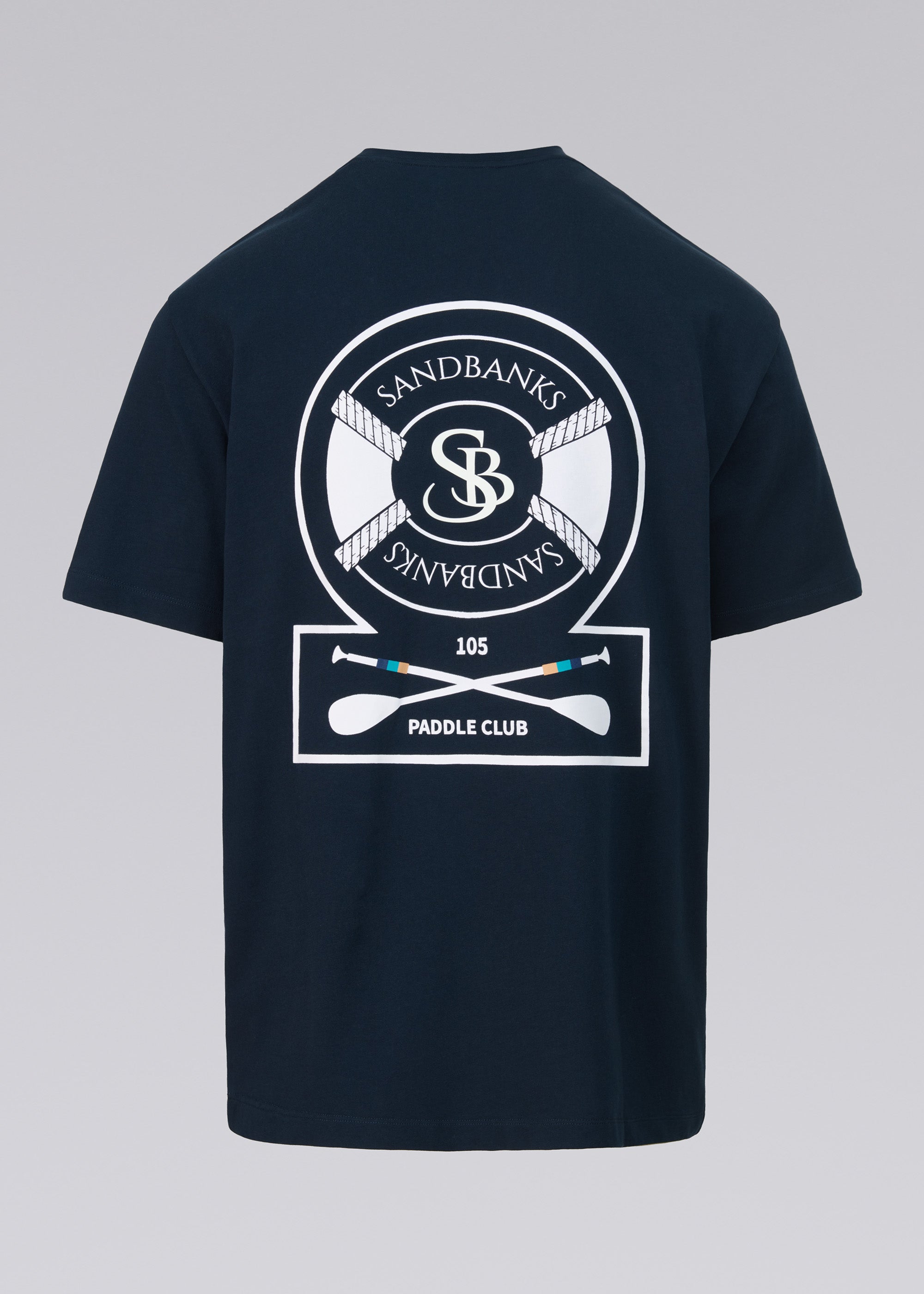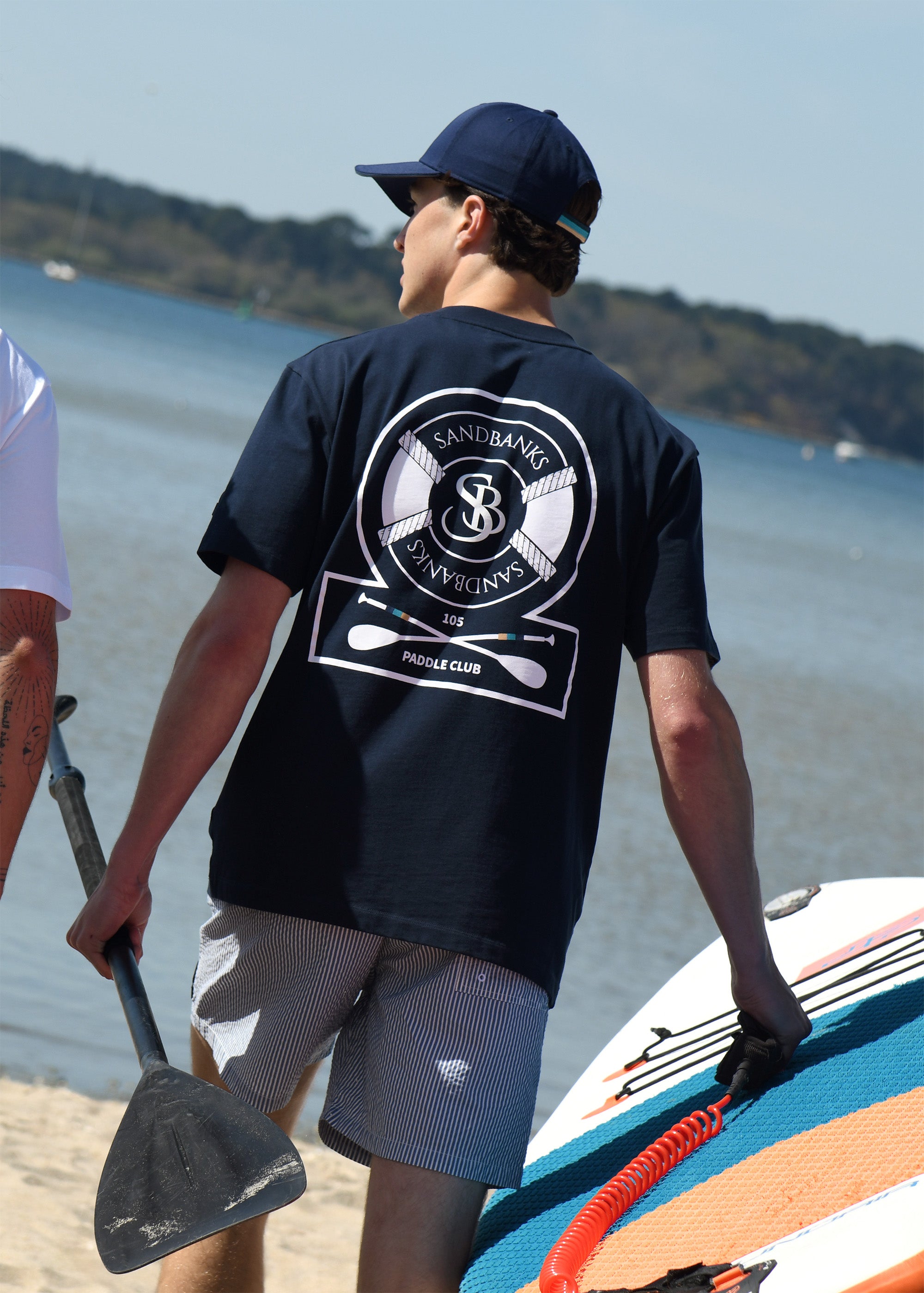 Sandbanks men's paddle club printed t-shirt in navy, made from 100% organic cotton. This t-shirt features a statement Sandbanks chest and rear print, and tri-colour back neck binding.