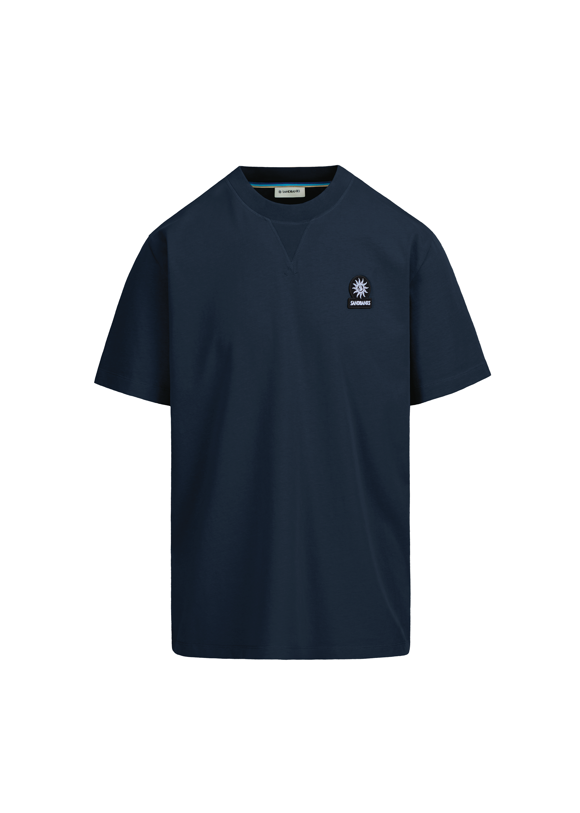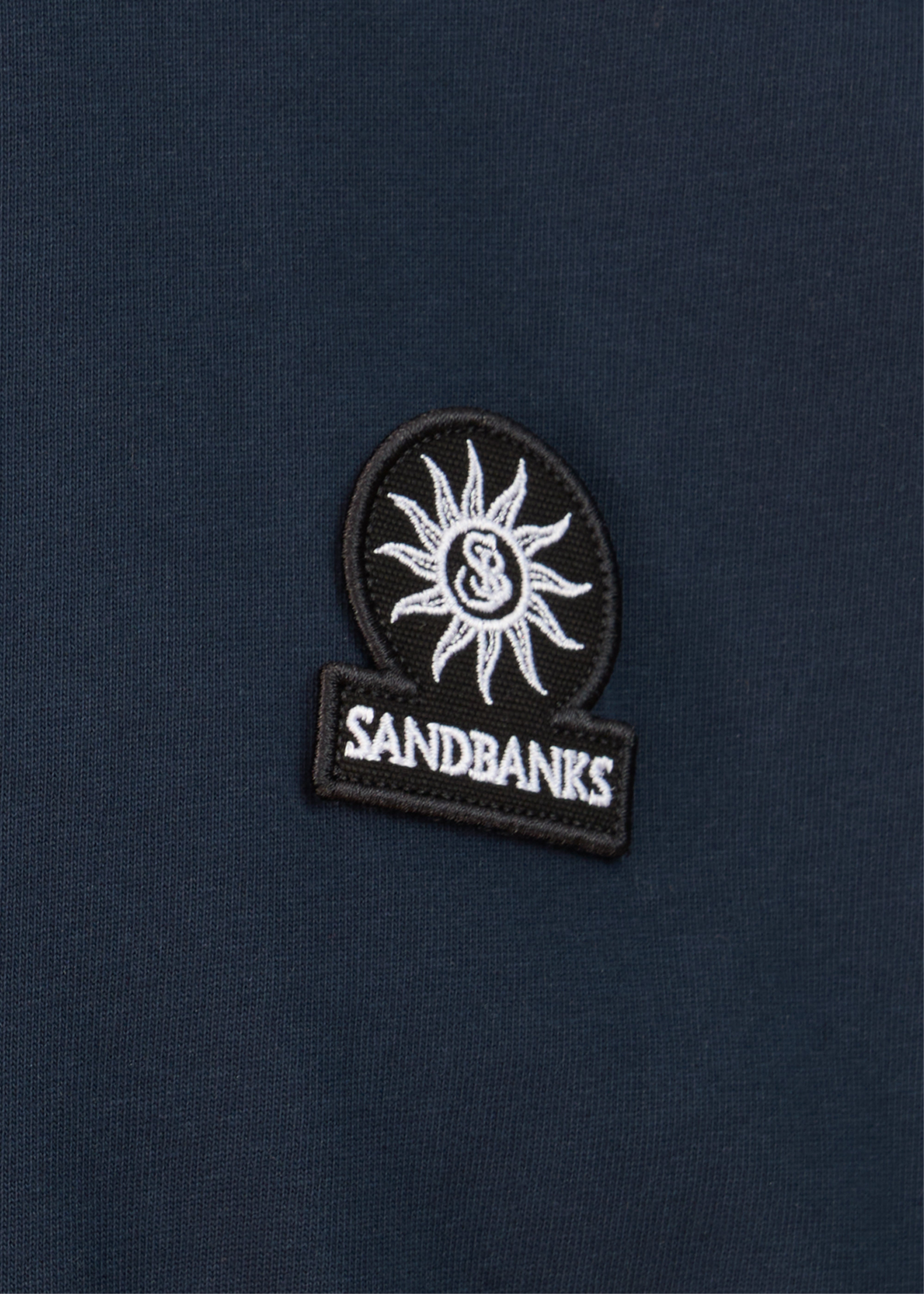 Sandbanks men's double jersey collegiate t-shirt in navy, made from mercerised cotton for a silky and luxurious feel. This relaxed fit crew neck t-shirt features an embroidered badge logo on the chest and tri-colour back neck binding.