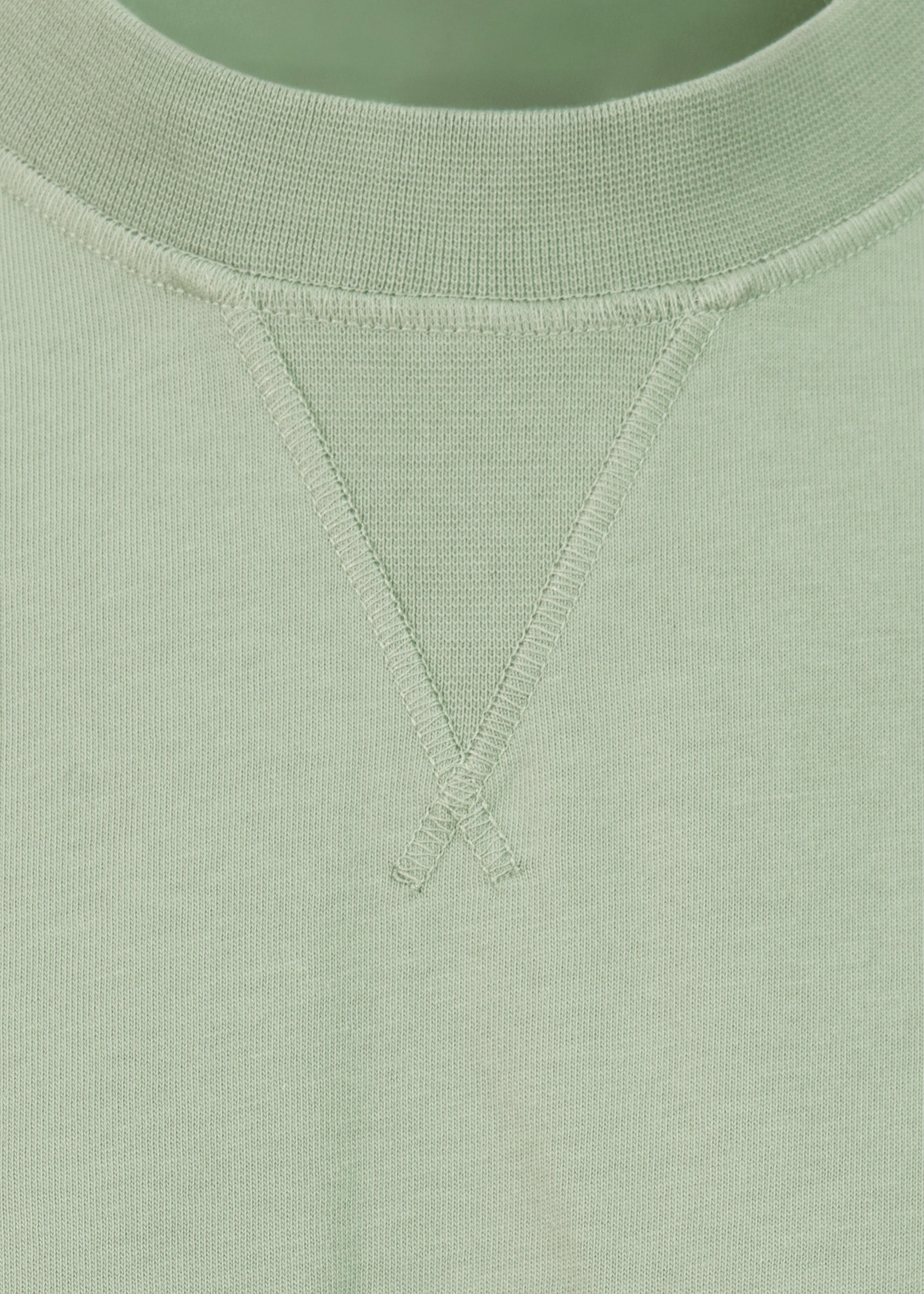 Sandbanks men's double jersey collegiate t-shirt in sage, made from mercerised cotton for a silky and luxurious feel. This relaxed fit crew neck t-shirt features an embroidered badge logo on the chest and tri-colour back neck binding.
