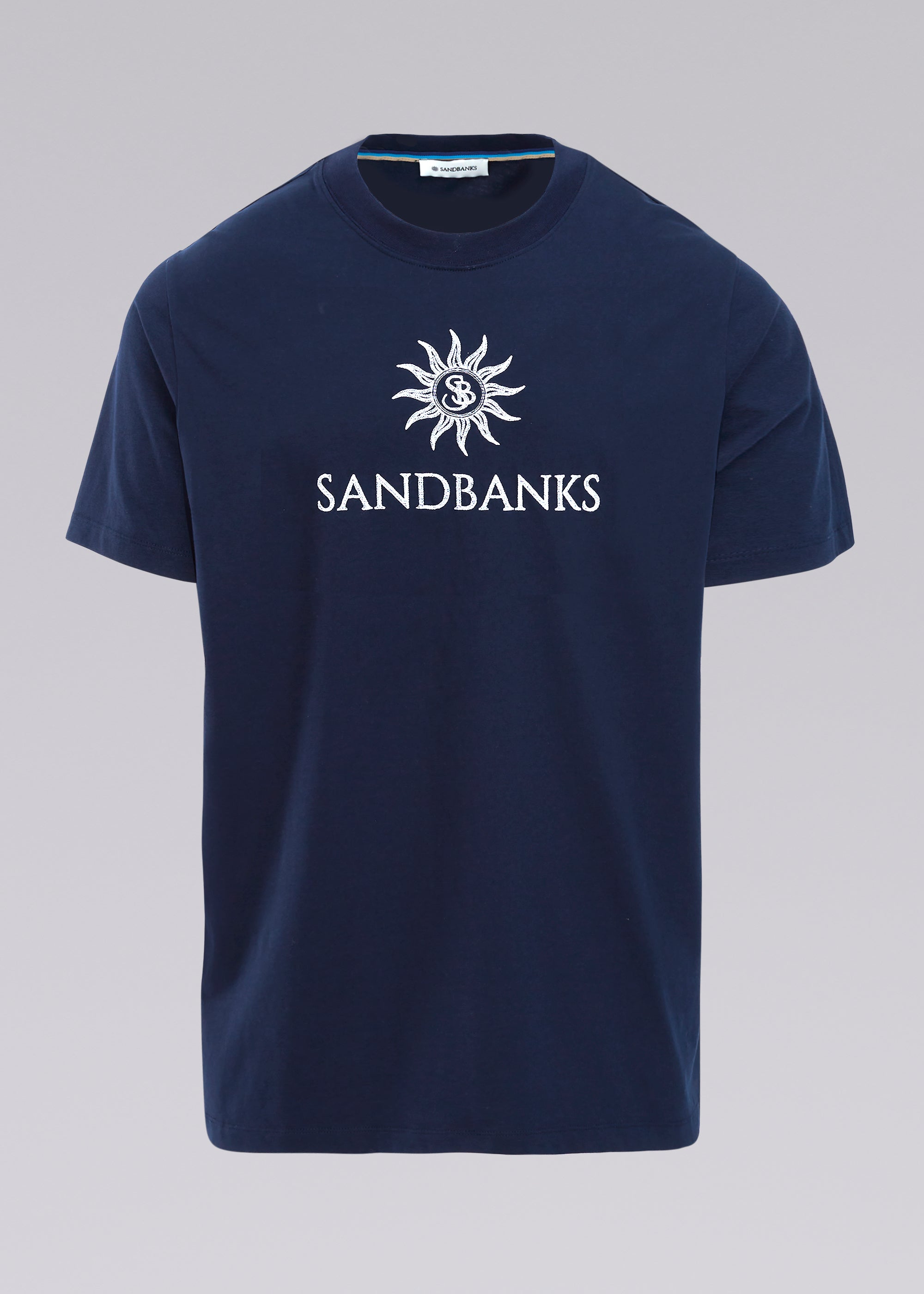 Sandbanks men's rope embroidery t-shirt in navy, made from 100% organic cotton. This relaxed fitting crew neck t-shirt features rope embroidered Sandbanks logo in white, and tri-colour back neck binding.