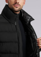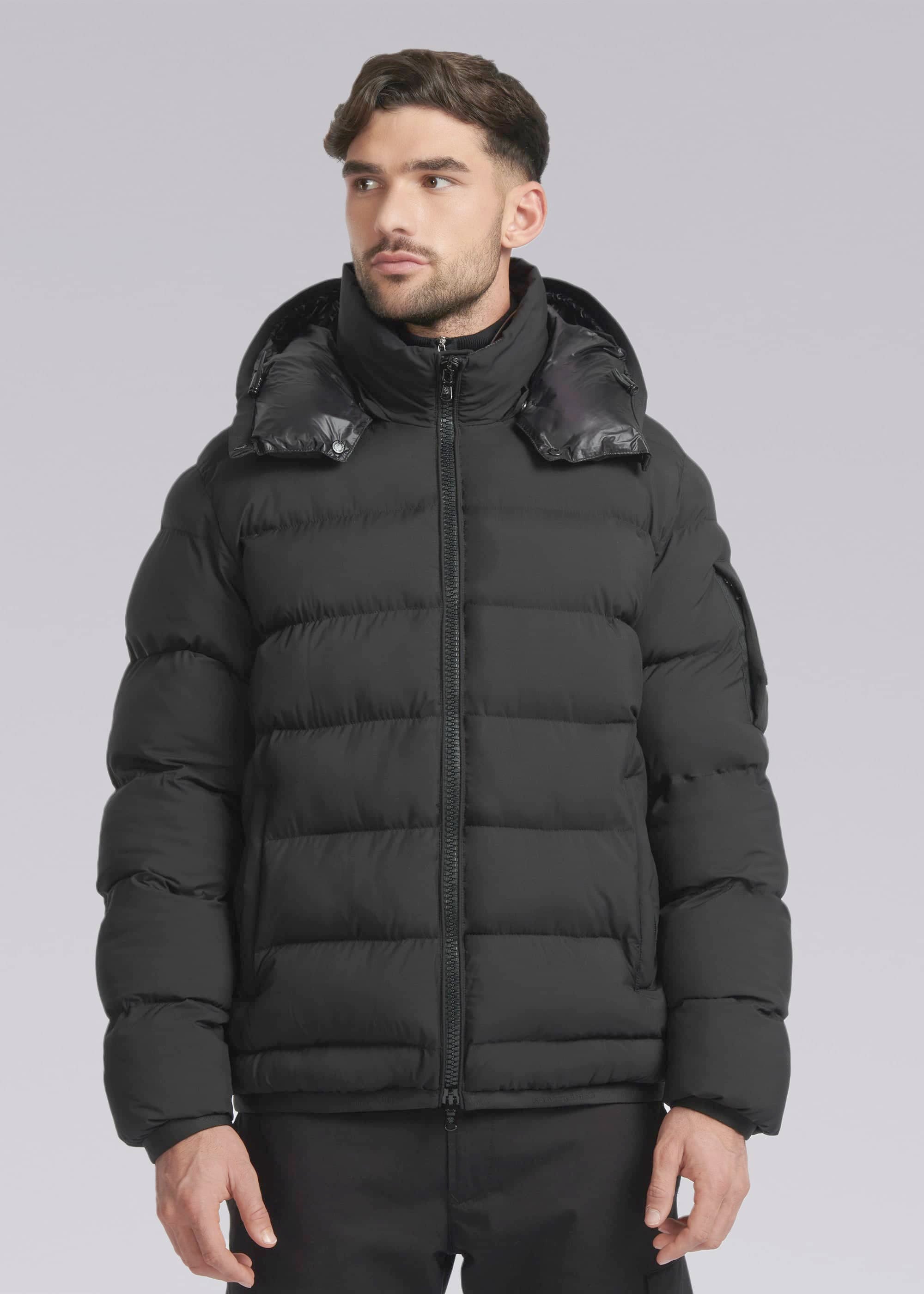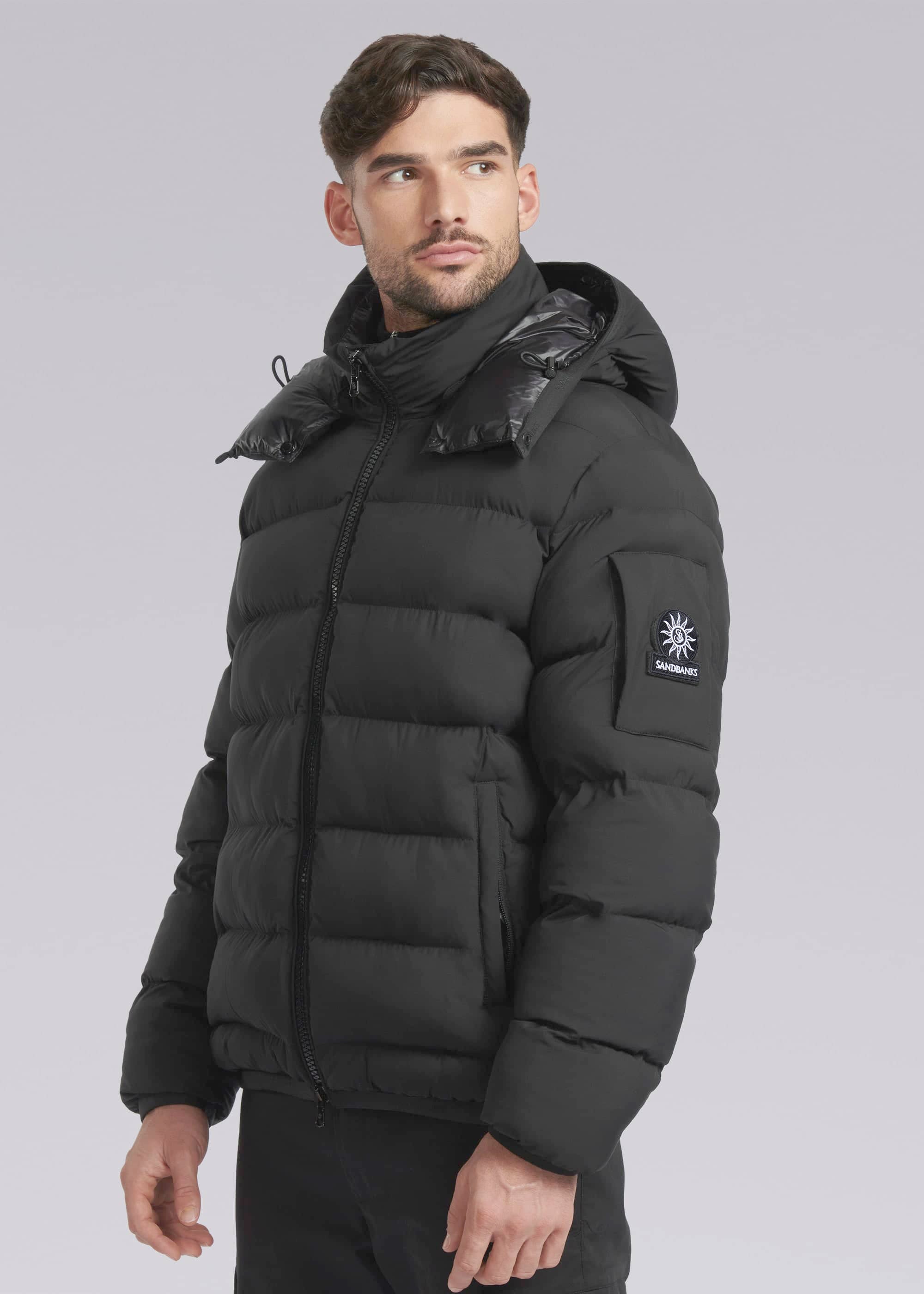 The Sandbanks shore hooded logo printed puffer in black, a light weight short puffer jacket, constructed from a technical soft shell water resistant charcoal fabric and lined with a silky high shine black fabric for comfort. Featuring a rear tonal logo print, branded black elasticated cuff, hem and hood, black enamel components, side fleece lined zip pockets, patch sleeve zip pocket with a contrast felt/rubber badge.