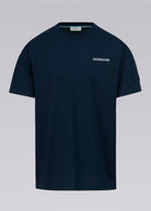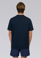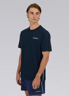 Sandbanks side stripe t-shirt in navy, made from mercerised 100% bci cotton with a silky and luxurious feel. This relaxed fitting crew neck t-shirt features a raised rubber 'Sandbanks' print on the chest in white, a tonal embroidered logo badge on the sleeve and tri-colour tape on the side seam.