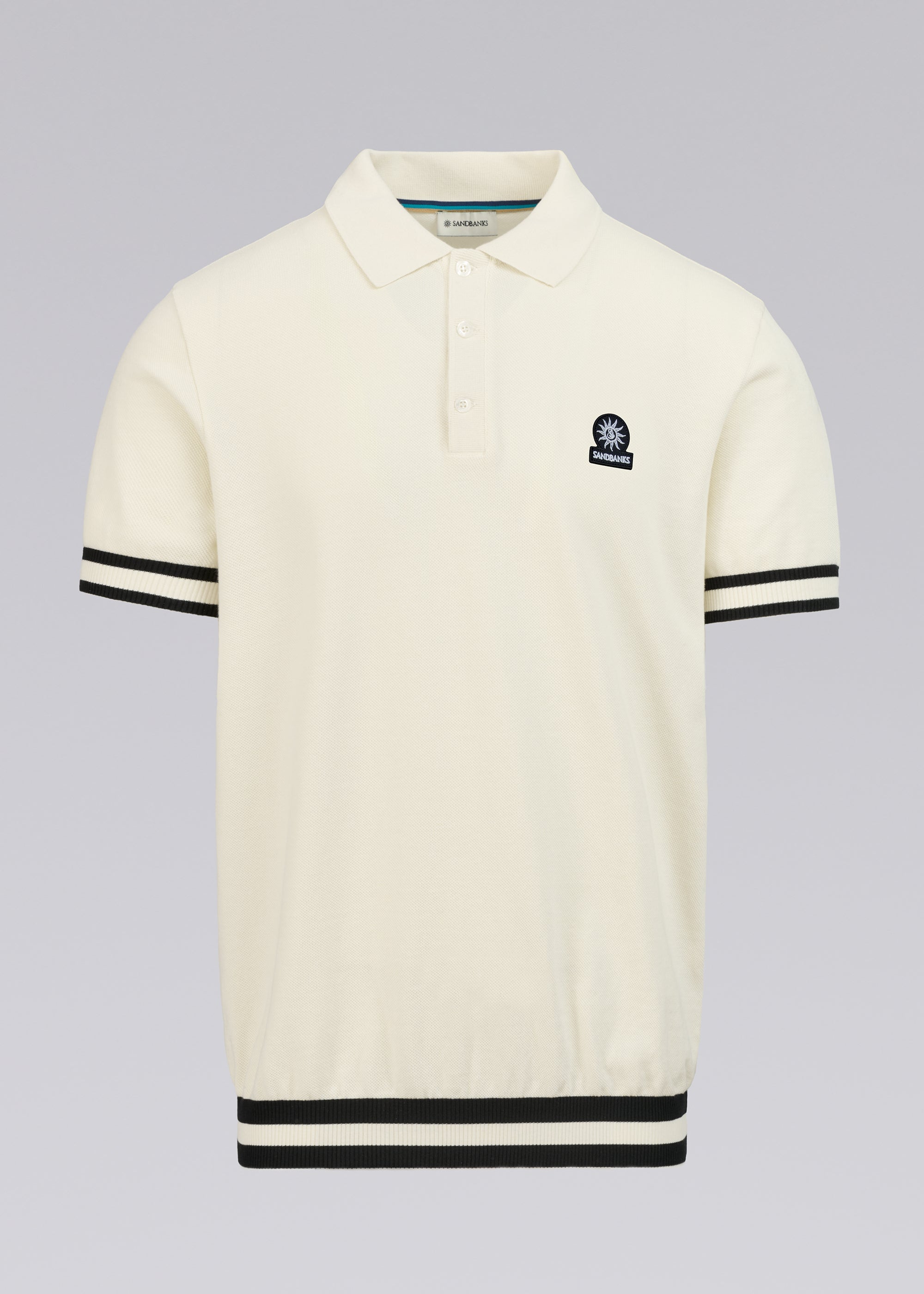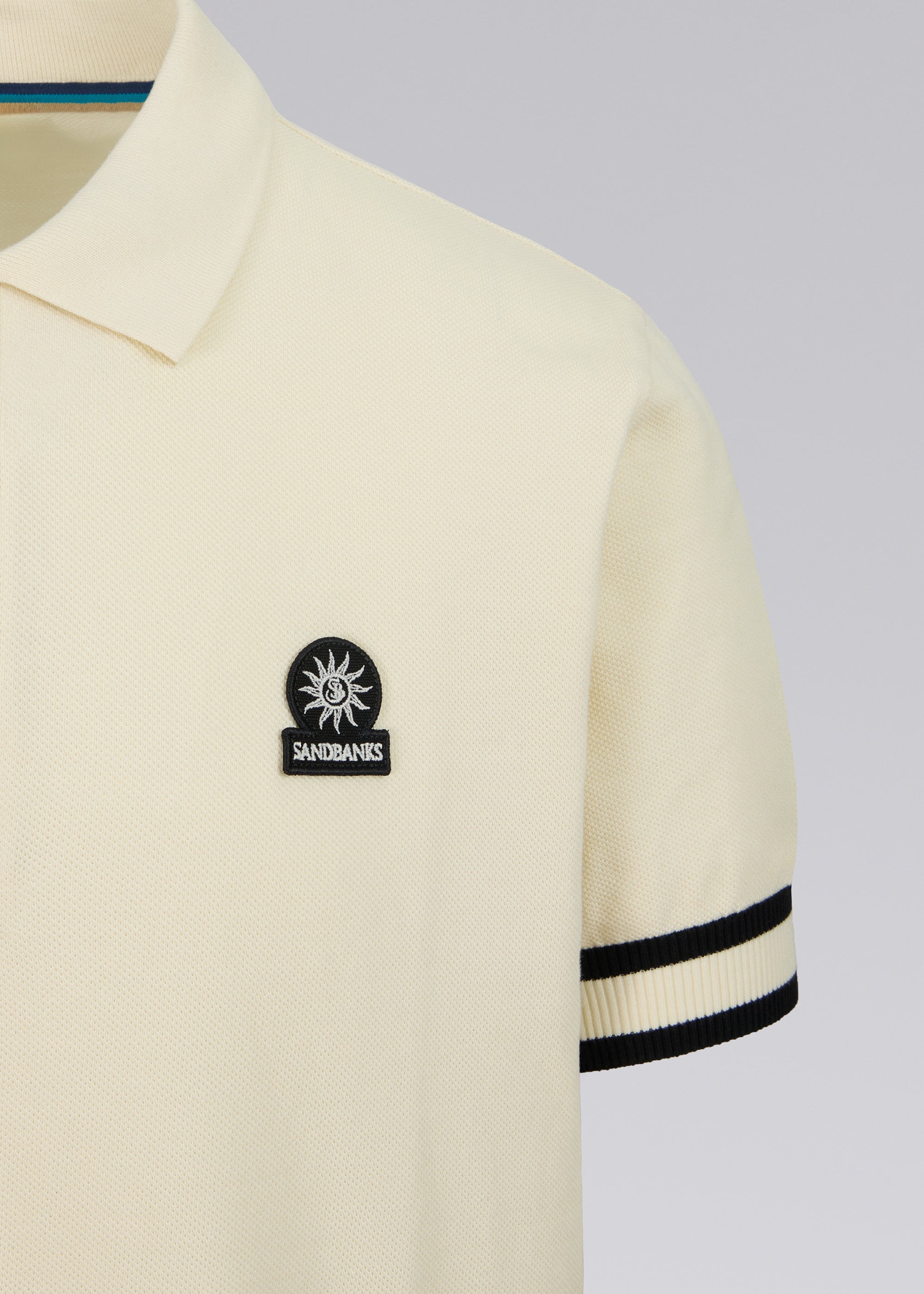 This ecru Sandbanks Stripe Hem Pique Polo Shirt is a sophisticated choice, featuring a embroidered badge logo on the chest, a bold contrasting stripe rib on the cuff and waist band and statement 3 button placket with engraved pearlescent buttons.