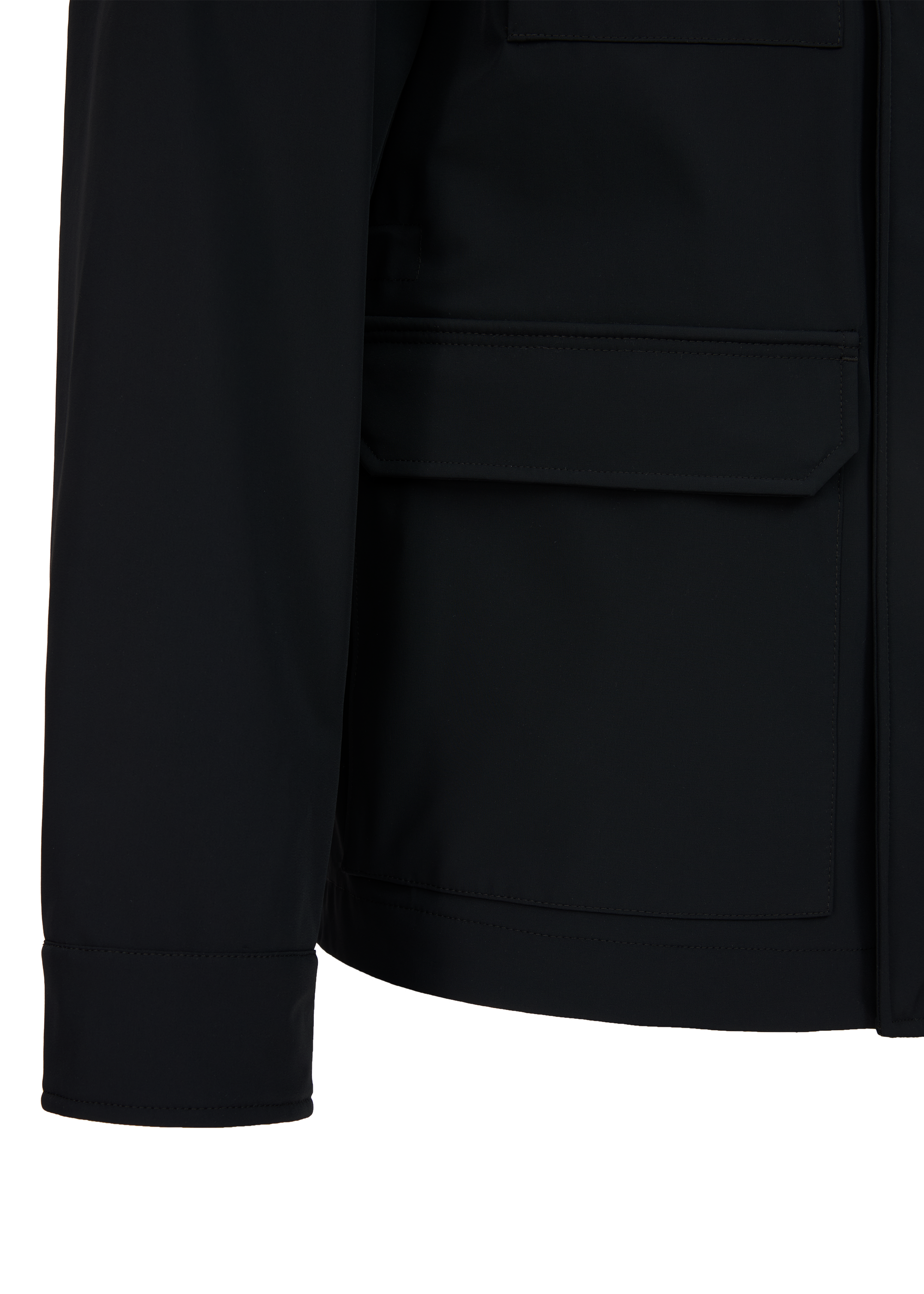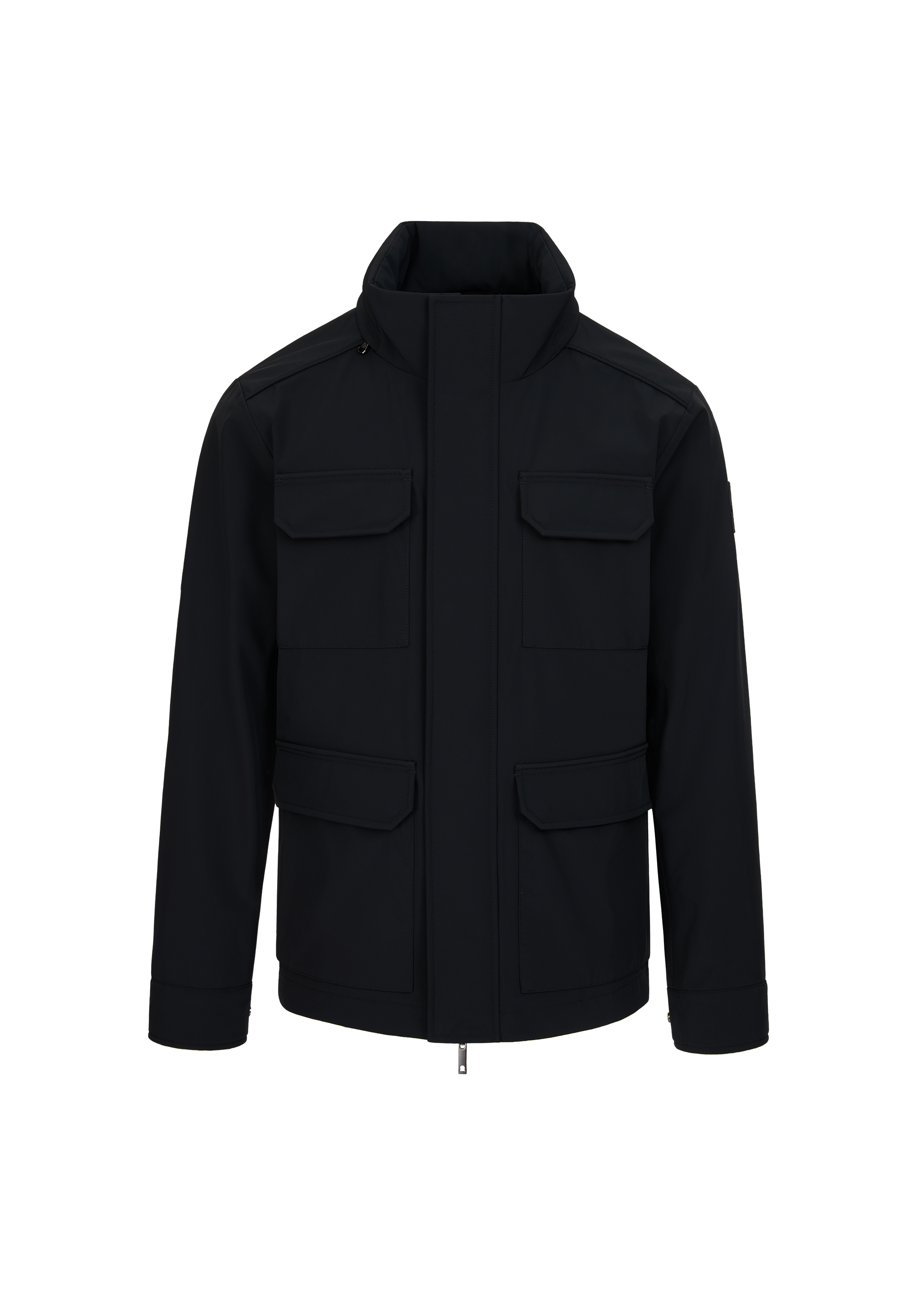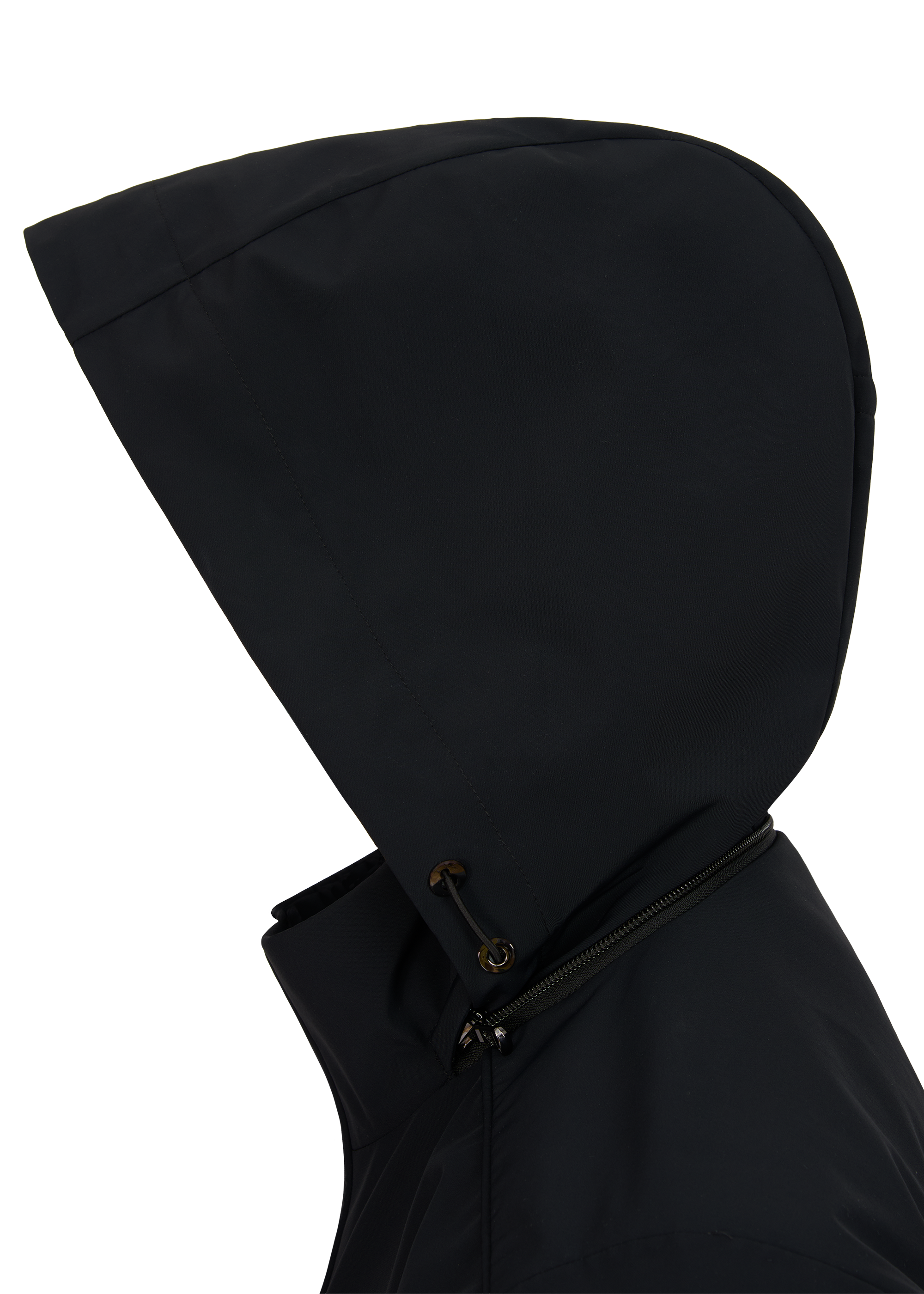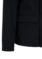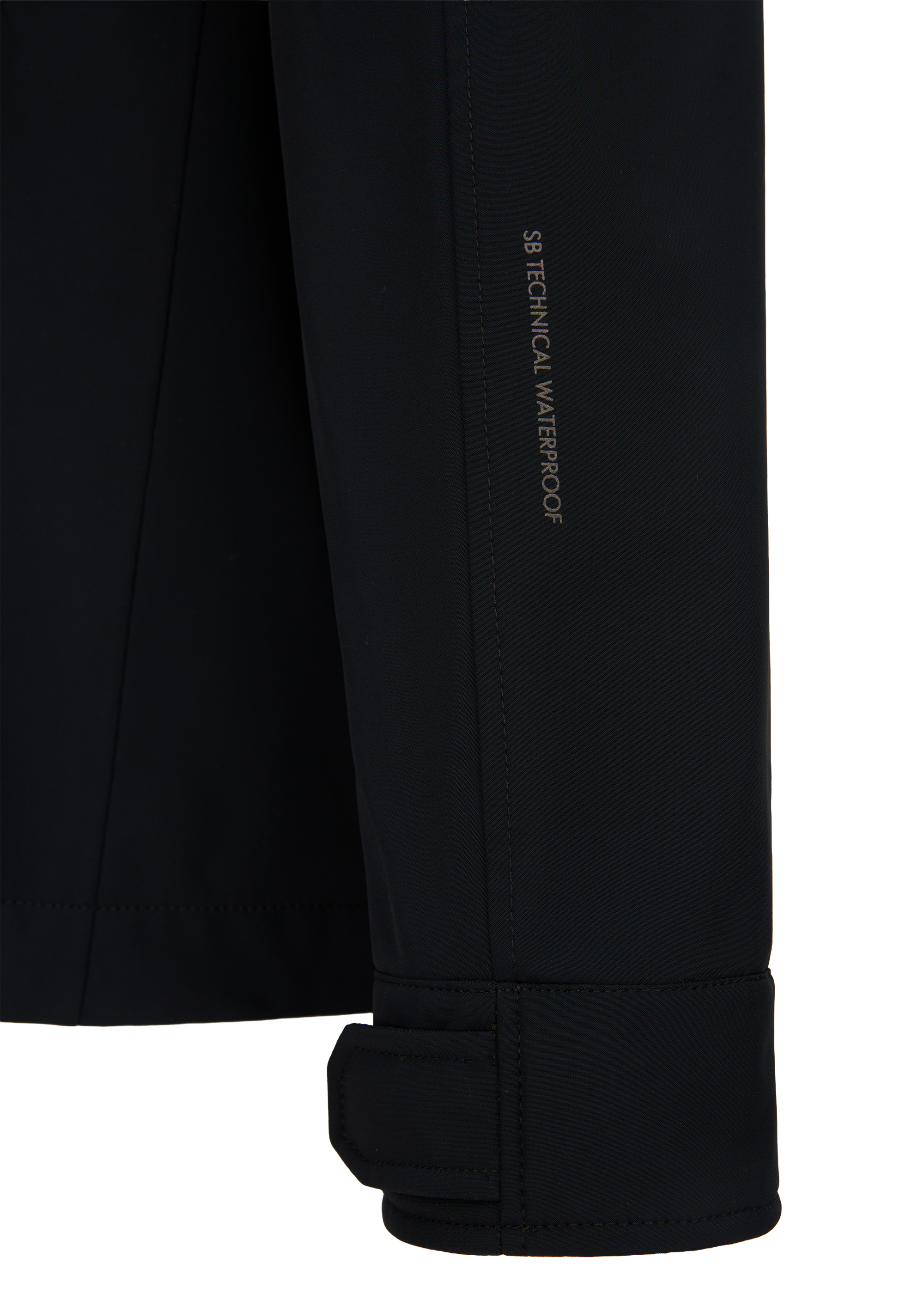 The Sandbanks Waterproof Field Jacket in black is engineered from a 180GSM waterproof shell with heat-bonded seams for dependable weather protection. The stowaway hood with elastic adjusters offers adaptable coverage, while a tonal airtex lining enhances breathability. Finished with fleece-lined pockets, adjustable cuffs, precision gunmetal hardware, and the signature Sandbanks embroidered sleeve badge.