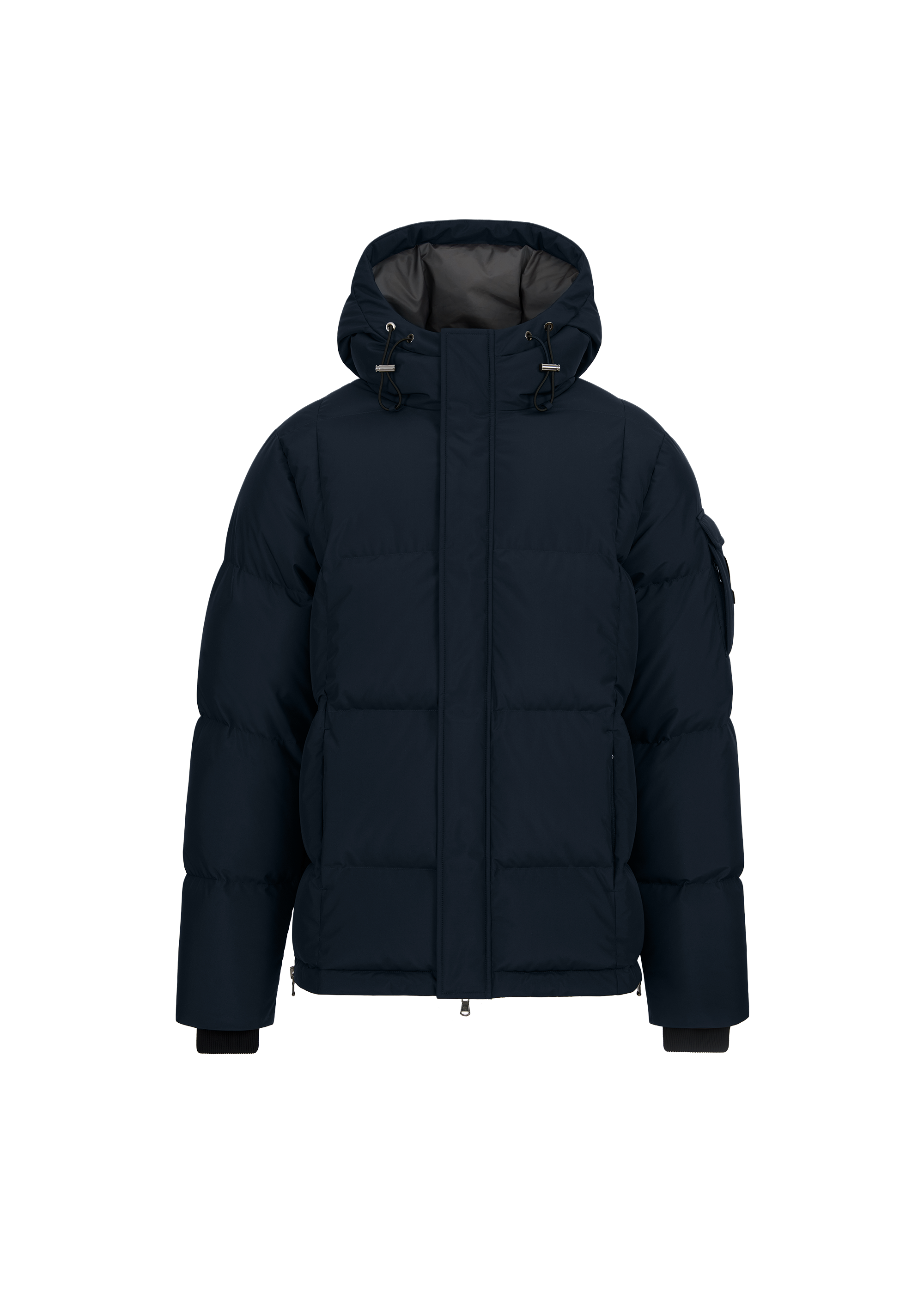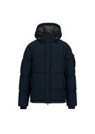 The Sandbanks Alpha Puffer Jacket in navy. A modern take on the classic puffer, designed with wide baffles to provide elevated warmth and a streamlined silhouette. Features include a sleeve pocket detailed with an embroidered Sandbanks badge, an integrated hood with cord adjusters, and concealed zip pockets lined with Polartec® fleece for superior comfort and protection.