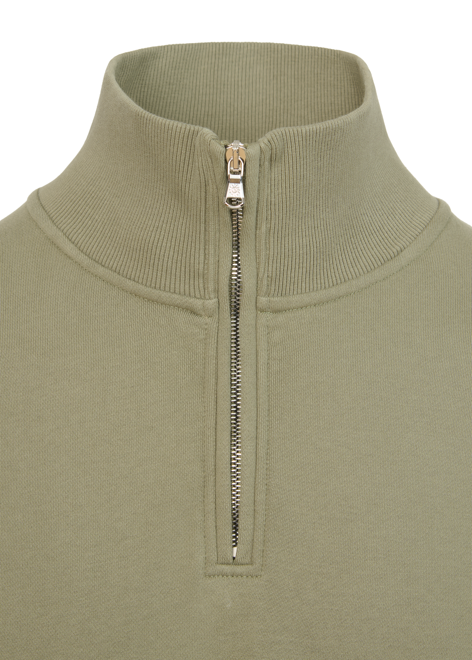 Sandbanks badge logo quarter zip sweatshirt in army, made from a 400gsm diagonal knitted 100% BCI cotton fabric that features a slight brushed back for a superior soft feeling and warmth, whilst remaining breathable. This quarter zip sweatshirt features a Lampo metal zip in silver with a ribbed neck.