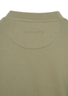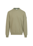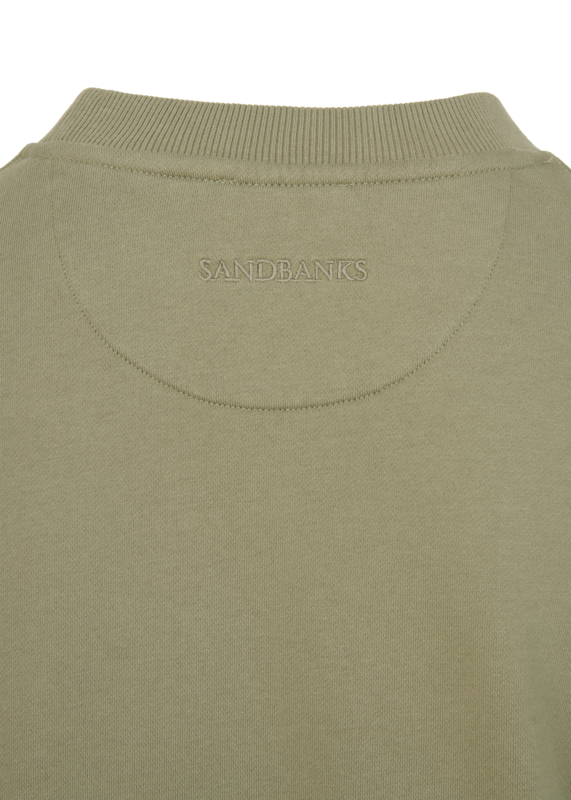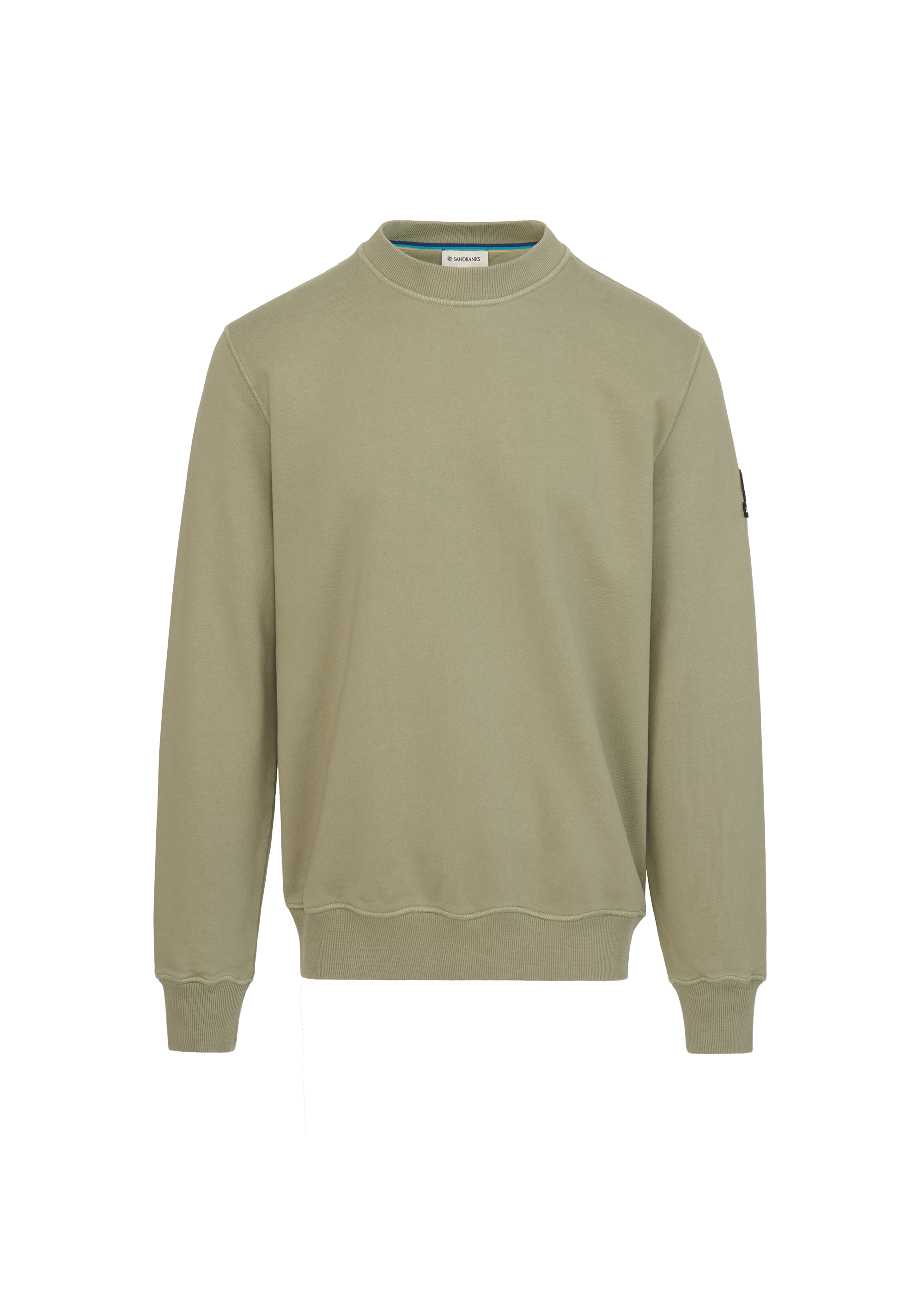 Sandbanks badge logo sweatshirt in army. This garment has been upgraded with a 400gsm diagonal knitted fabric that features a slight brushed back for a superior soft feeling and warmth, whilst remaining breathable. Made from 100% BCI Cotton with a sleeve embroidered badge logo and cover stitch details.