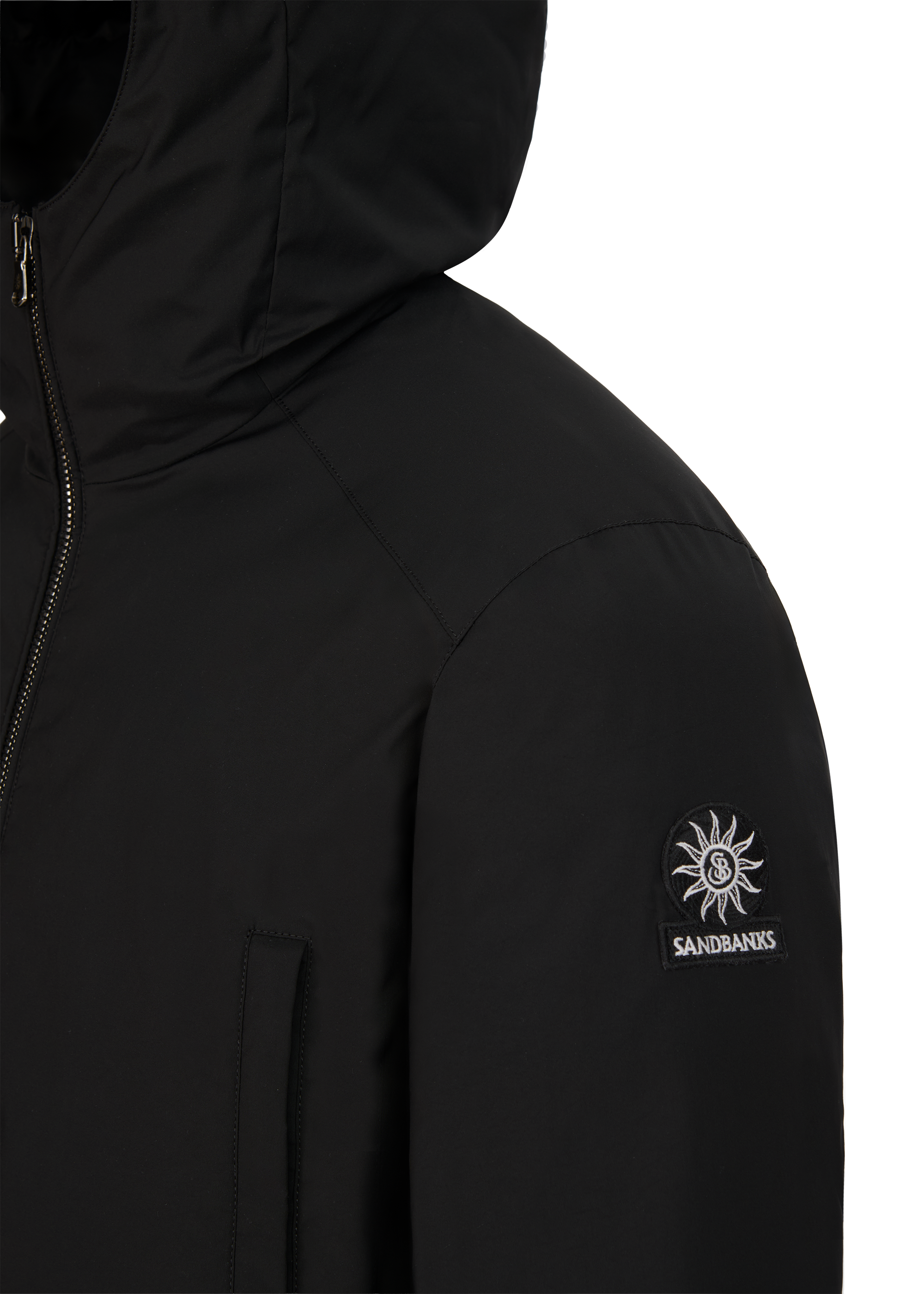 The Sandbanks Canford Terrace Jacket is engineered for performance and comfort in changing conditions. Crafted from a water-resistant shell, it offers protection from light rain and wind while remaining lightweight and easy to layer. The design features an A-line silhouette, two-way metal Lampo zip with metal pullers a high collar with a concealed hood adjuster for added coverage. Eco-down insulation ensures warmth with minimal weight, while the versatile 4 front zip pockets benefit from fleece lining to provide extra comfort. Finished with engraved metal components and an embroidered Sandbanks sleeve badge.