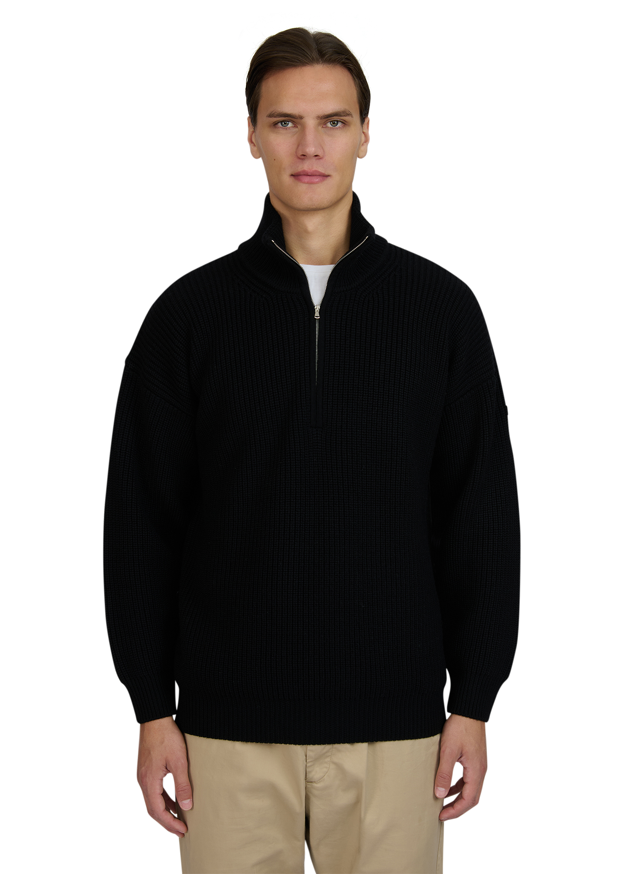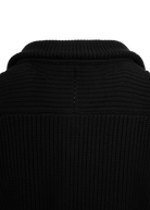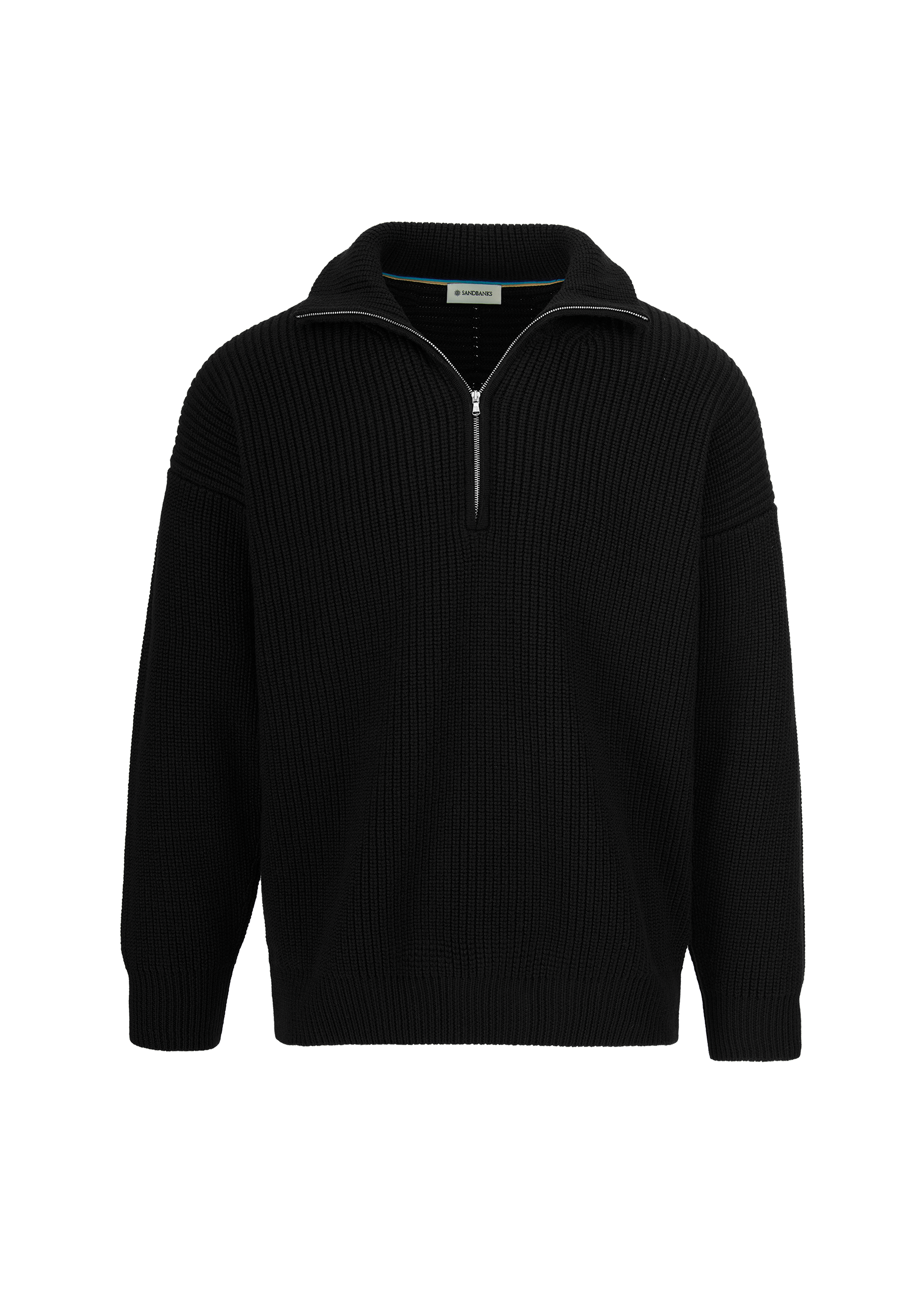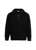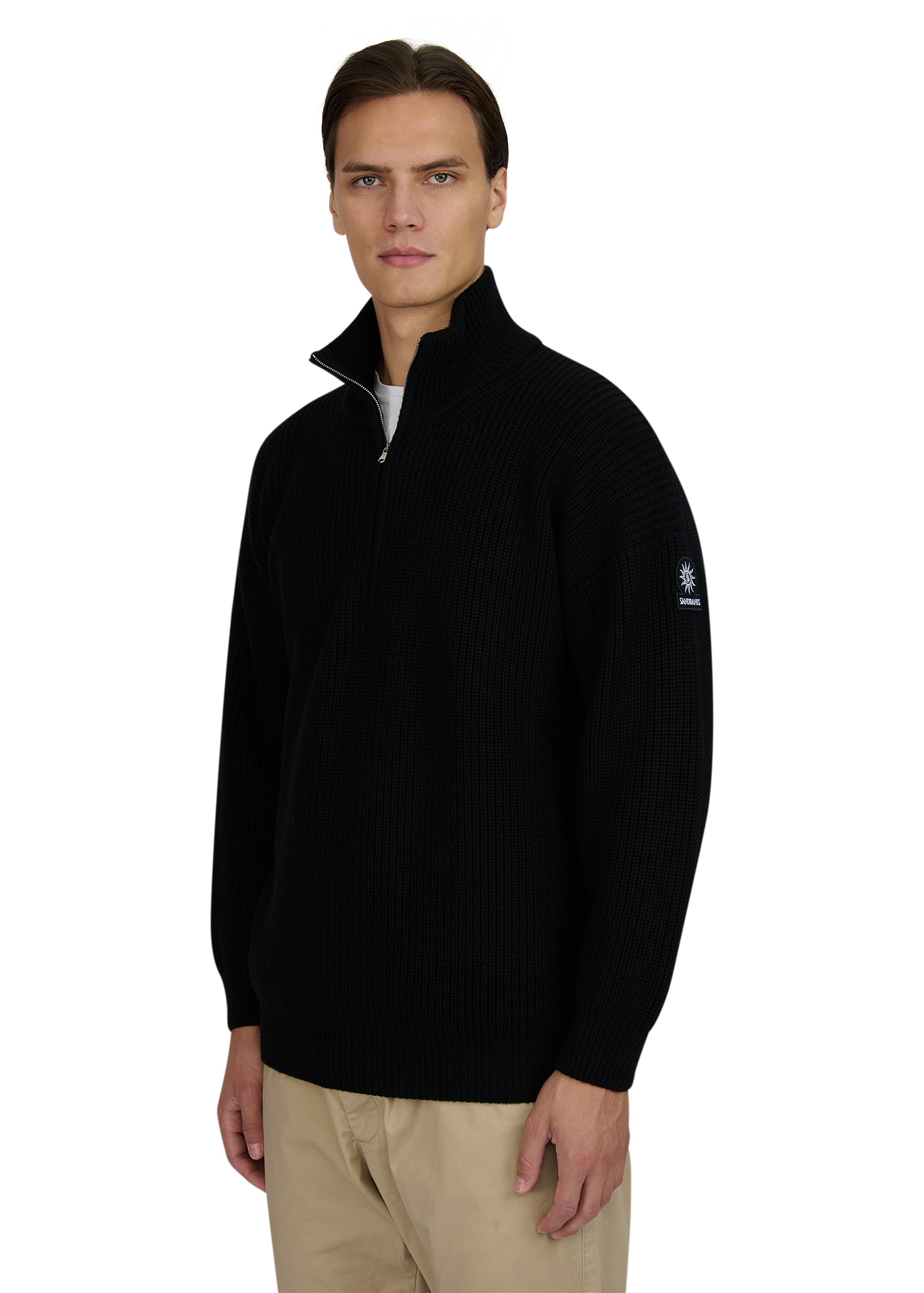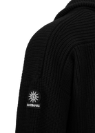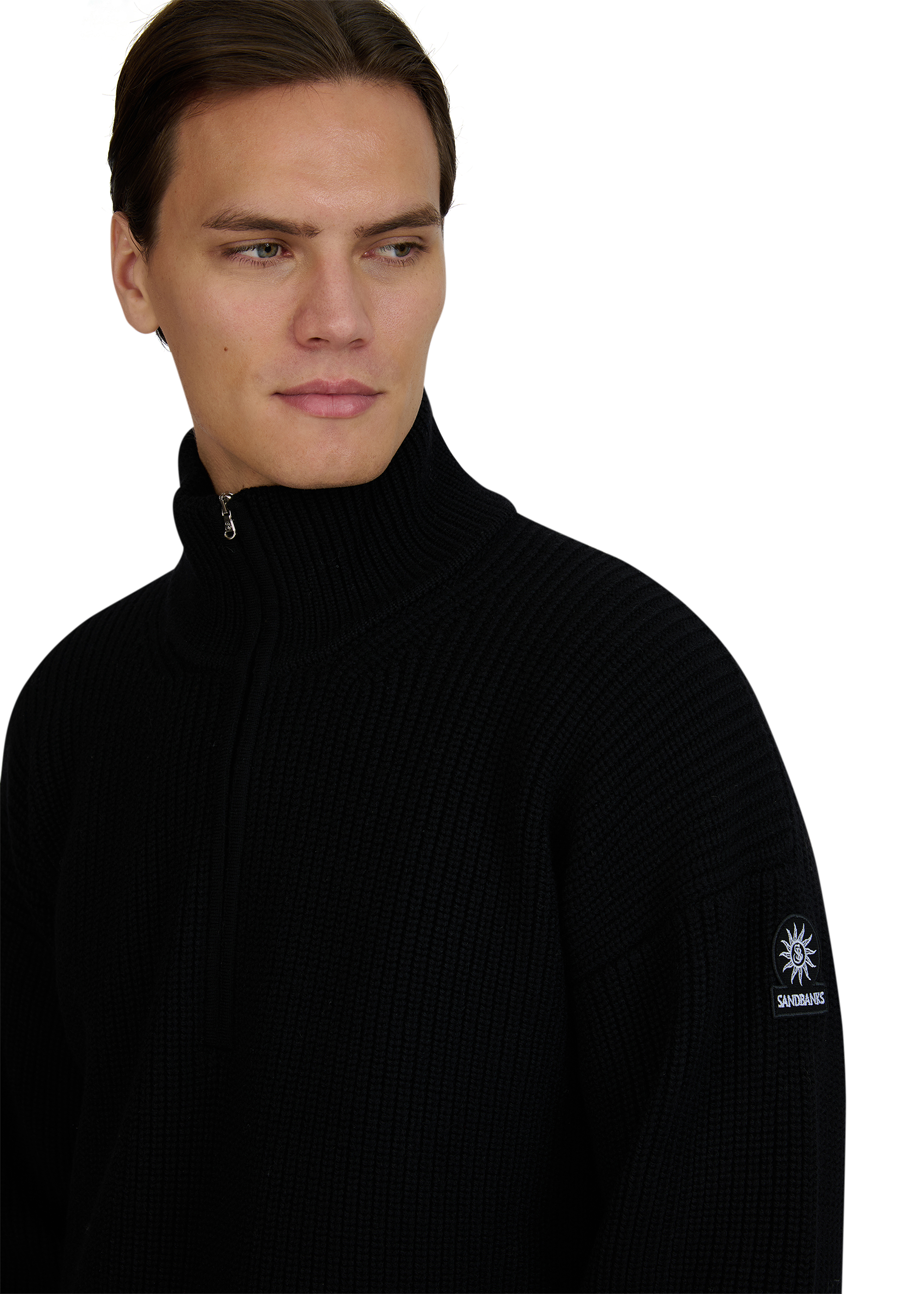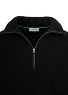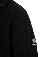 Sandbanks chunky knit quarter zip in black, made from a 100% merino wool for a superior soft feeling and warmth, whilst remaining breathable. This quarter zip knitted jumper features a Lampo metal zip in silver with a ribbed collar, cuff and hem. Finished with the Sandbanks signature badge embroidered onto the sleeve.