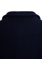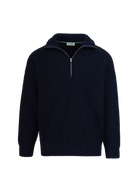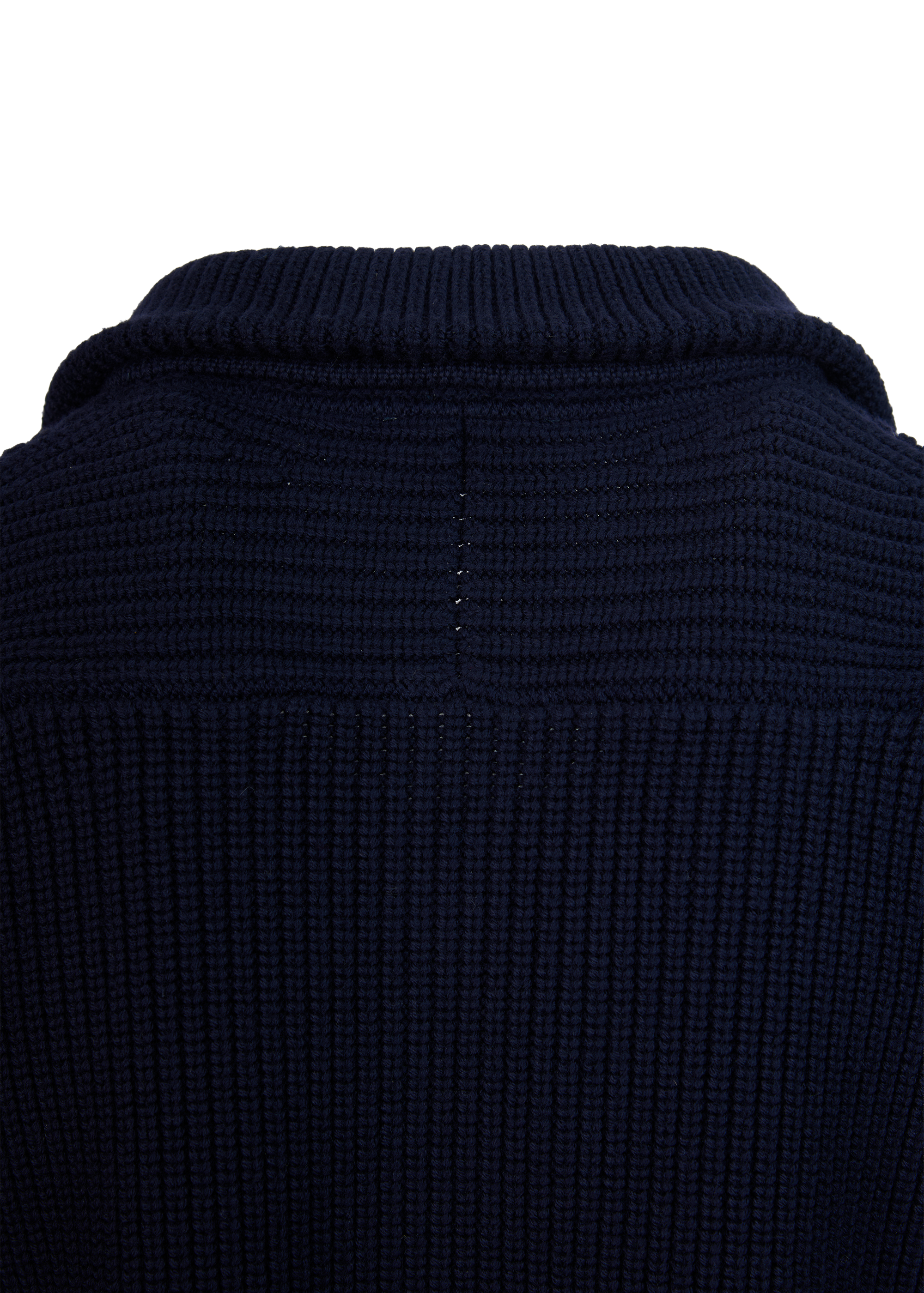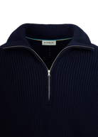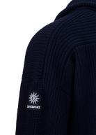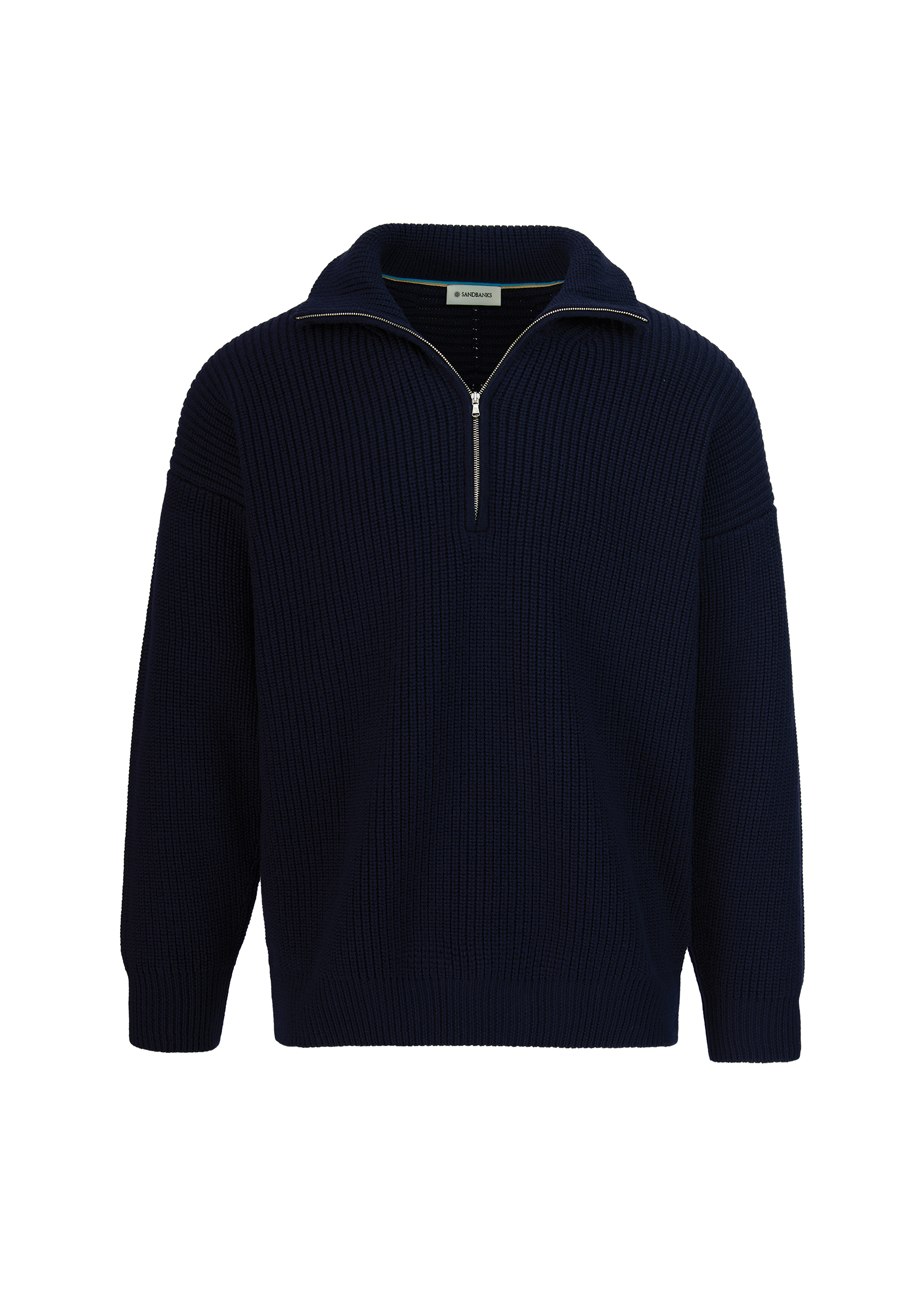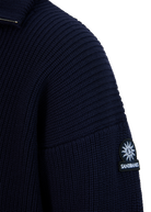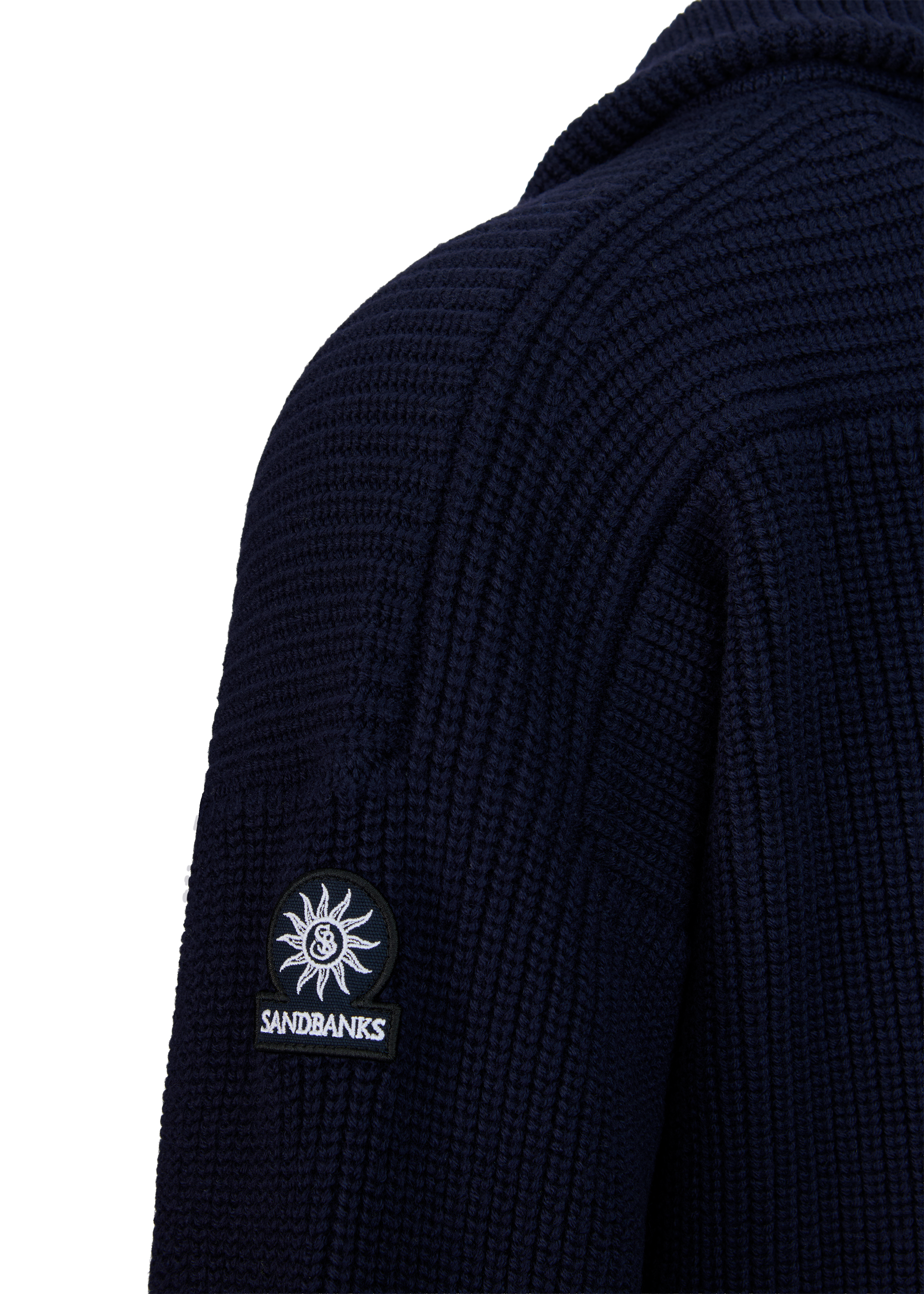 Sandbanks chunky knit quarter zip in navy. made from a 100% merino wool for a superior soft feeling and warmth, whilst remaining breathable. This quarter zip knitted jumper features a Lampo metal zip in silver with a ribbed collar, cuff and hem. Finished with the Sandbanks signature badge embroidered onto the sleeve.