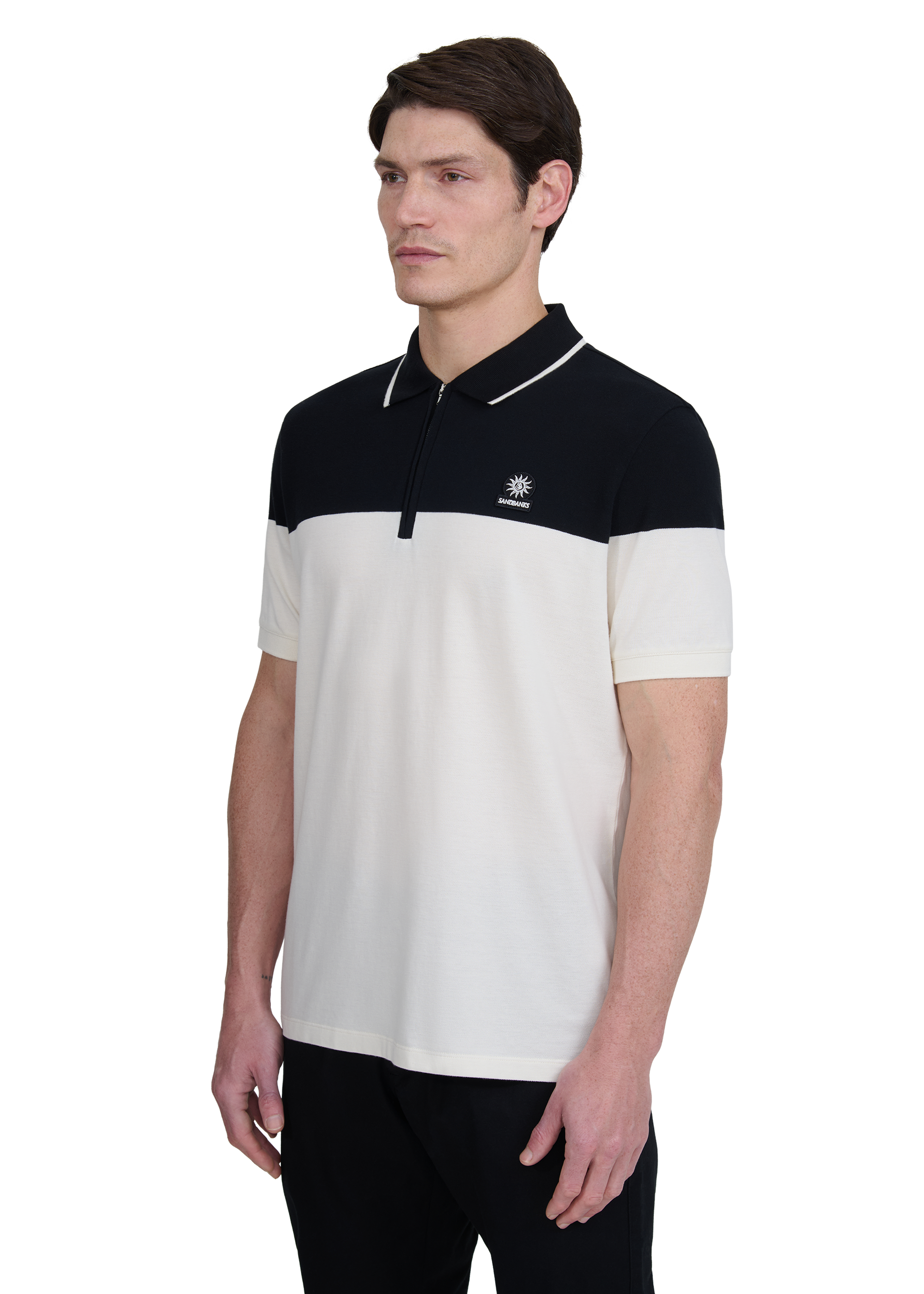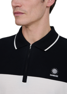 The Sandbanks colour block zip polo shirt in ecru/black is crafted from 100% cotton in a fine piqué weave. Cut in a classic fit, it features a knitted colour block design and a tipped ribbed collar, with a concealed metal Lampo zip and an embroidered logo badge.