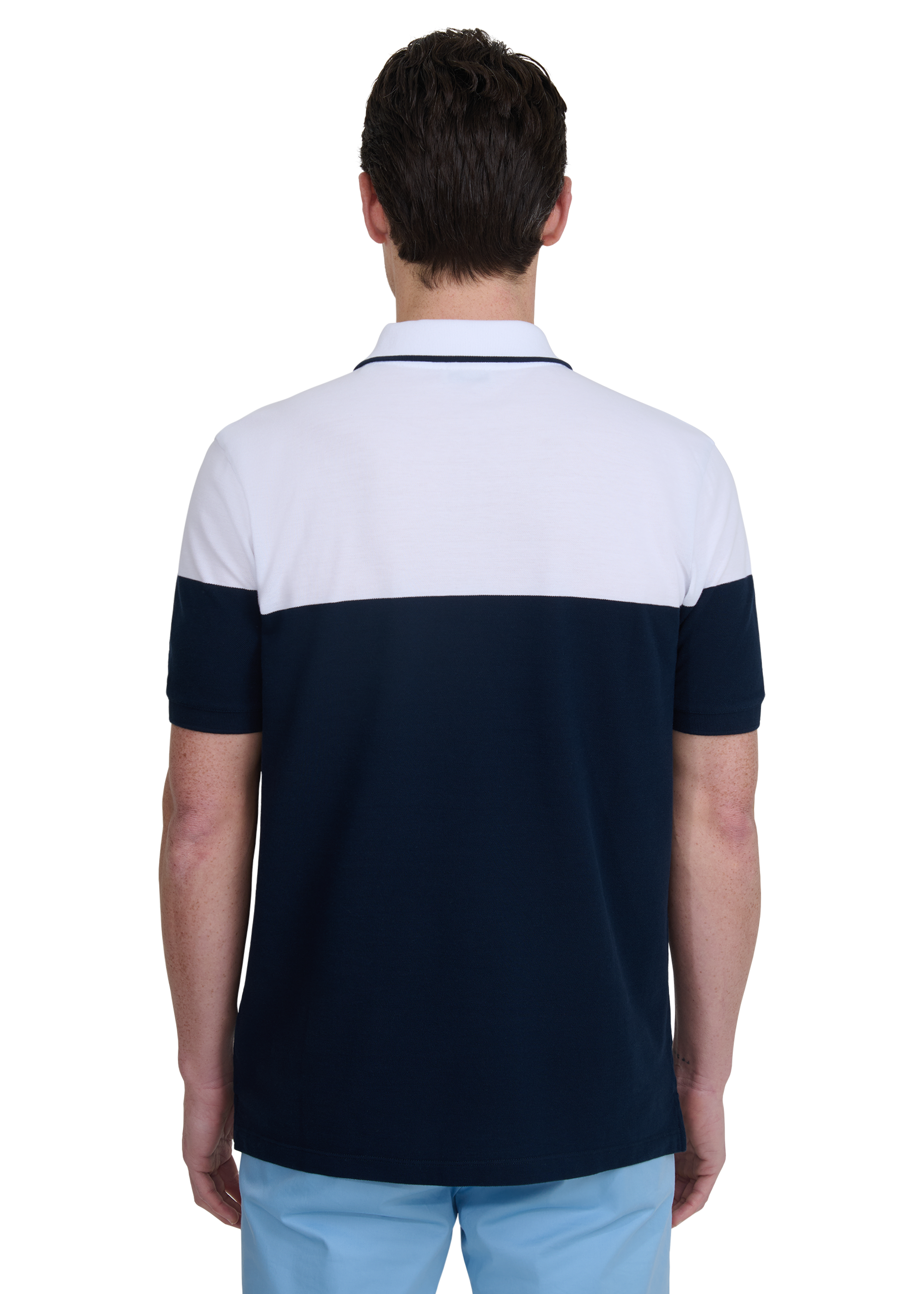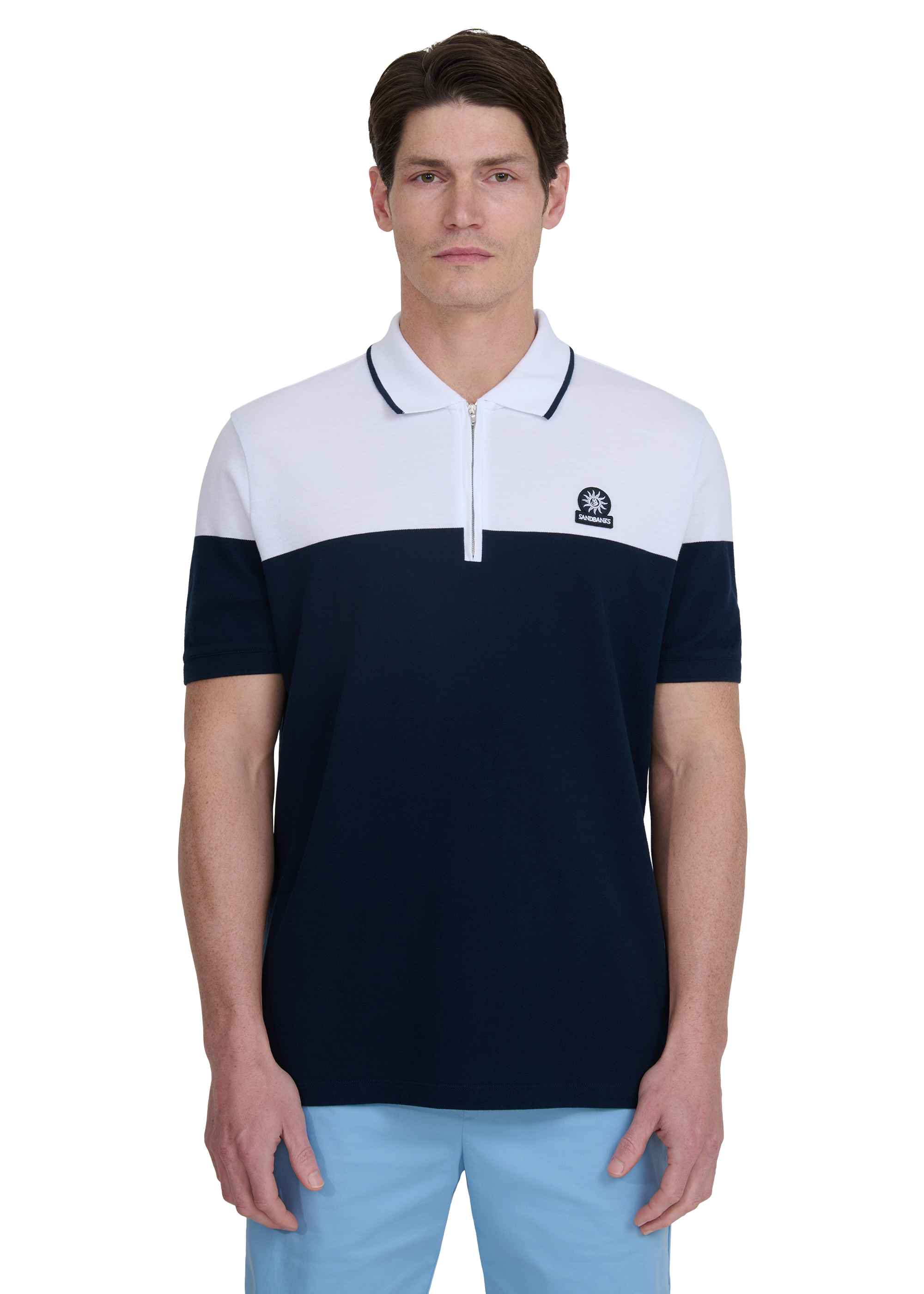 The Sandbanks colour block zip polo shirt in navy/white is crafted from 100% cotton in a fine piqué weave. Cut in a classic fit, it features a knitted colour block design and a tipped ribbed collar, with a concealed metal Lampo zip and an embroidered logo badge.